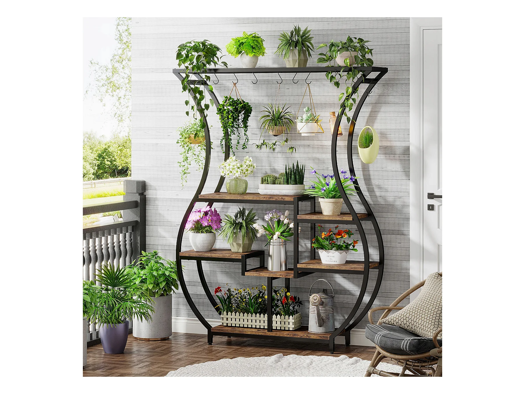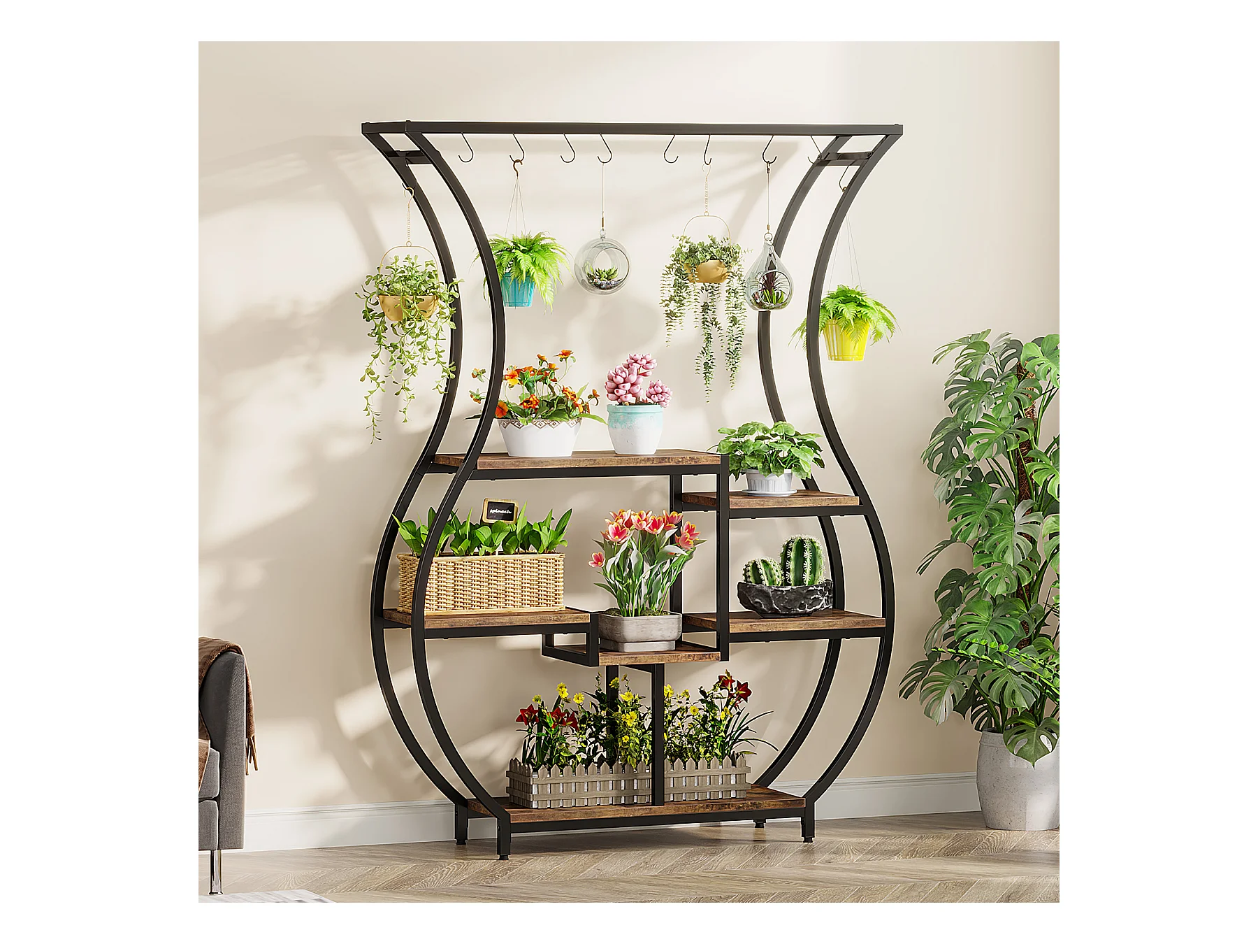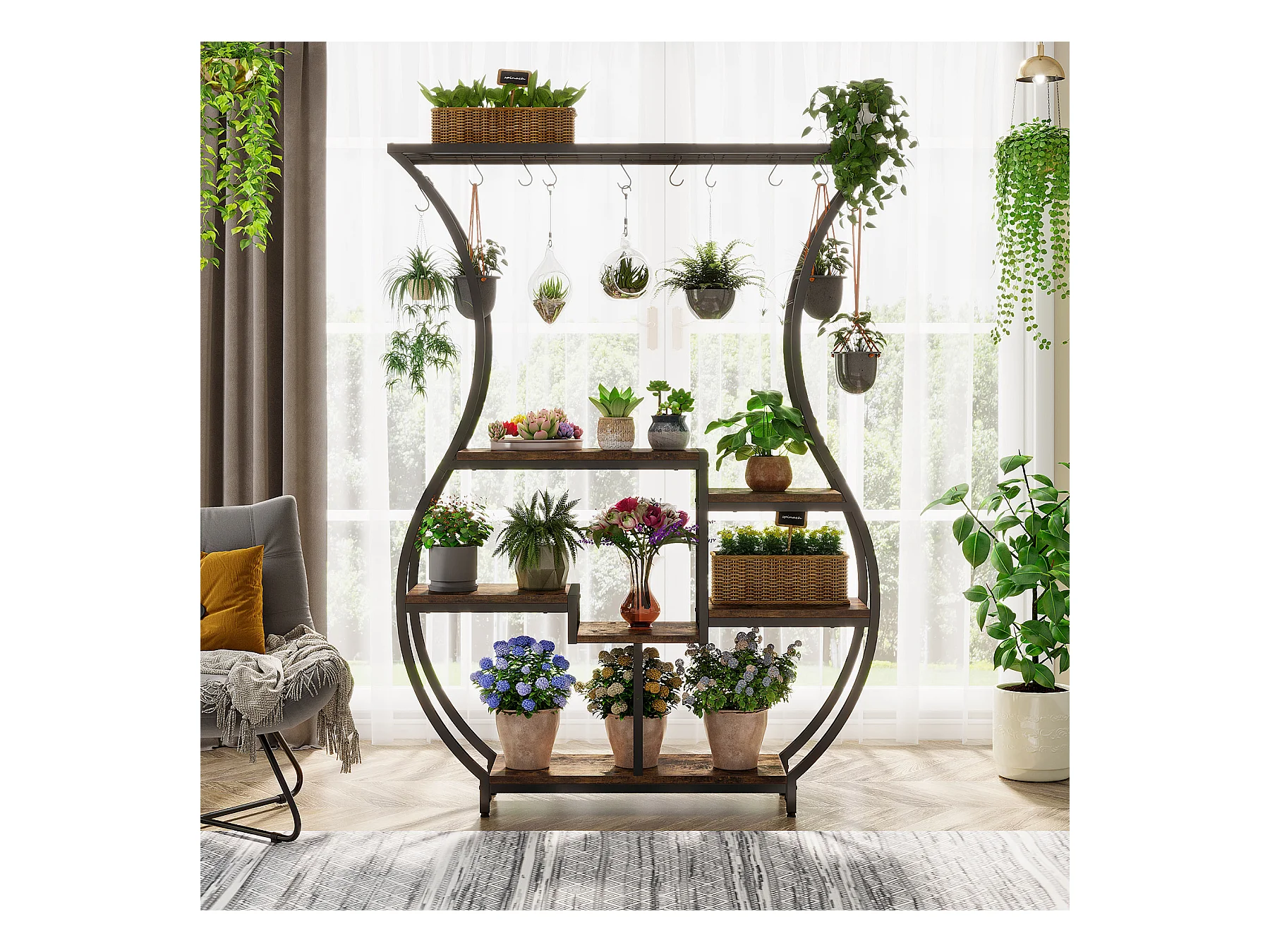 Support de plantes d'intérieur 6 étages pour 7 pots de fleurs, 180 cm, Étagère pour plantes en métal avec 10 crochets en S, - Brun Rustique