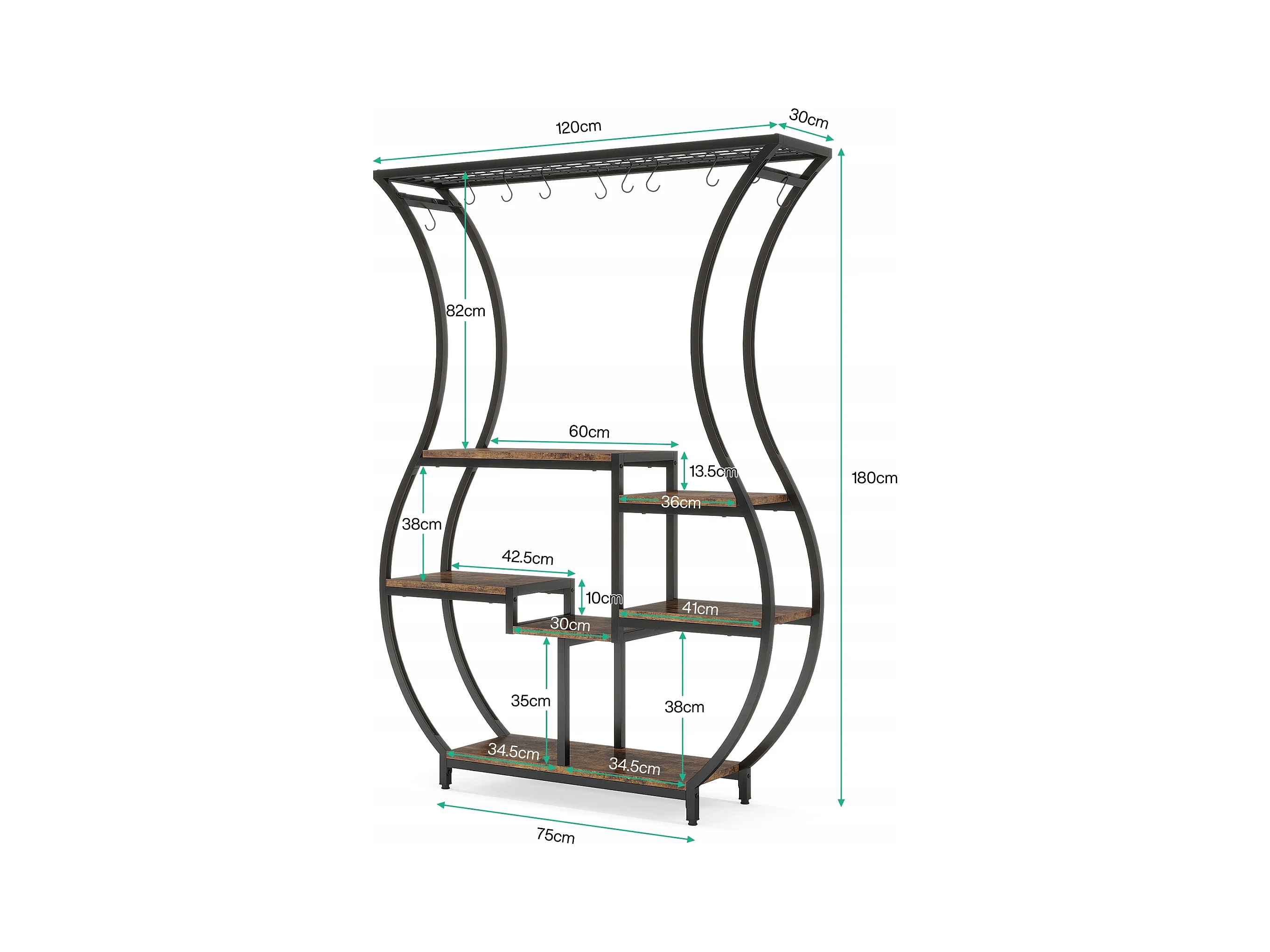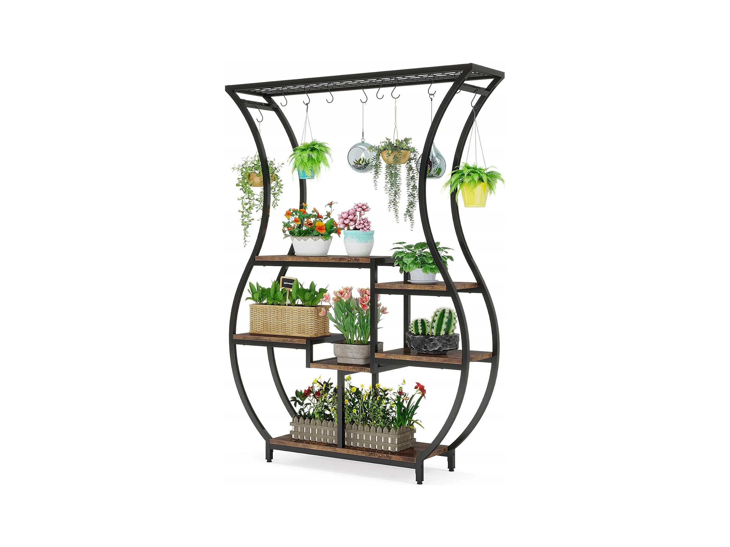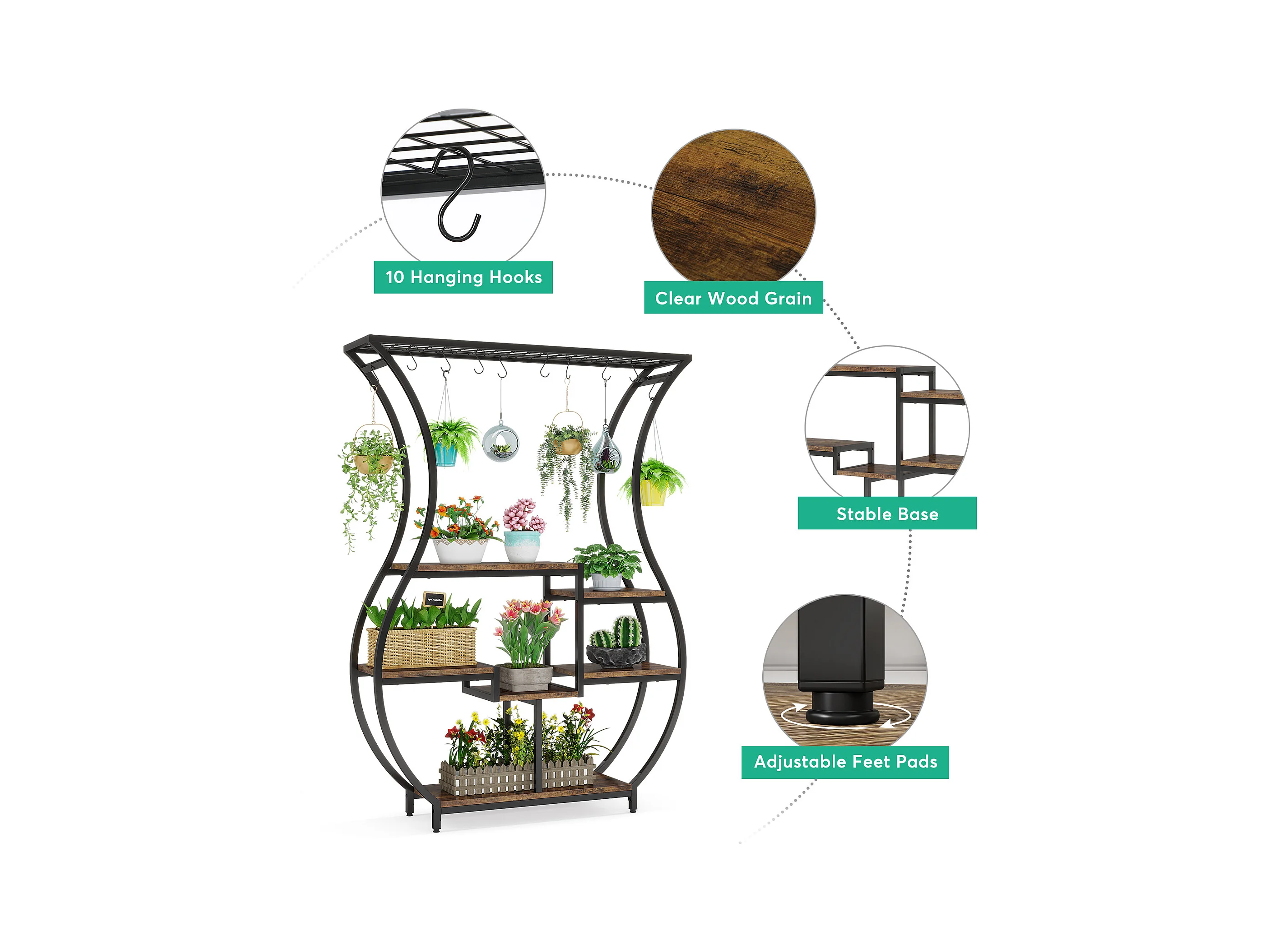 Support de plantes d'intérieur 6 étages pour 7 pots de fleurs, 180 cm, Étagère pour plantes en métal avec 10 crochets en S, - Brun Rustique
