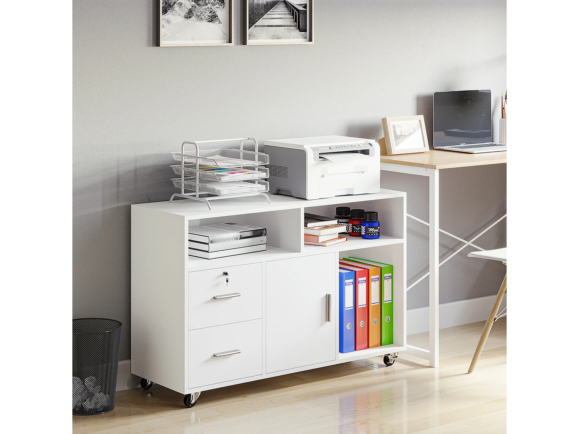 Support d'imprimante organiseur bureau caisson 2 portes avec étagère grand plateau panneaux particules blanc