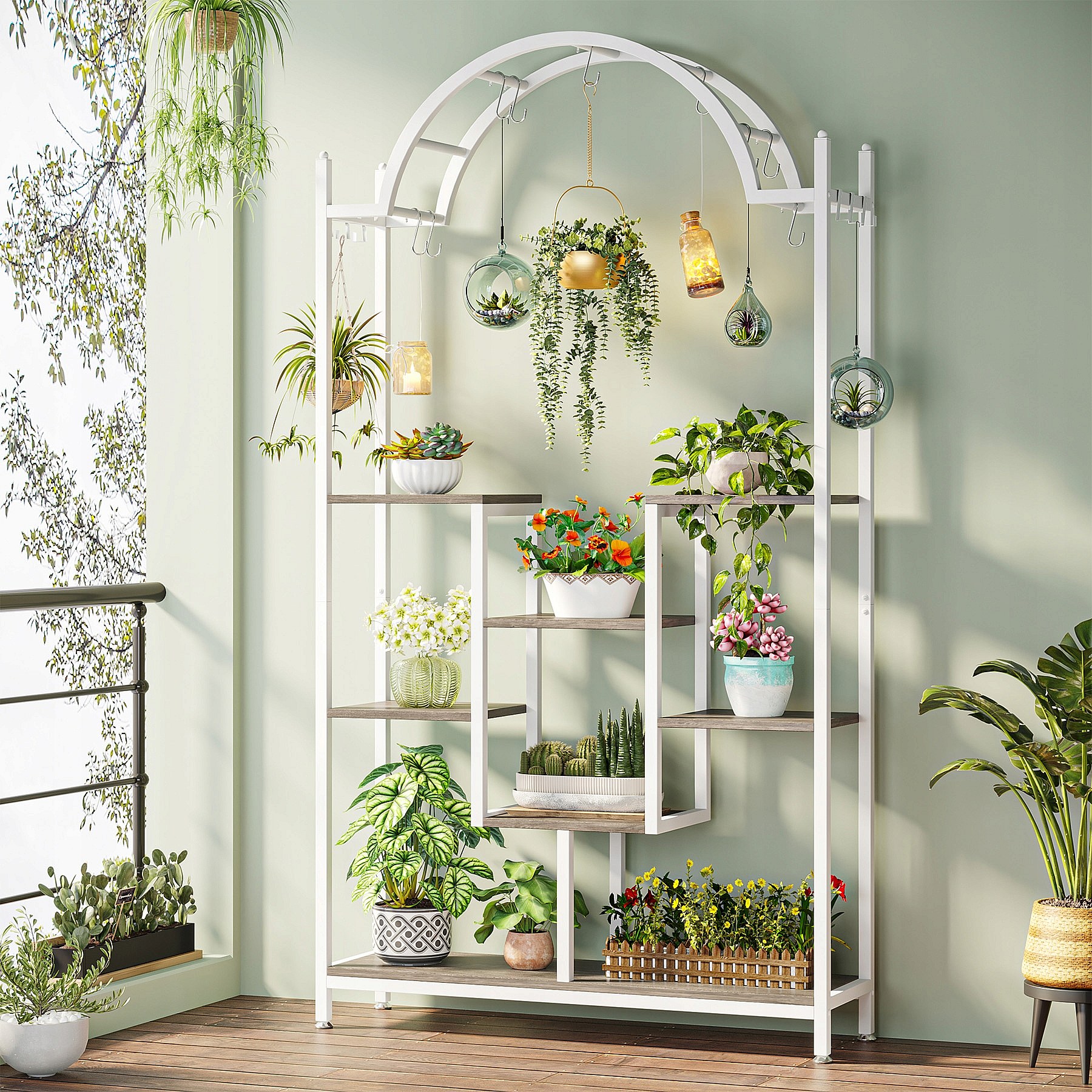 Support pour plantes d'intérieur à 5 niveaux - Étagère arquée en métal avec crochets de suspension, Blanc et gris