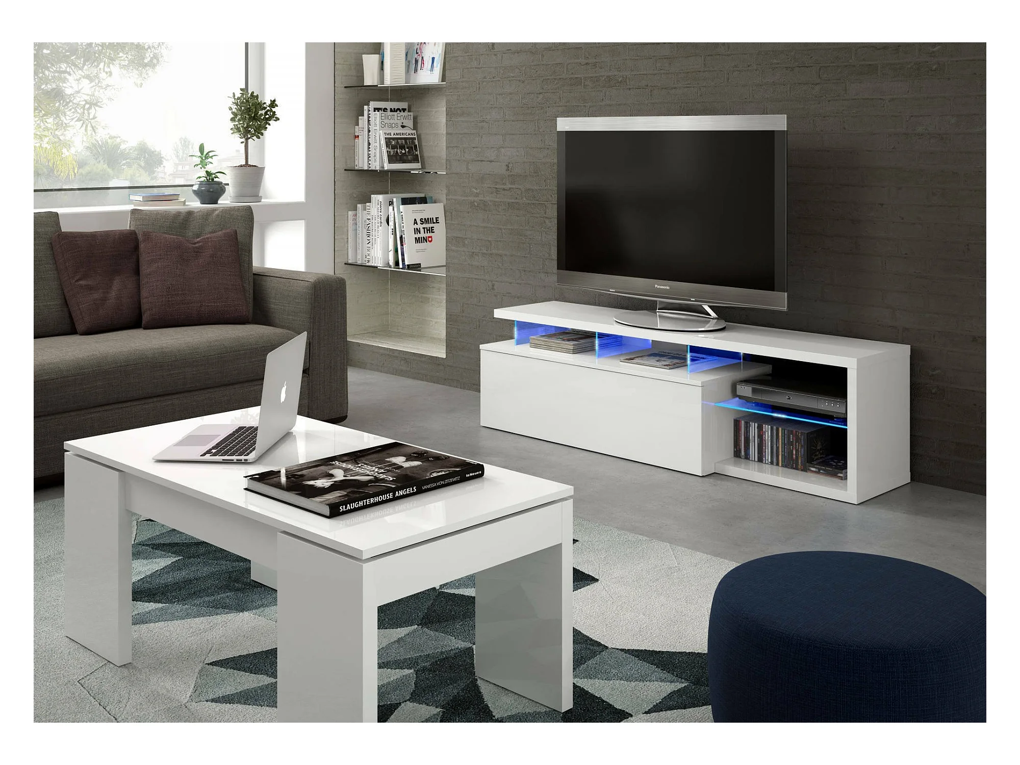 Meuble TV Dlupert, Buffet de salon, Buffet pour télévision de salon avec 1 porte, Meuble TV avec lumière LED, 150x41h50 cm, Blanc brillant