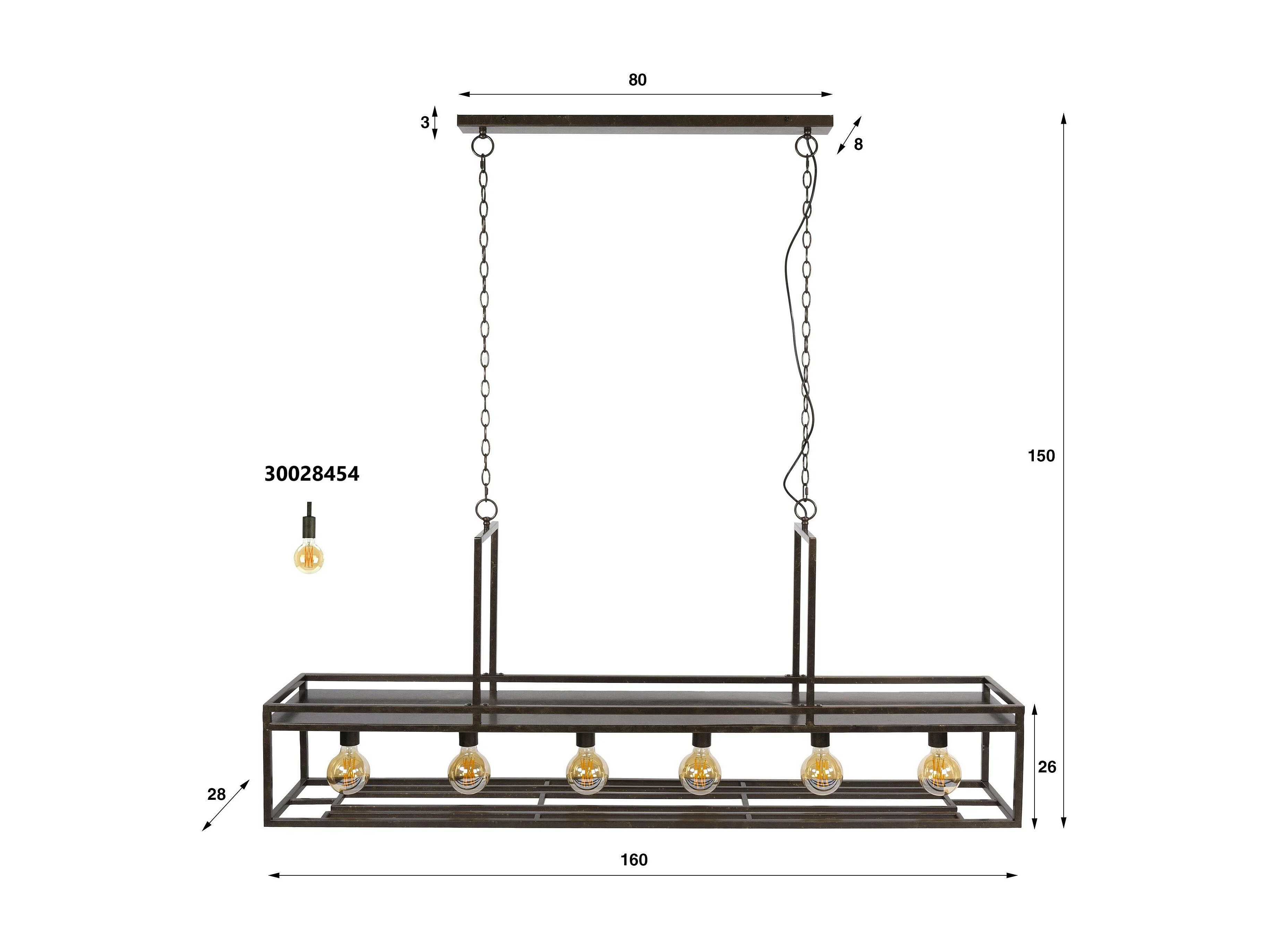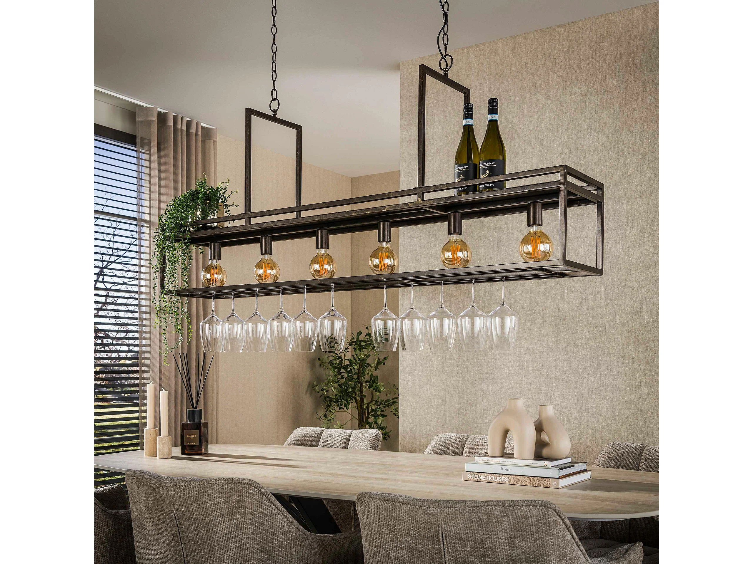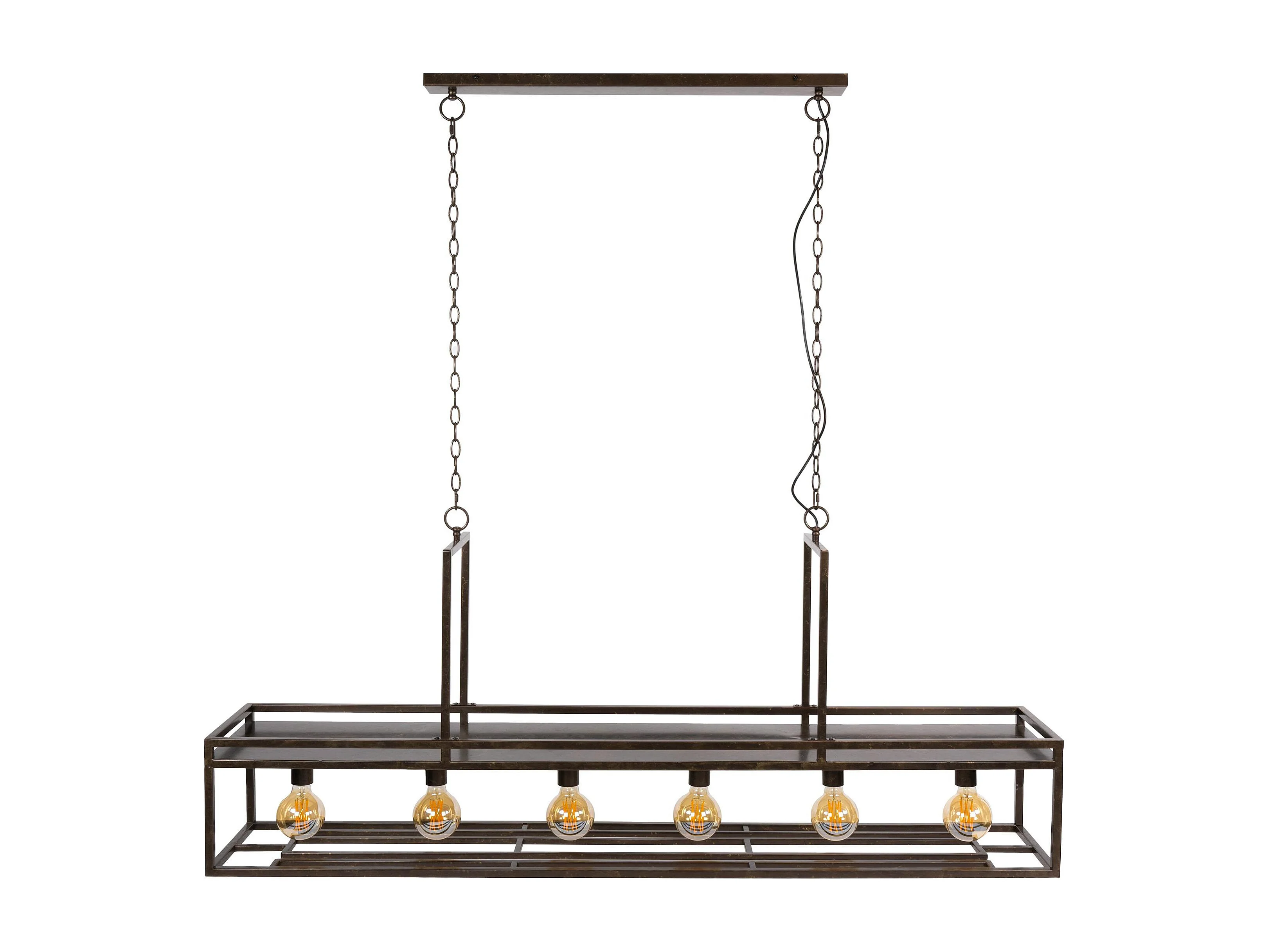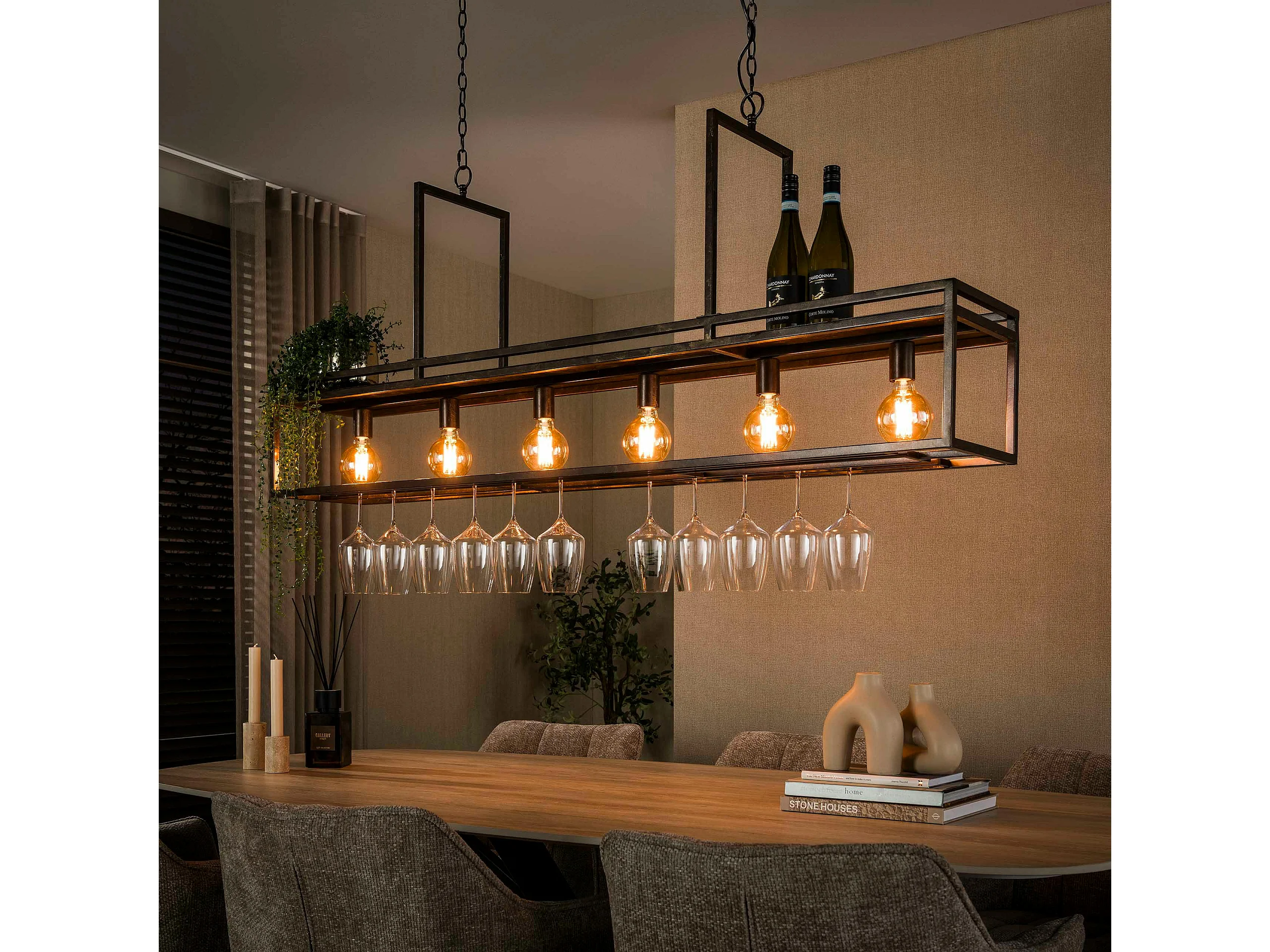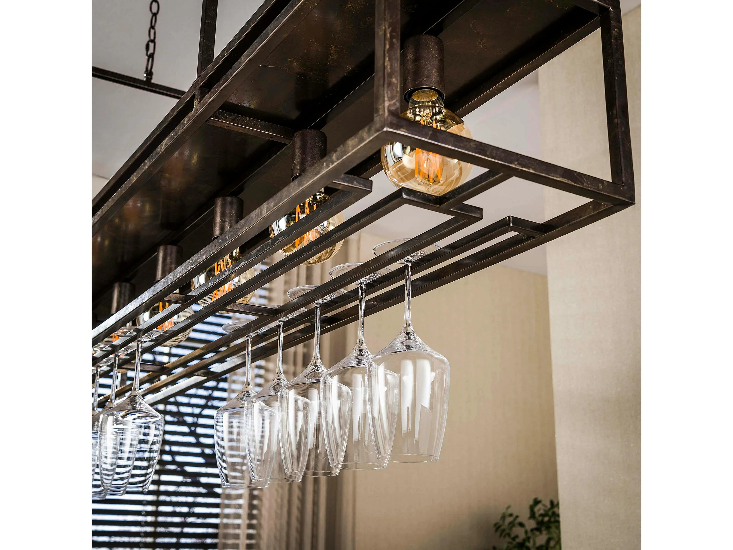 Suspension îlot cuisine métal brun avec support verres à pied 6 lampes RALF