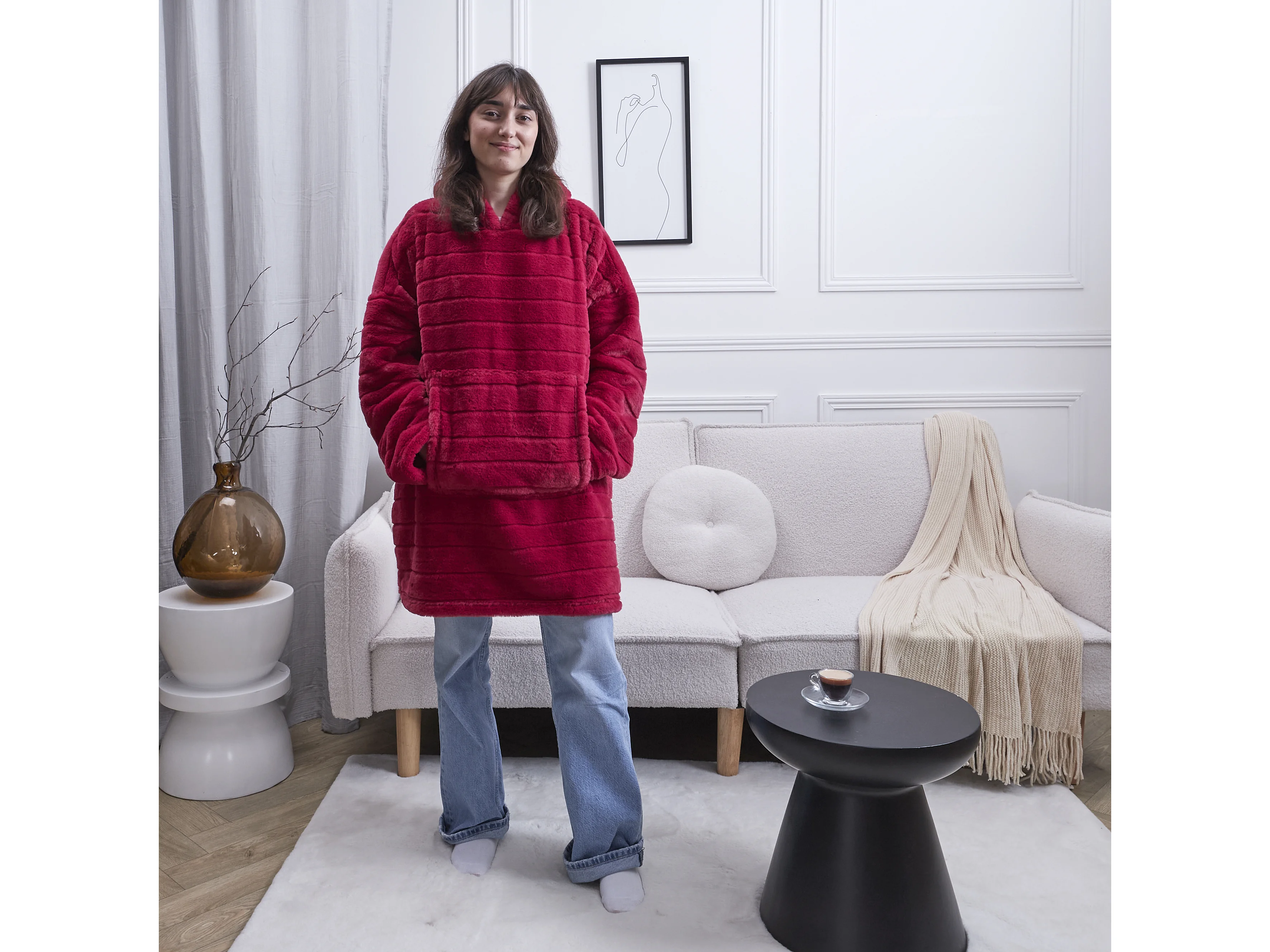 Sweat Plaid Fausse Fourrure Rouge, Blanc