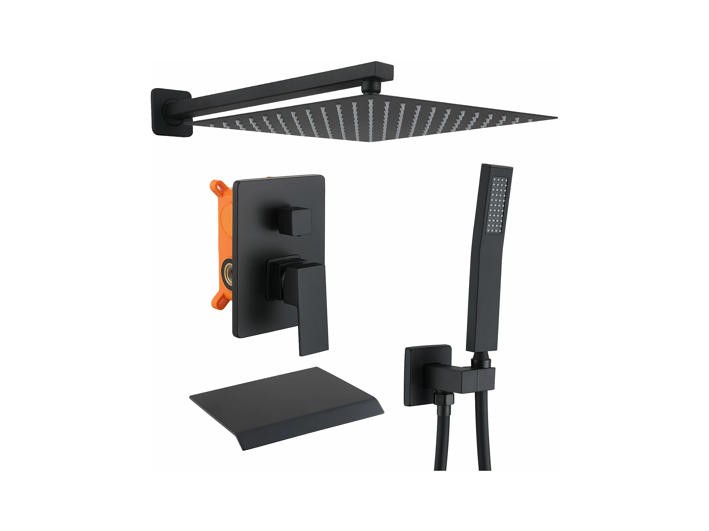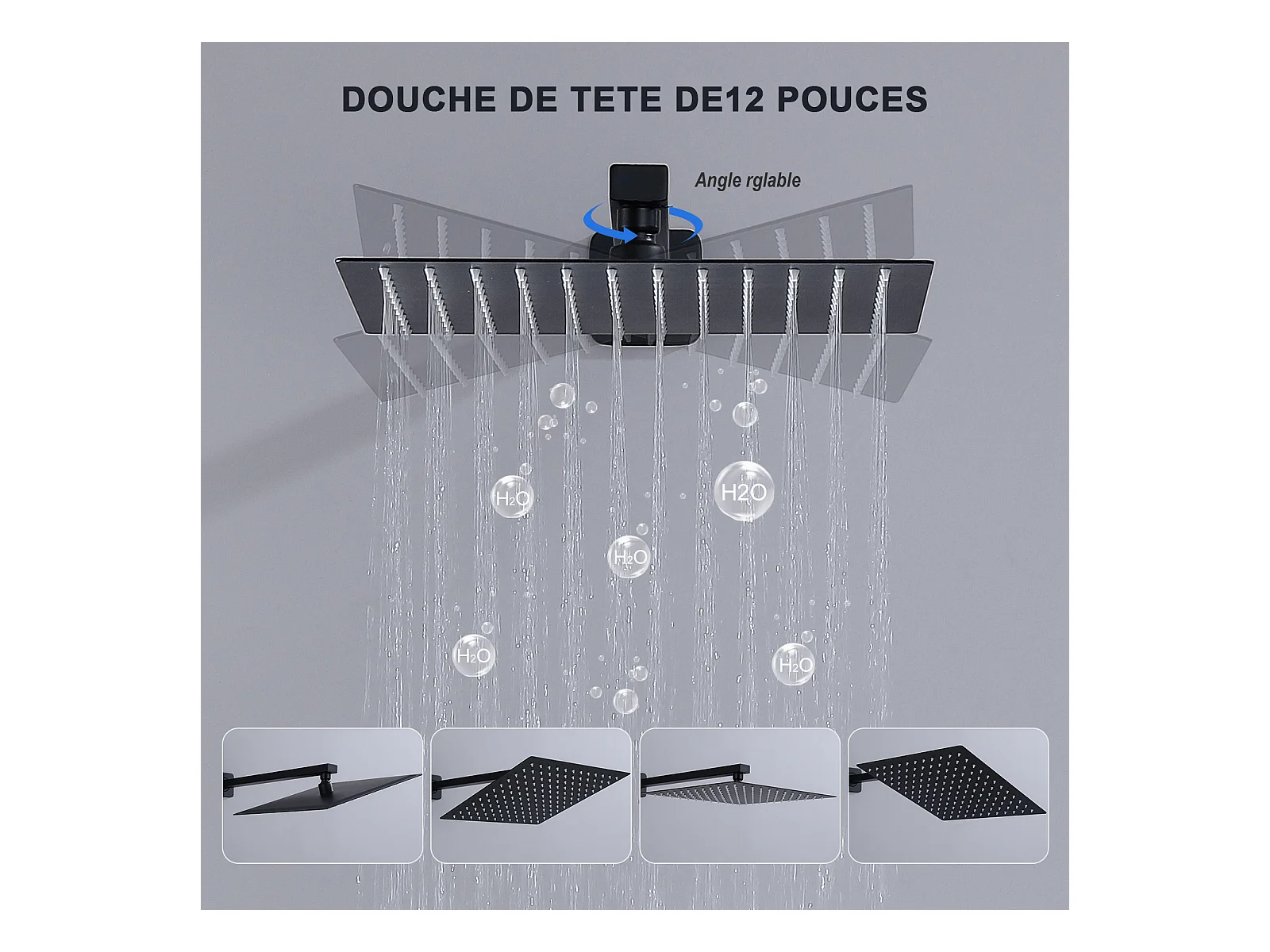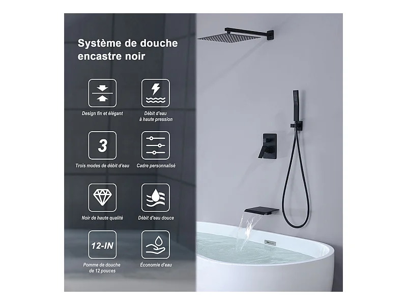 Colonne de Douche Encastrée Noir, Ensemble de Douche avec 12" Grande Tête et Bec Descendant en Cascade, Système de Douche Encastrable Corps en Laiton