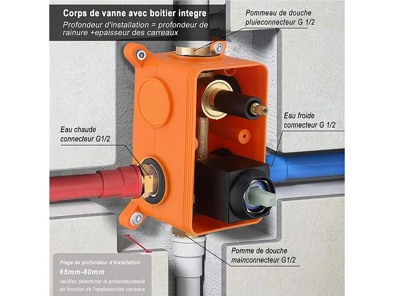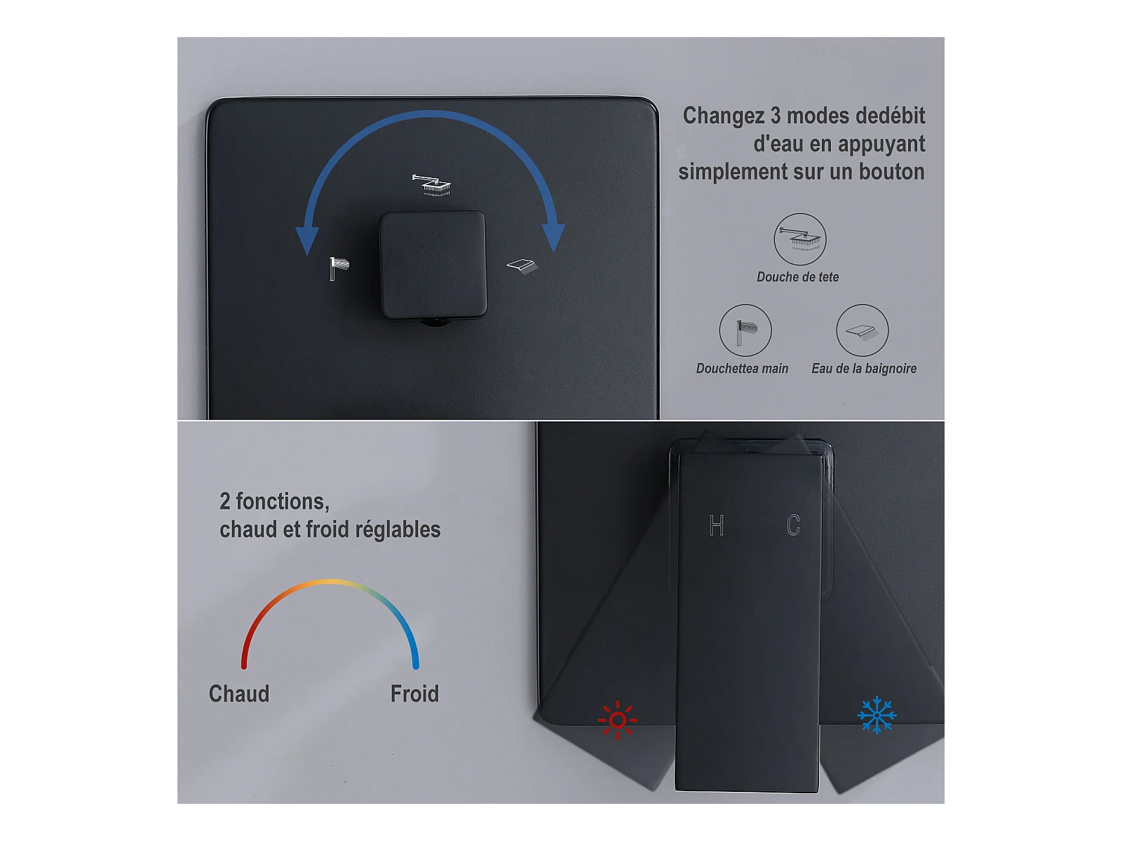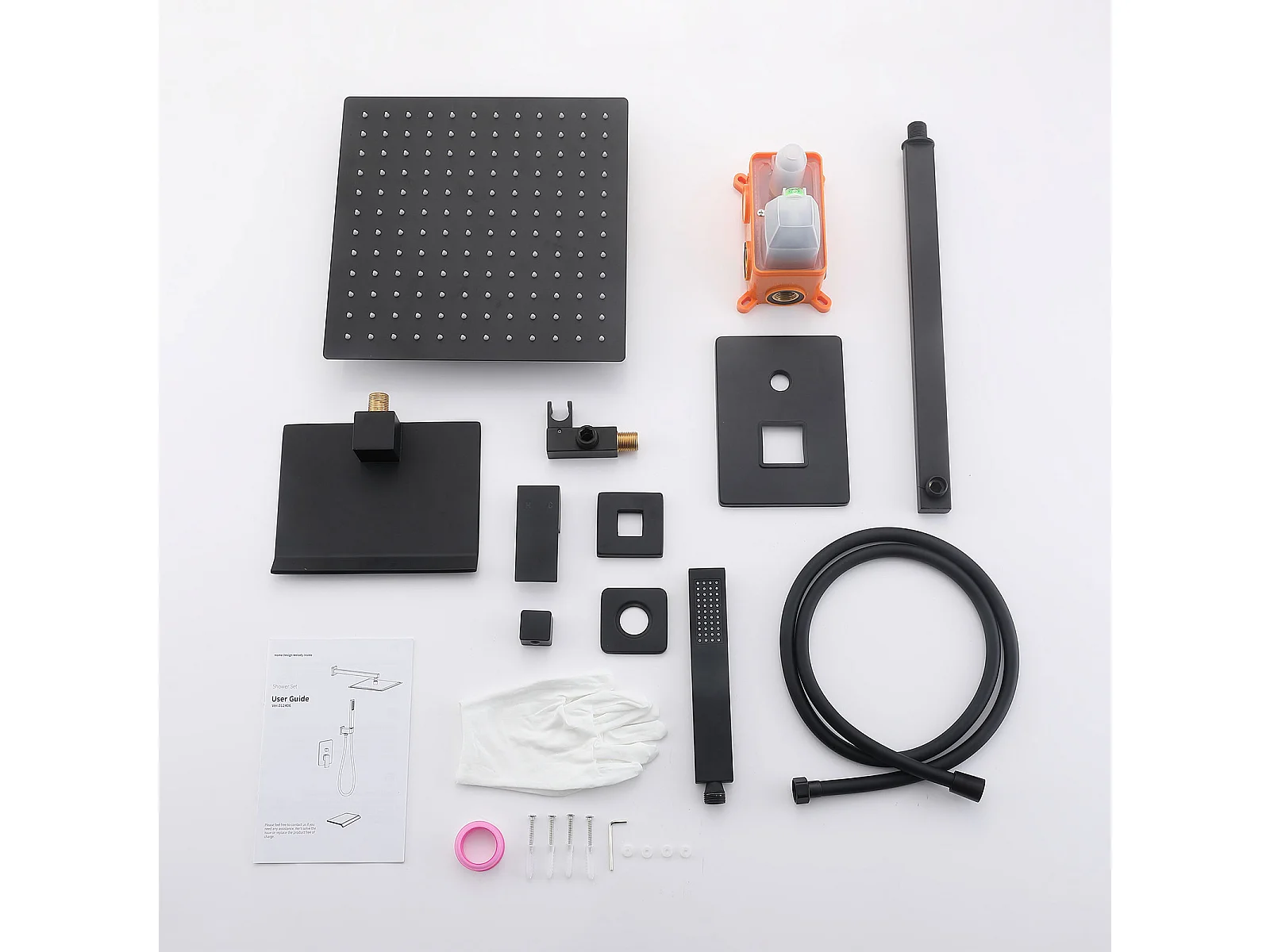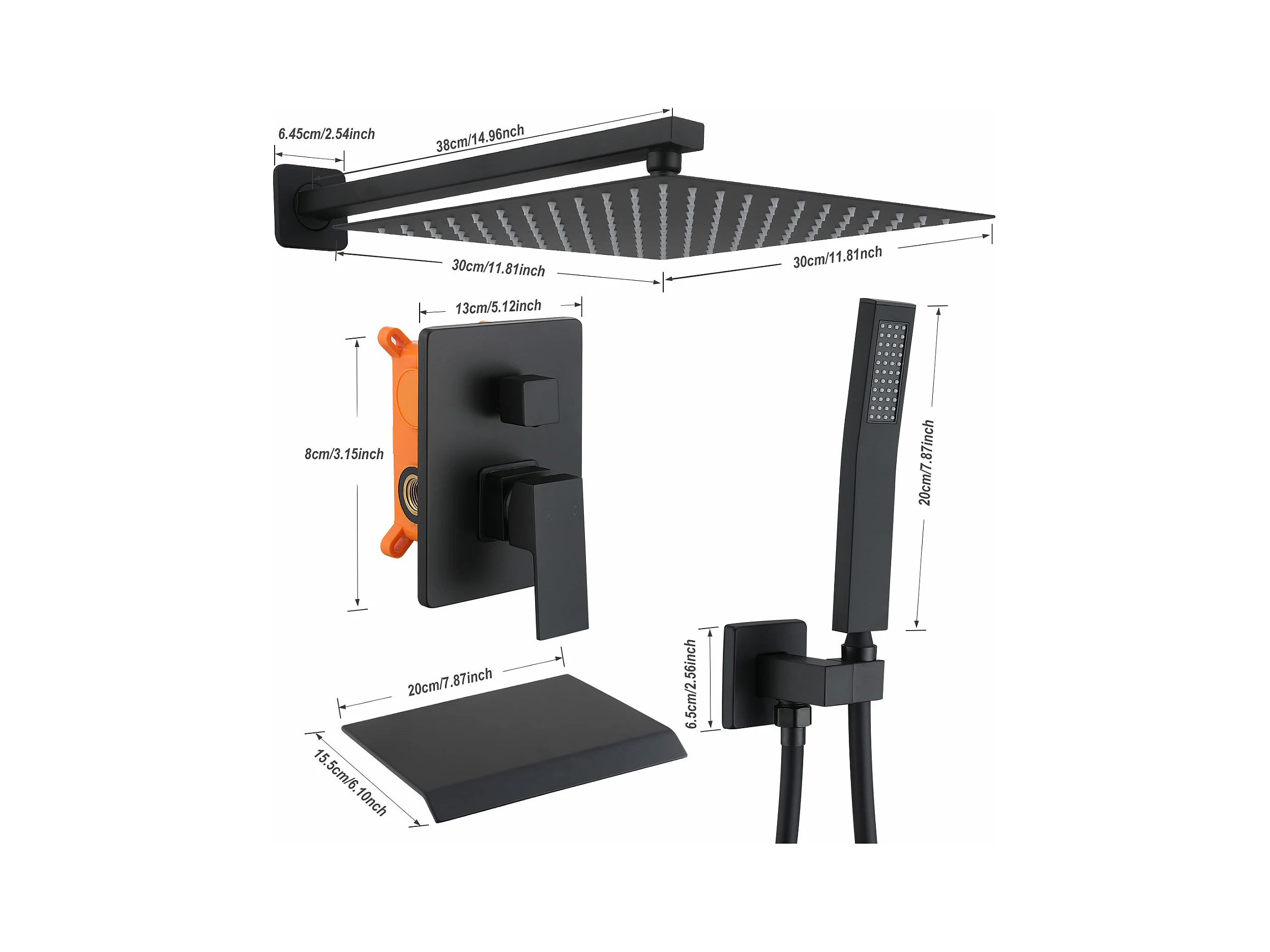 Colonne de Douche Encastrée Noir, Ensemble de Douche avec 12" Grande Tête et Bec Descendant en Cascade, Système de Douche Encastrable Corps en Laiton