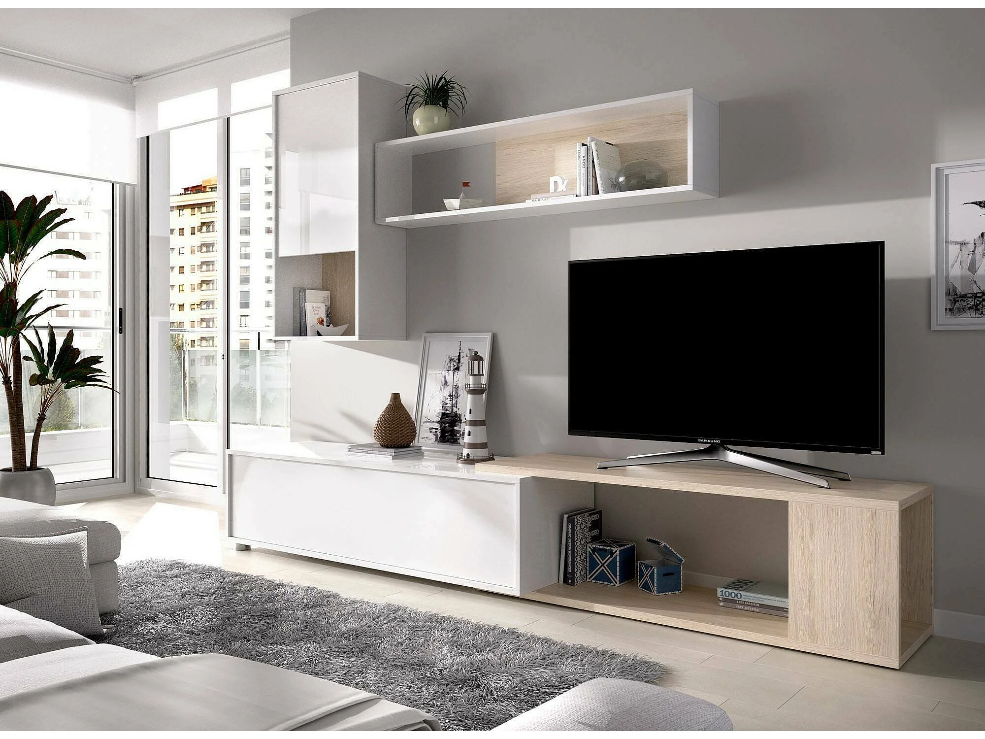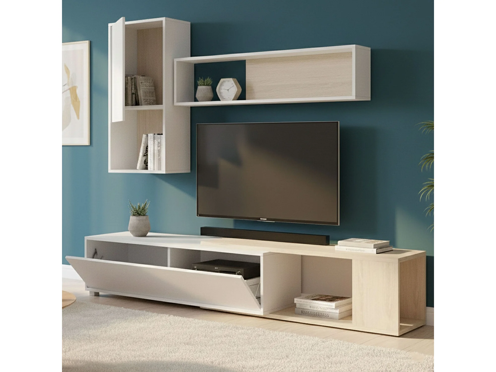 Système mural Dgam, Ensemble de salon d'angle modulable, Meubles de salon multi-positions, 230x41h180 cm, Blanc et Chêne