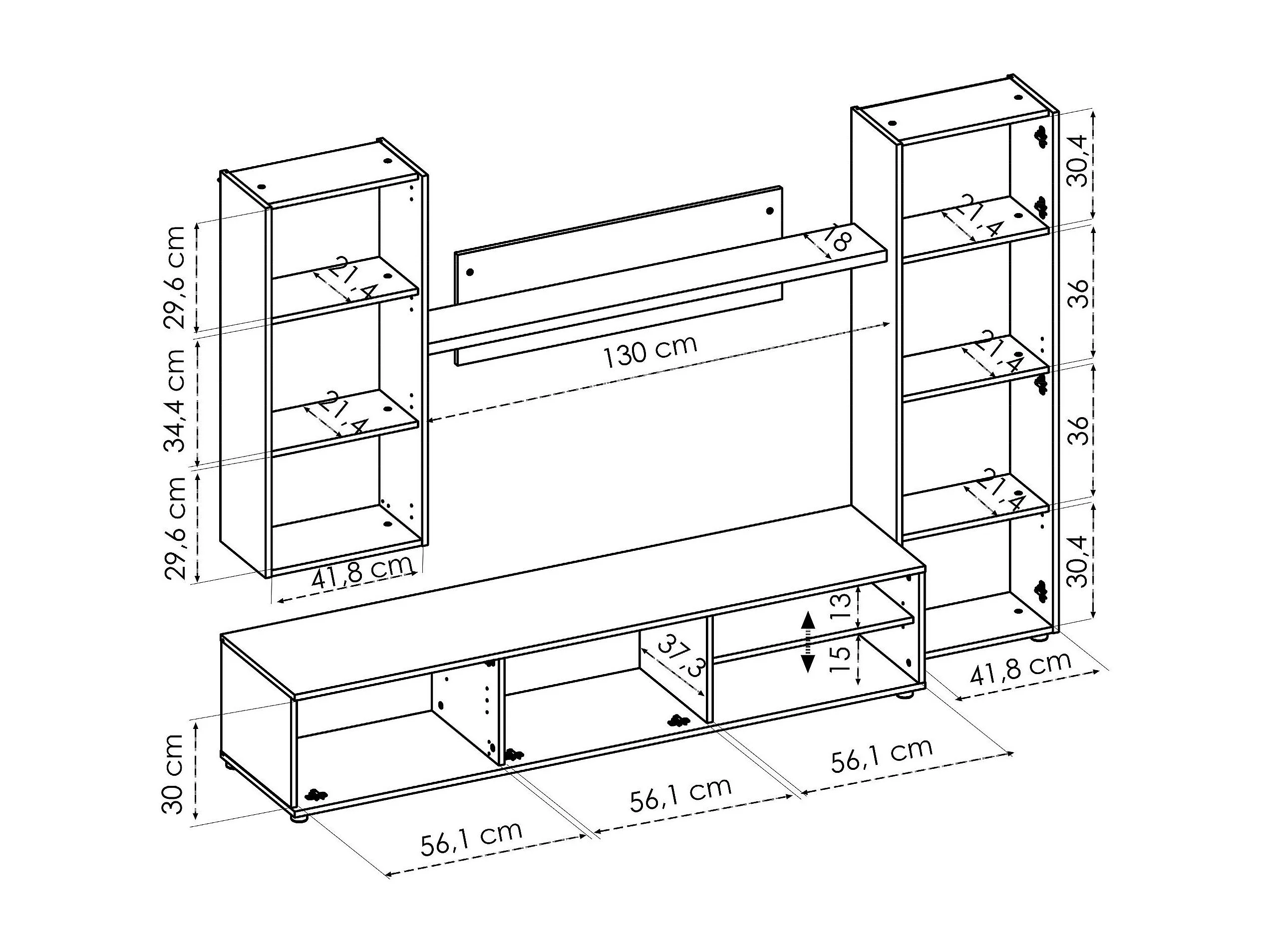 Système mural Dzuell, ensemble de salon meuble TV, meuble de salon polyvalent, 220x41h180 cm, Chêne noué et blanc