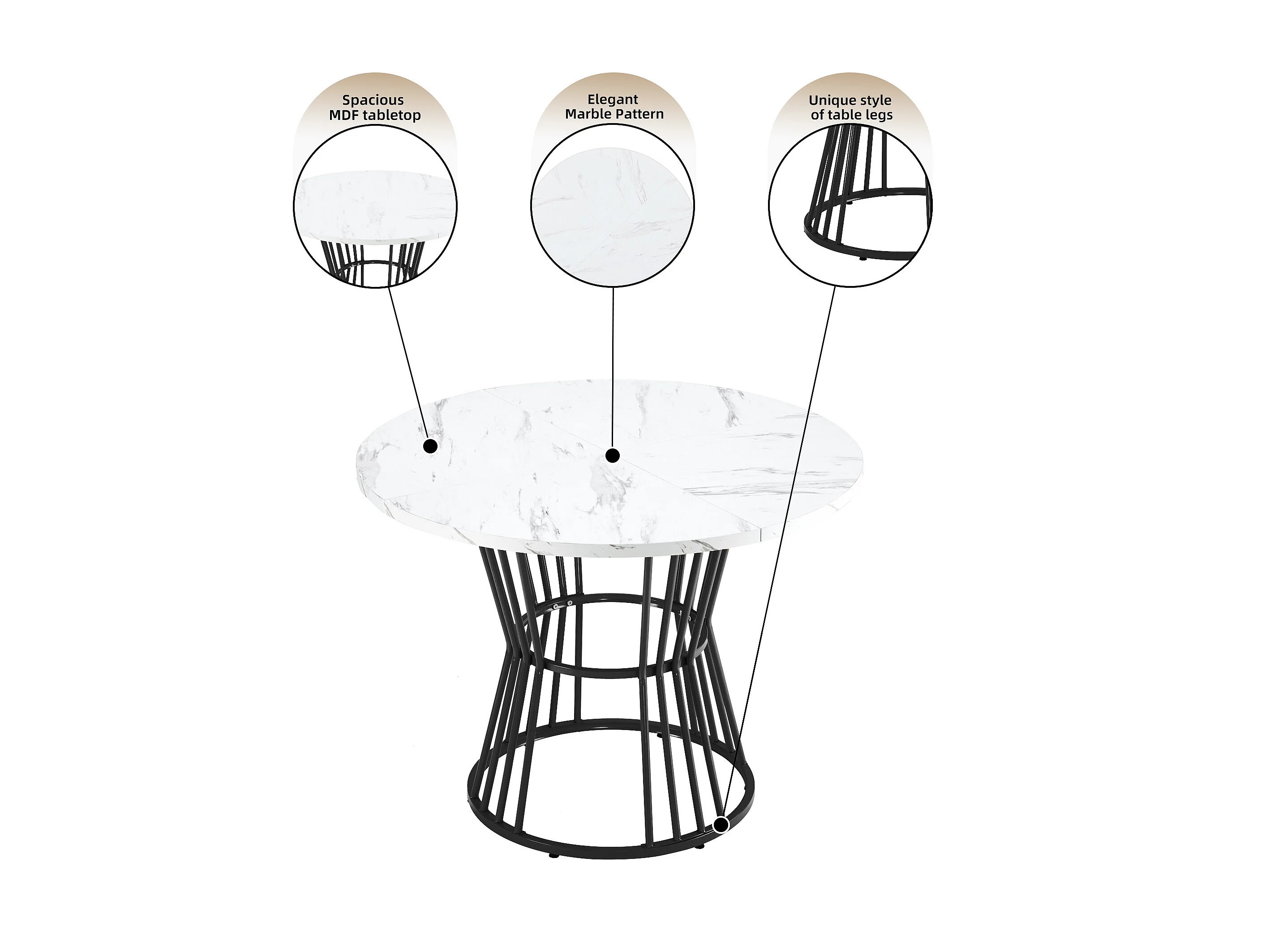 Table à manger 1 pièce, Piétement métal, Plateau effet marbre, Cuisine/Salon, Noir