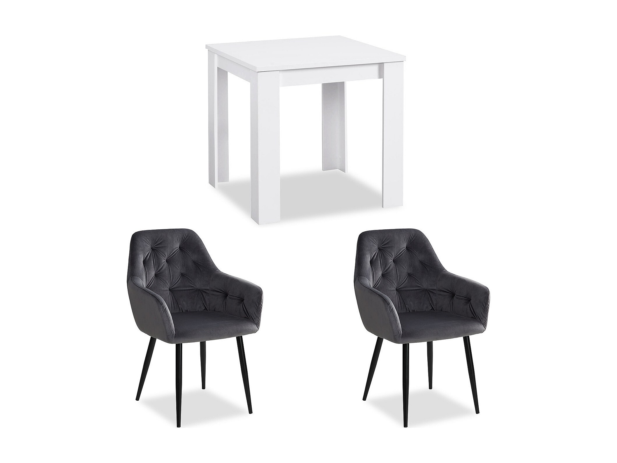 Table à manger 80x80x75 cm blanche avec 2 chaises œuf en velours gris