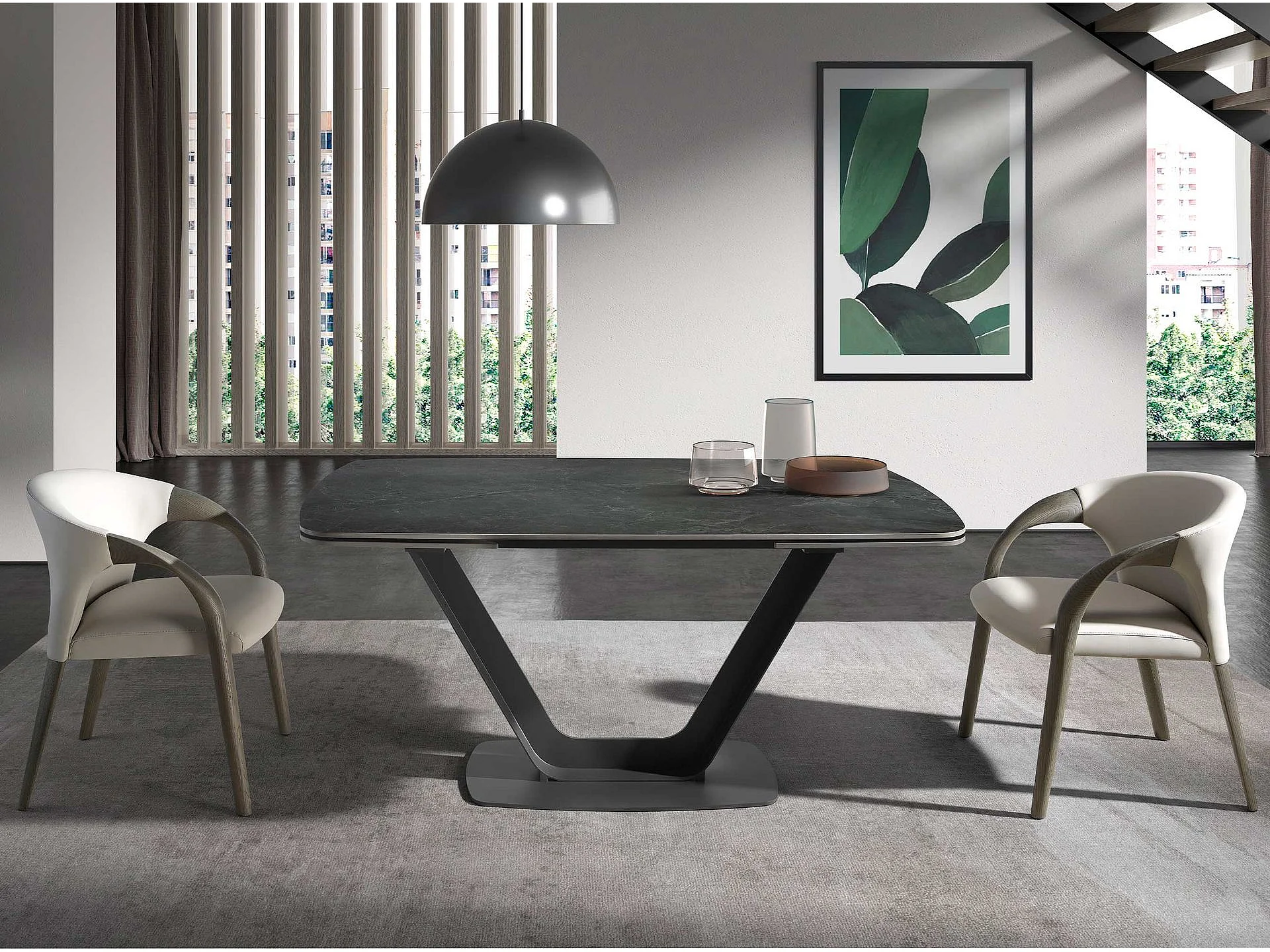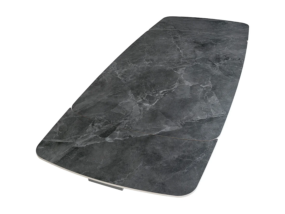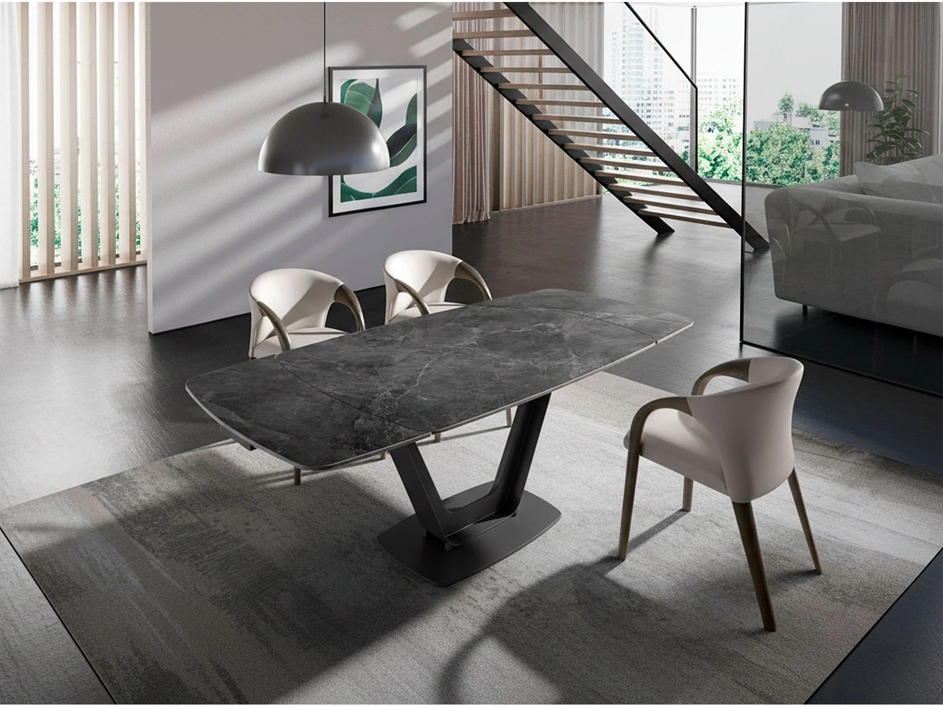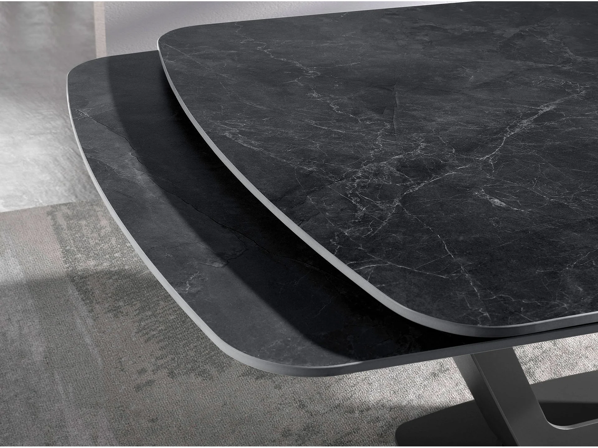 Table à manger à rallonge baril ovale marbre porcelaine et acier noir 1132 ANGEL CERDA