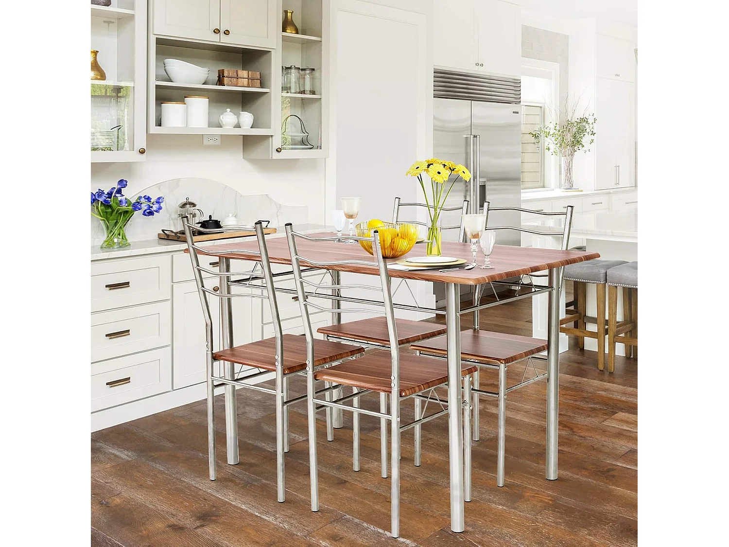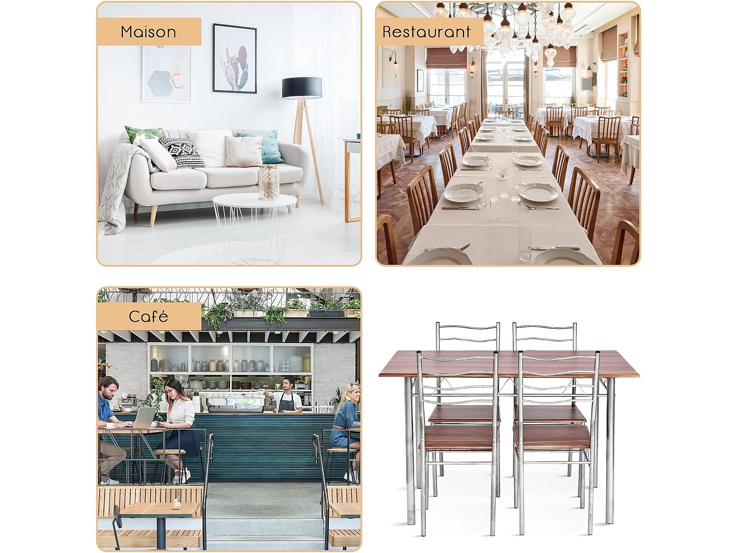 Table a Manger avec 4 Chaises Châssis Métal Contemporain, Ensemble 5 Pièces de Table de Salle à Manger pour Cuisine Salon, Montage Facile (Noyer Clair)