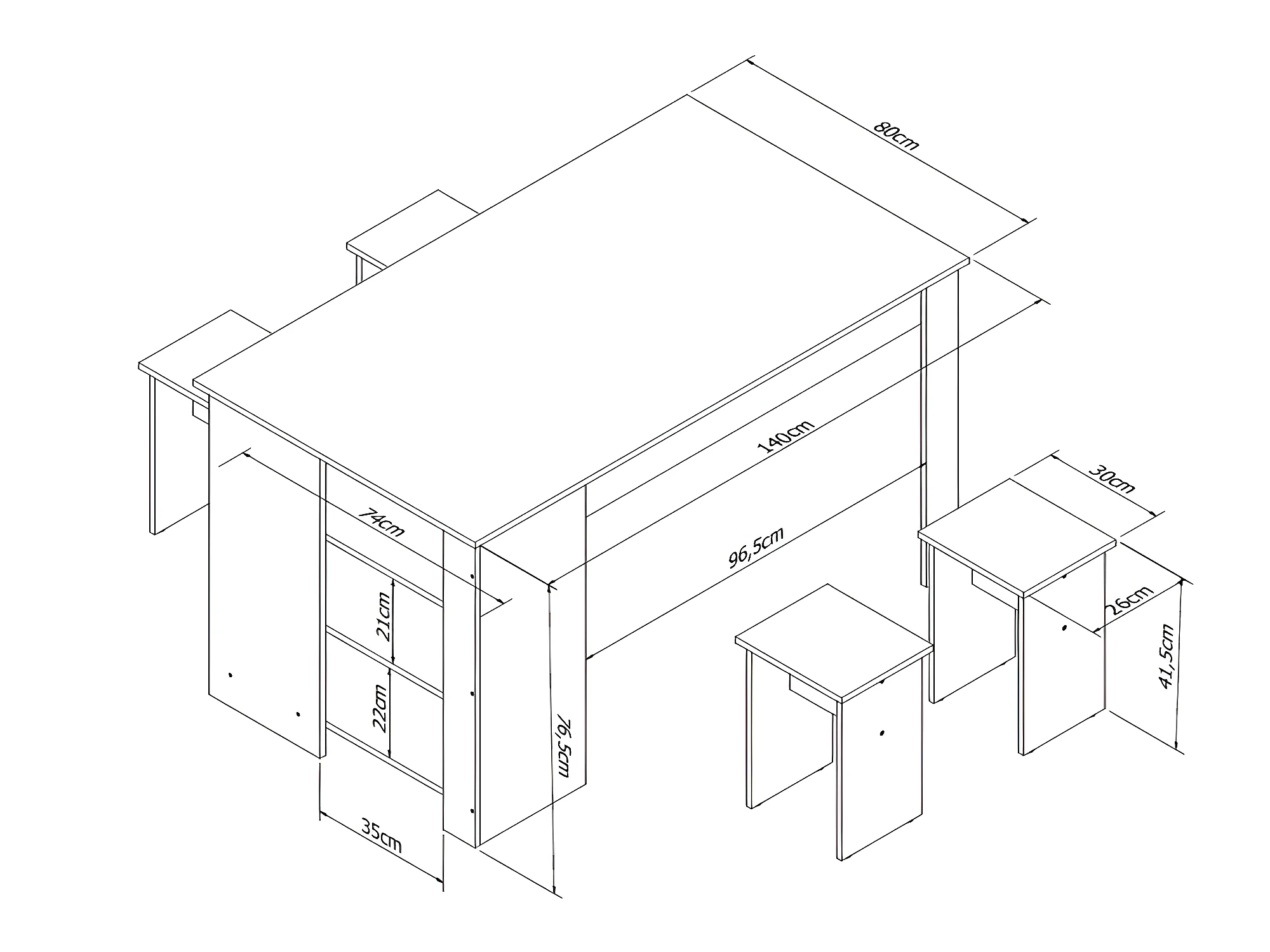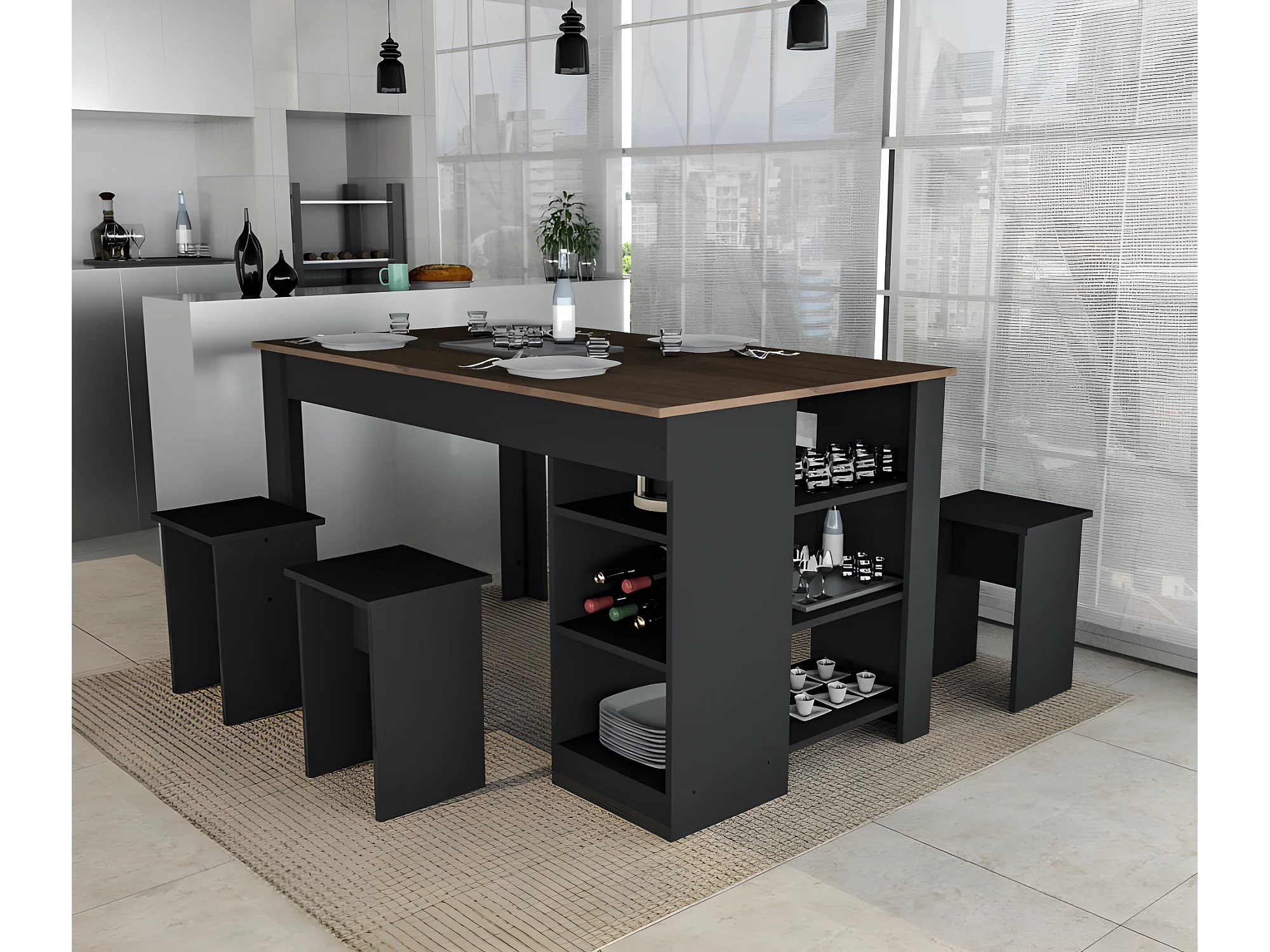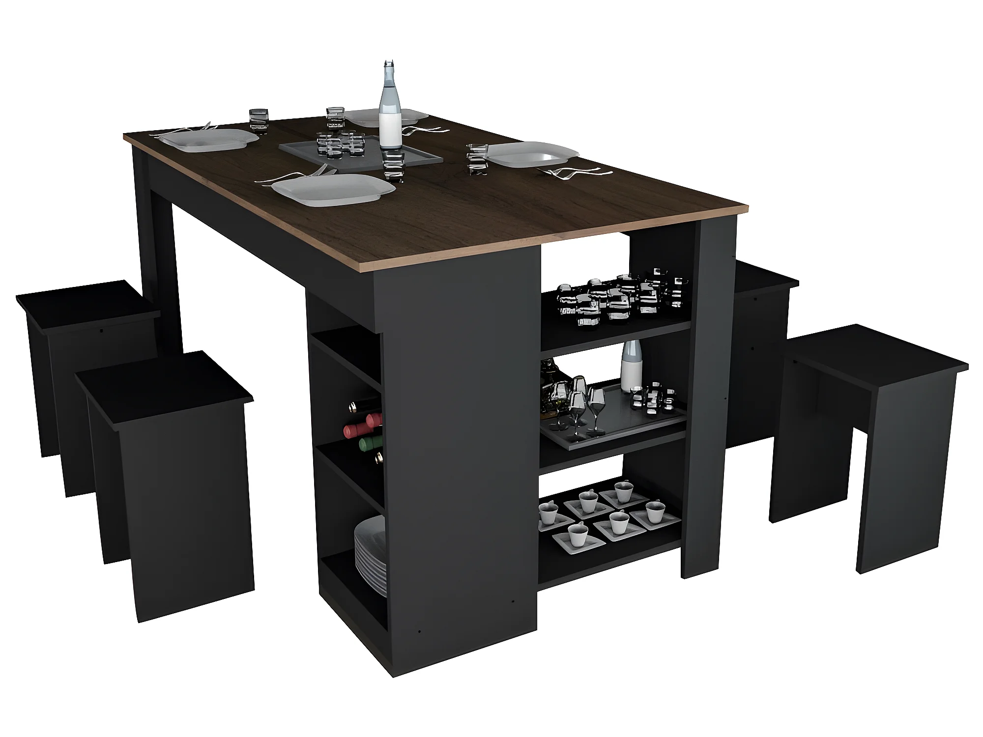 Table à Manger avec Rangement et 4 Tabourets Noir et Noyer