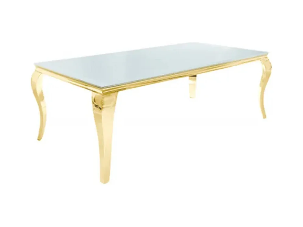 Table à manger BAROQUE 4 à 6 couverts 150x90 cm pieds gold plateau en verre blanc