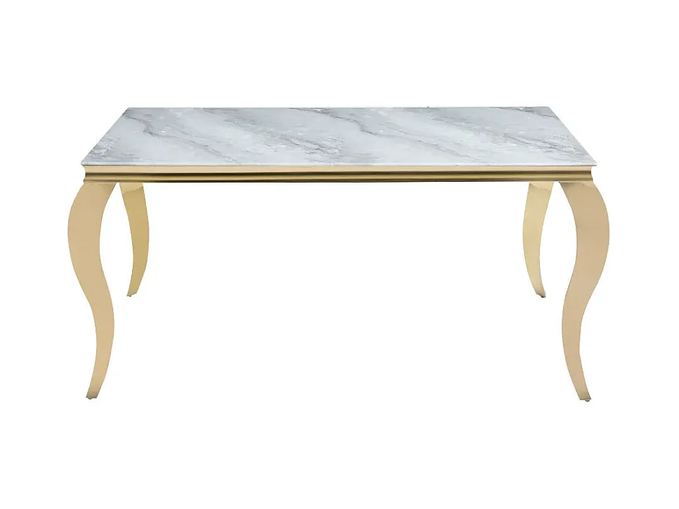 Table à manger BAROQUE 6 à 8 couverts 180x90 cm pieds gold plateau en verre effet marbré greige