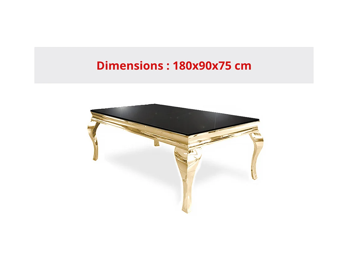 Table à manger BAROQUE 6 à 8 couverts 180x90 cm pieds gold plateau en verre noir
