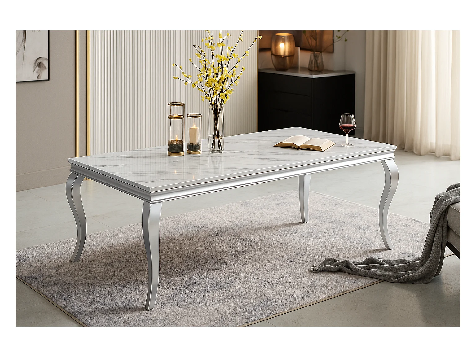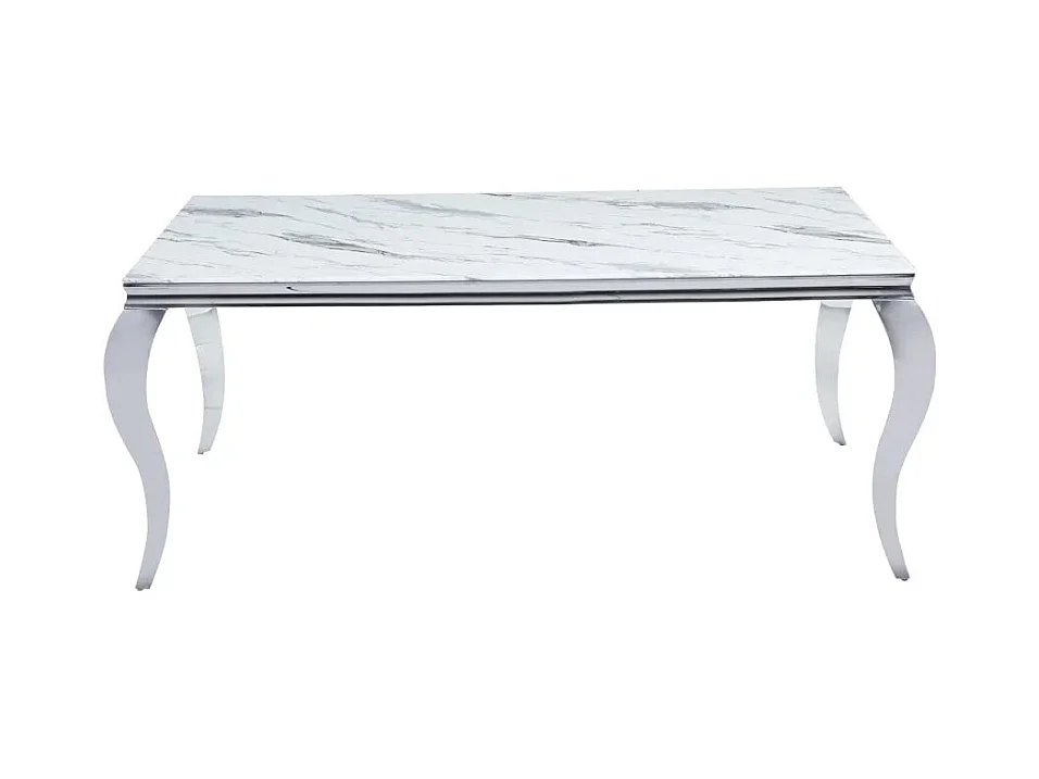 Table à manger BAROQUE 6 à 8 couverts pieds chrome plateau en verre 180x90 cm effet marbré blanc