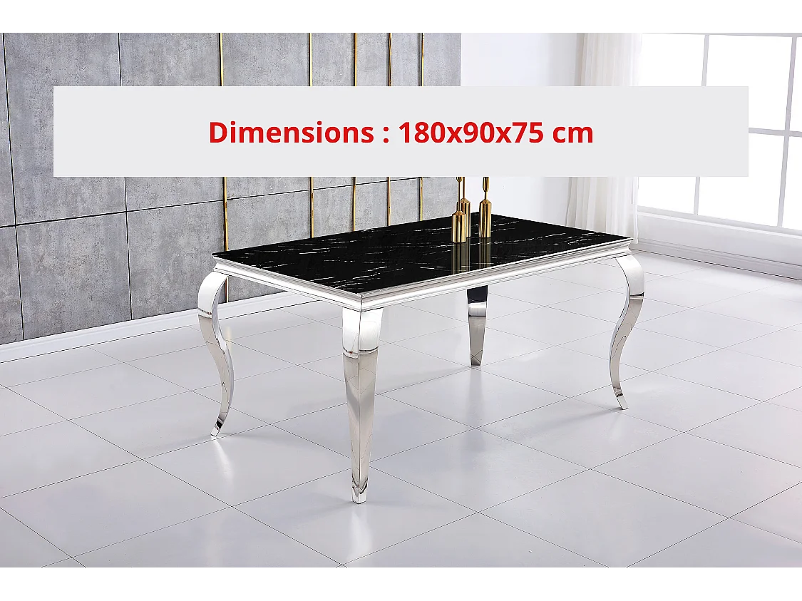 Table à manger BAROQUE 6 à 8 couverts pieds chrome plateau en verre 180x90 cm effet marbré noir