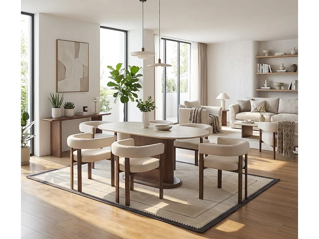 Table à manger céramique travertin pied effet noyer 180x90x75 cm LOKA