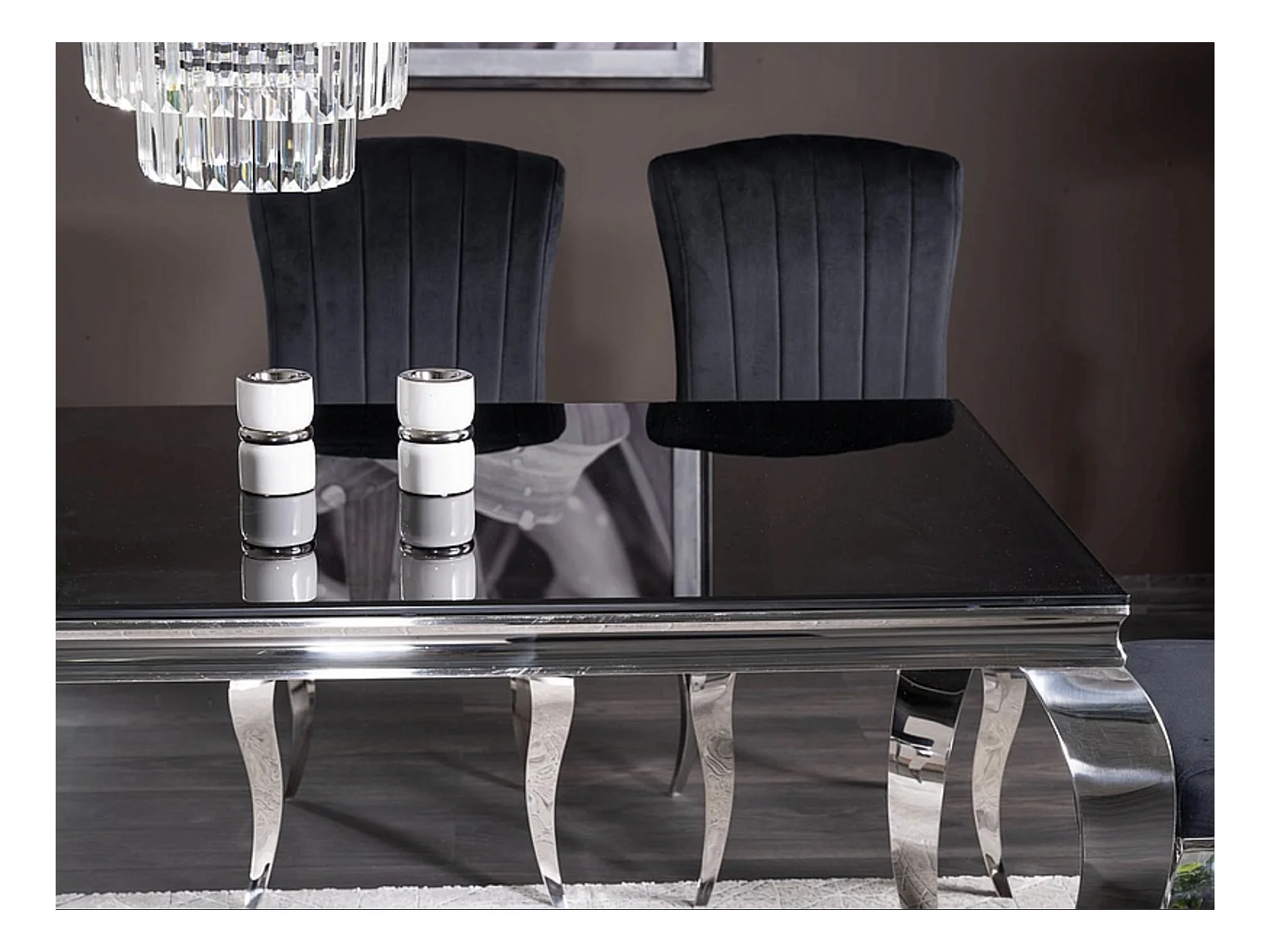 Table à manger design baroque verre trempé noir et acier chromé Boza 150cm