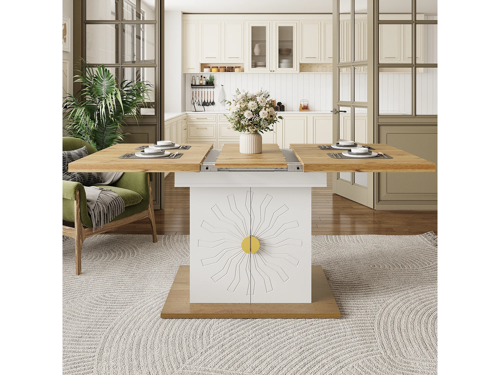 Table à manger extensible 110/140x70x76 cm - Pour 6 personnes - MDF + métal - avec meuble de rangement - Blanc