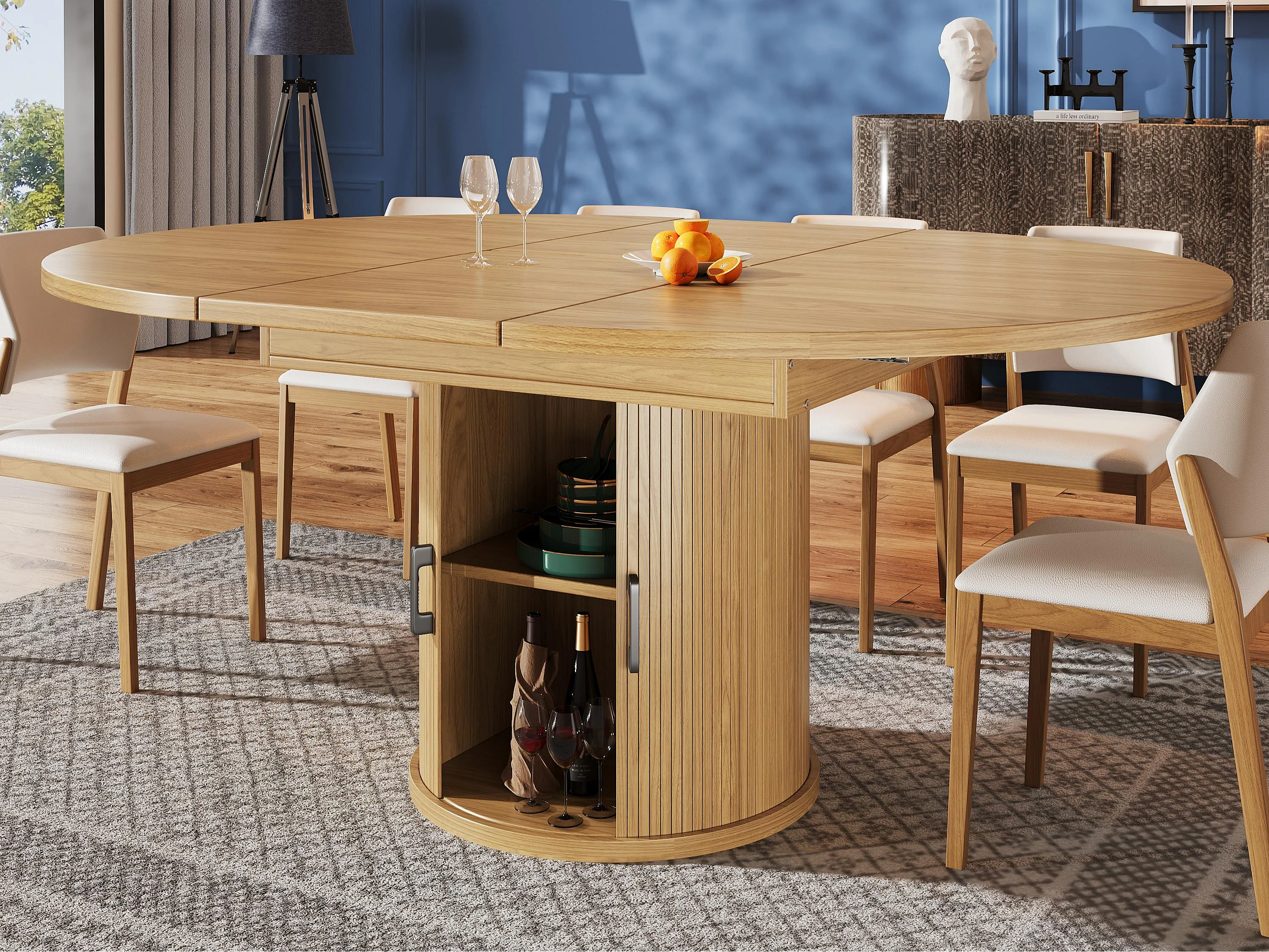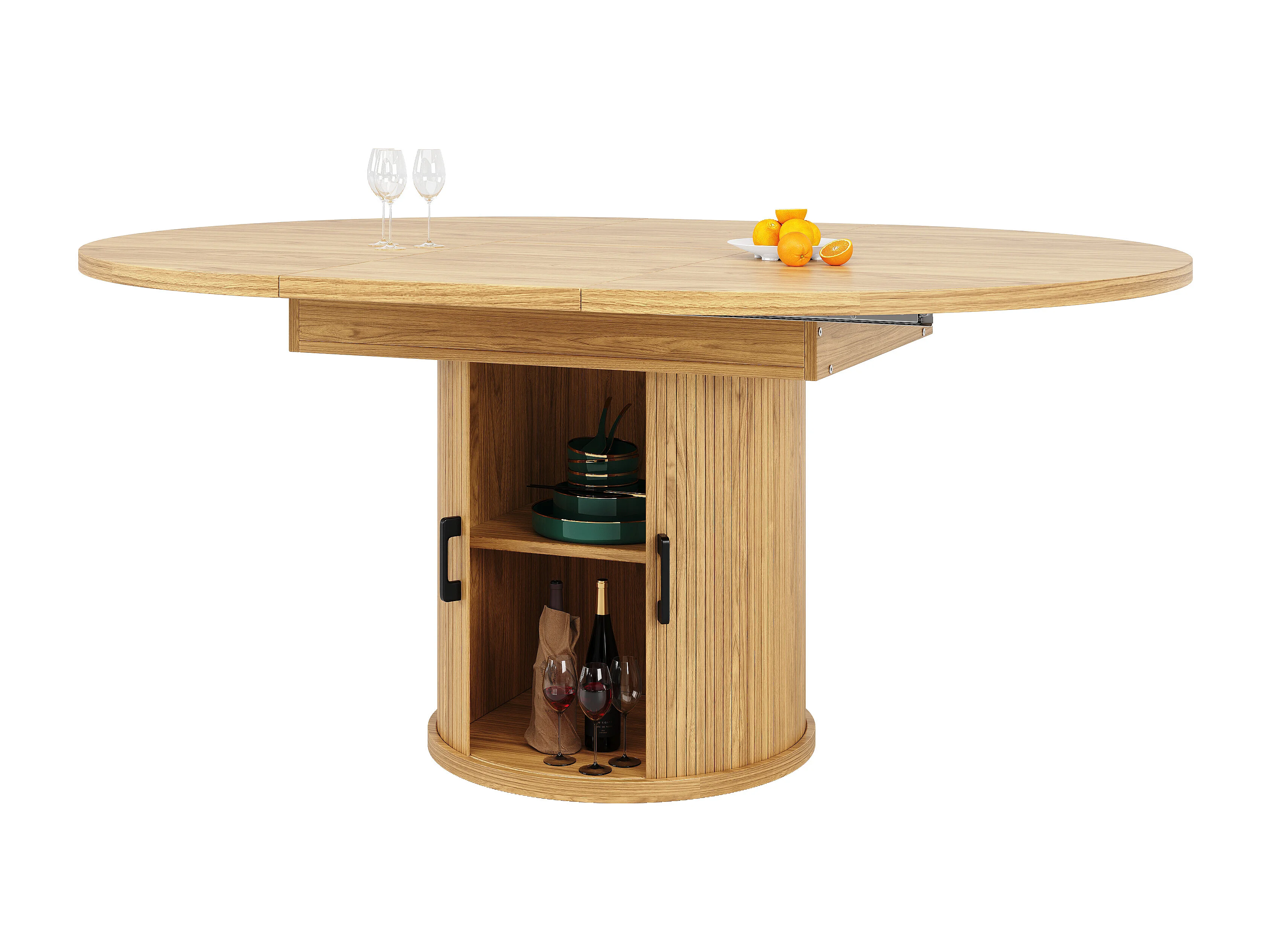 Table à manger extensible - MDF - Table ronde - 118-158 cm - 6 personnes - 1 porte - 2 étagères - Naturel clair