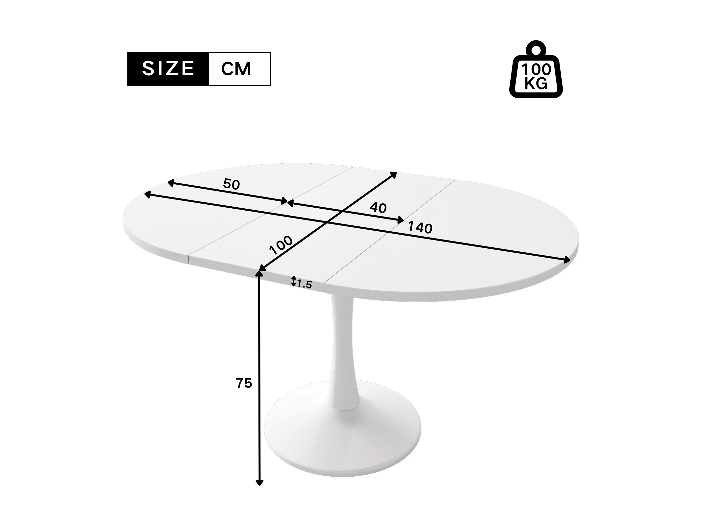 Table à manger extensible ovale 4-6 personnes 100/140x100cm en MDF avec Pied central, blanc