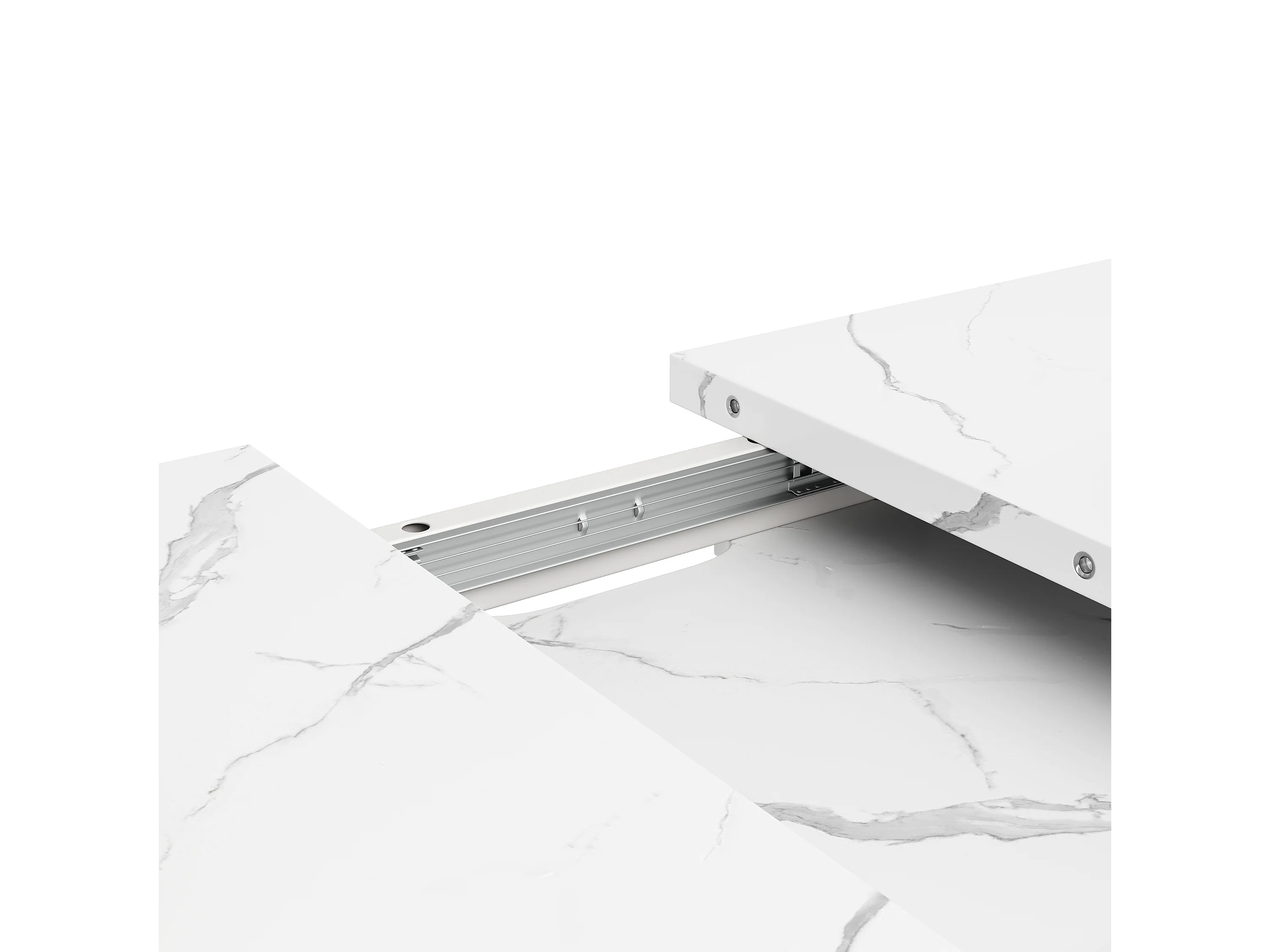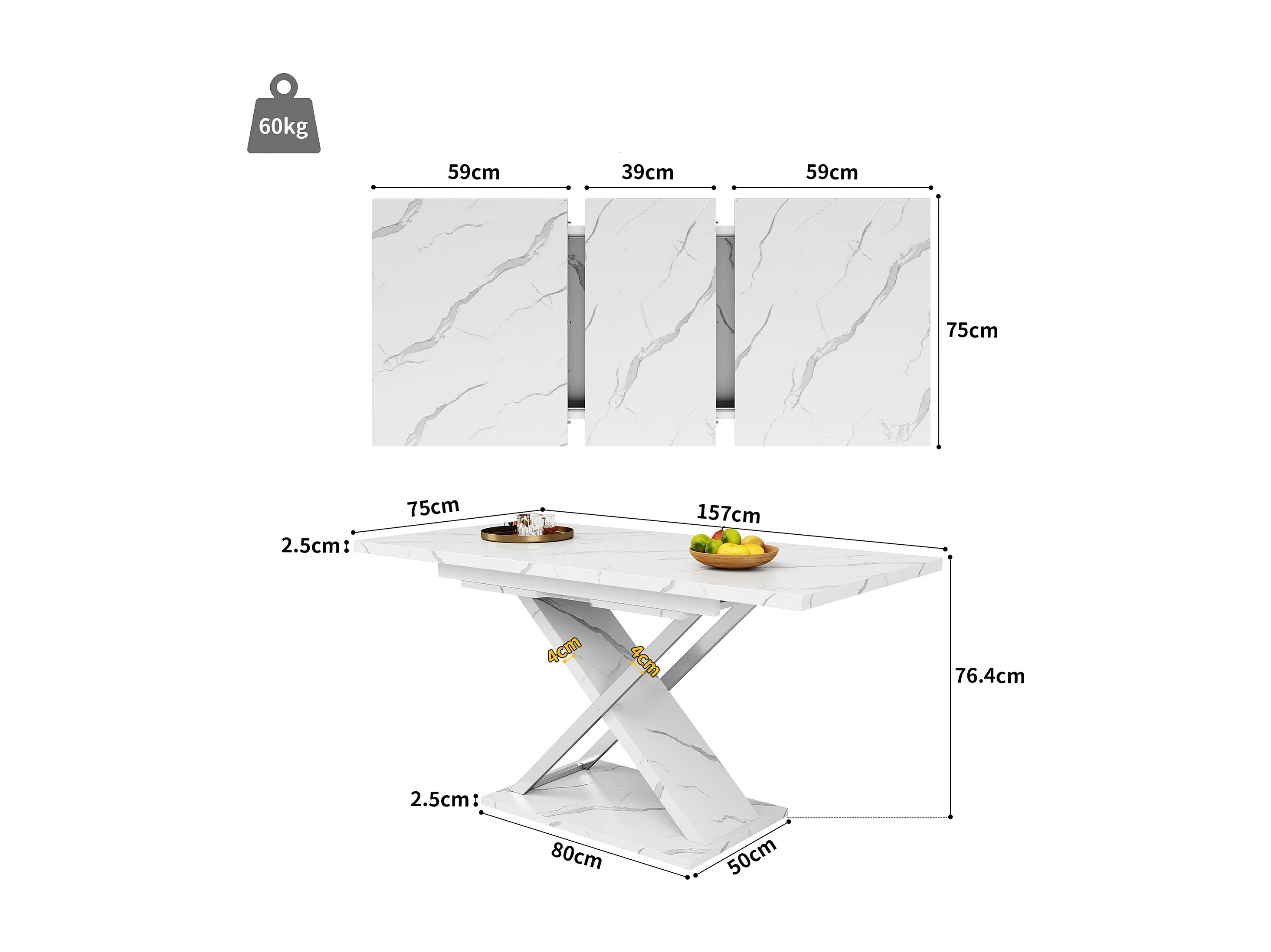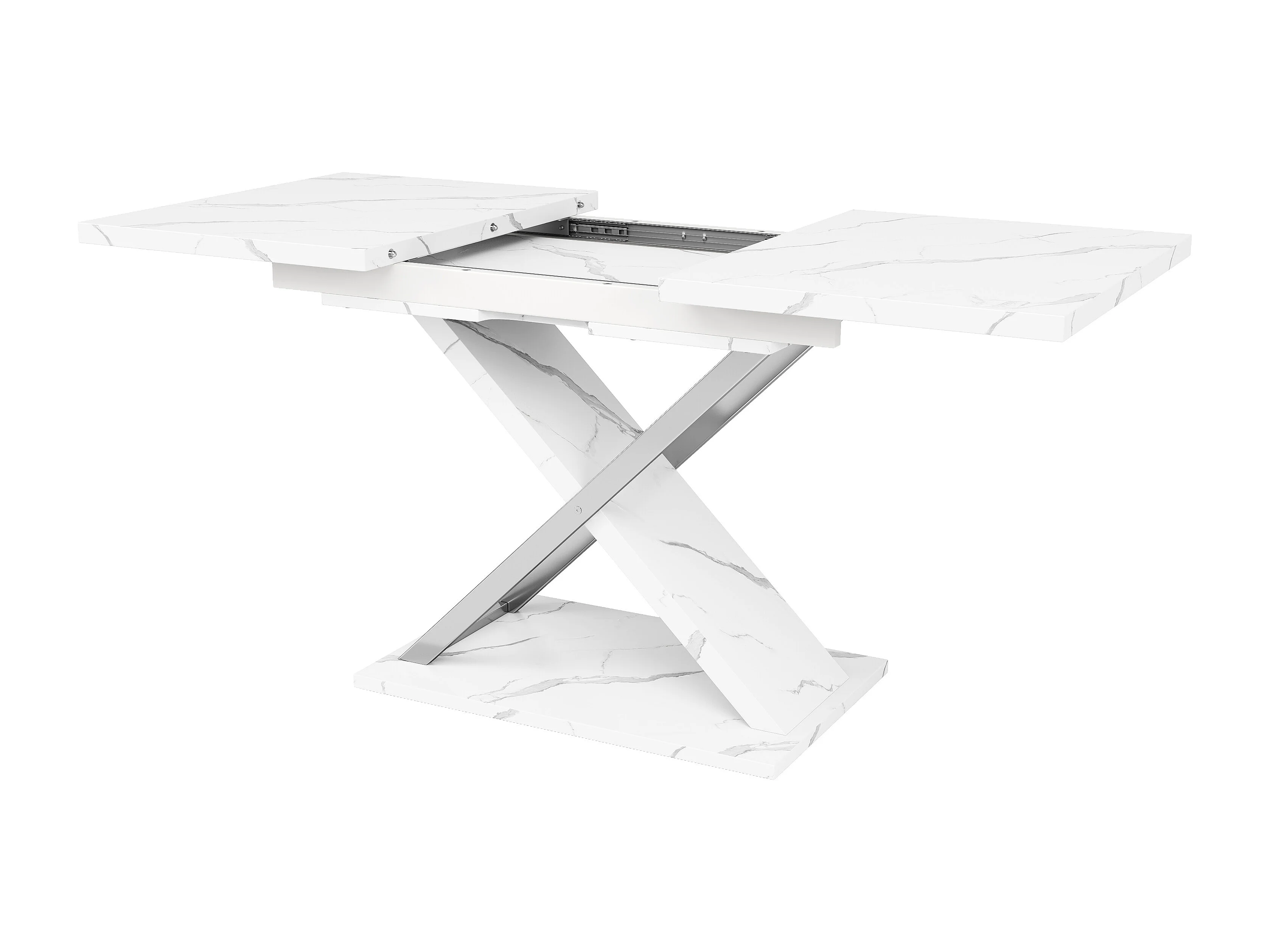 Table à manger extensible rectangle 4-6 personnes, plateau en placage marbre blanc avec pieds en X - 118/157x75x76.4cm