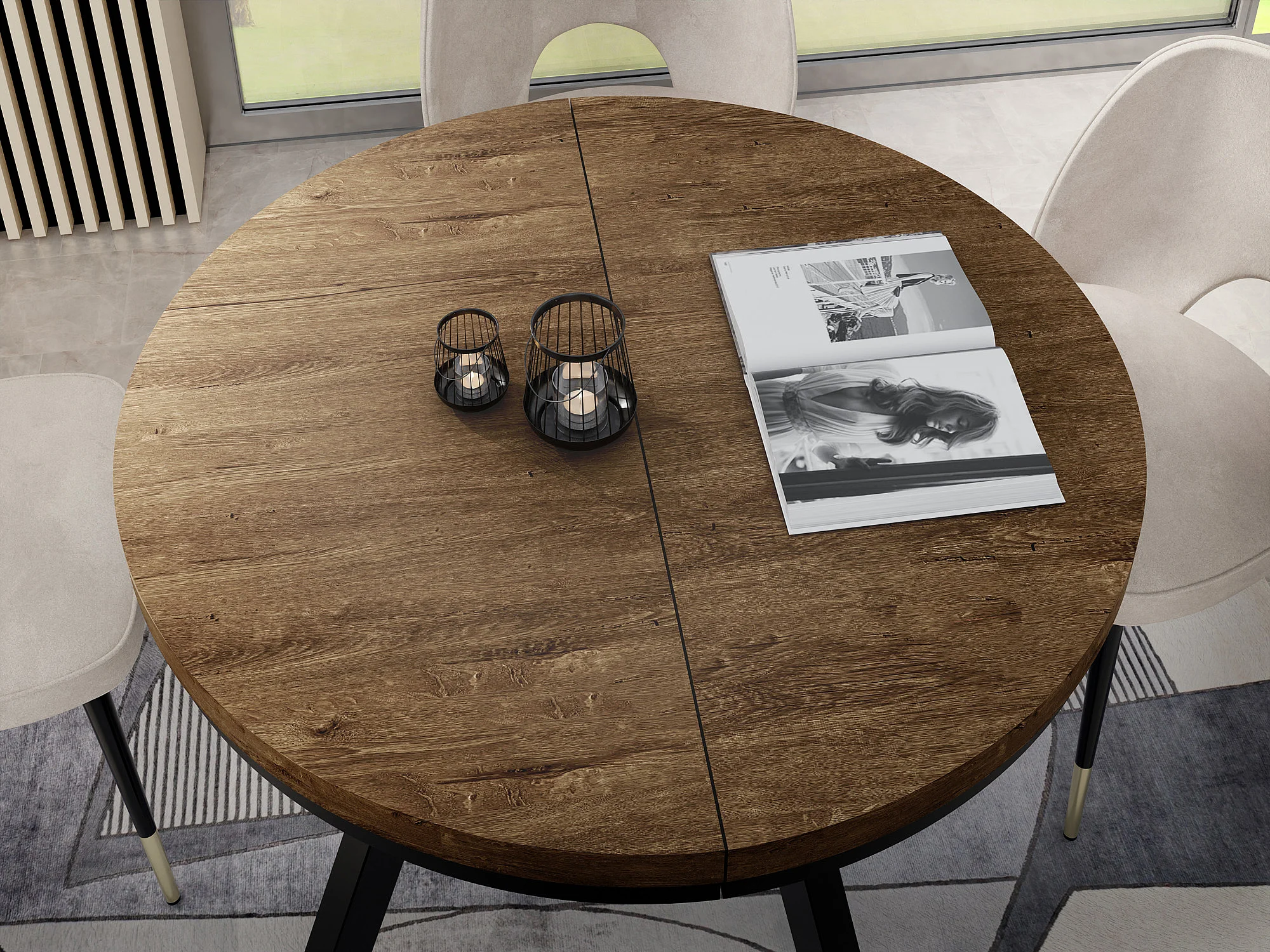 Table à Manger Extensible Ronde Designer - Style Loft, Peu Encombrant - Pieds Noirs - 100 à 150 cm - Pour 5-8 personnes - Fabriqué en UE - Chêne Lefkas - 150 cm