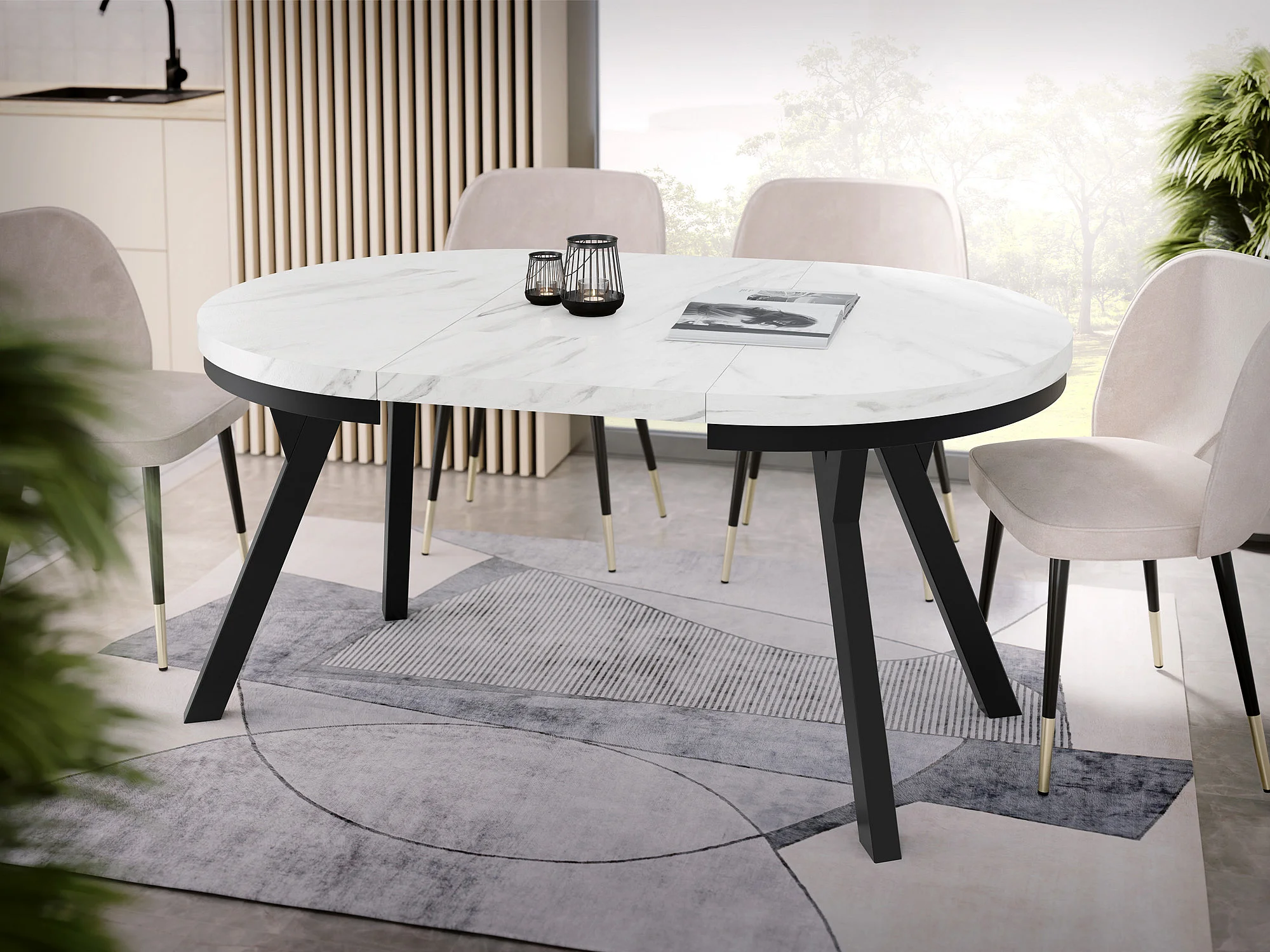 Table à Manger Extensible Ronde Designer - Style Loft, Peu Encombrant - Pieds Noirs - 100 à 150 cm - Pour 5-8 personnes - Fabriqué en UE - Marbre Blanc - 150 cm