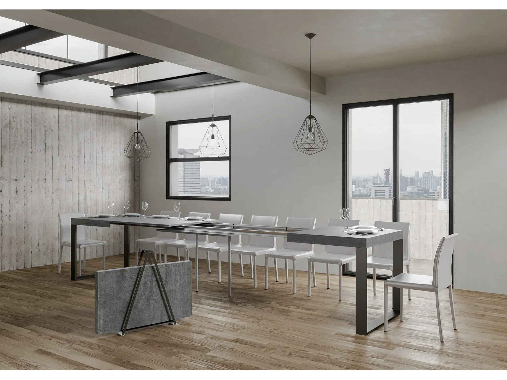 Table à manger extensible Tiroz-Couleur Gris ciment-4 pieds-5 rallonges fines-130 à 390cm