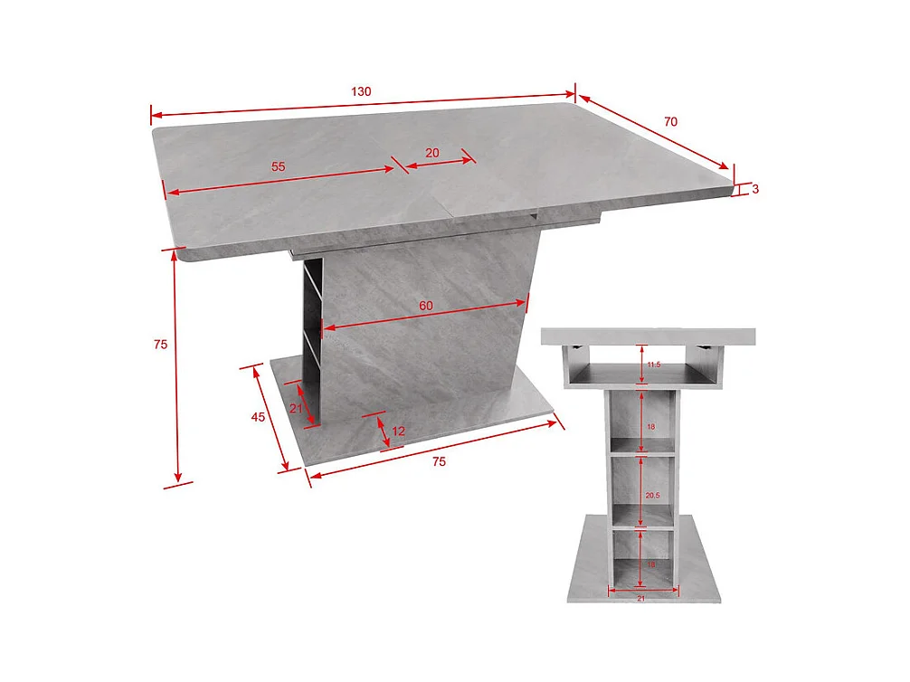 Table à manger extensible 4-6 personnes 130x70cm en Panneau de particule avec rangement, placage marbre gris