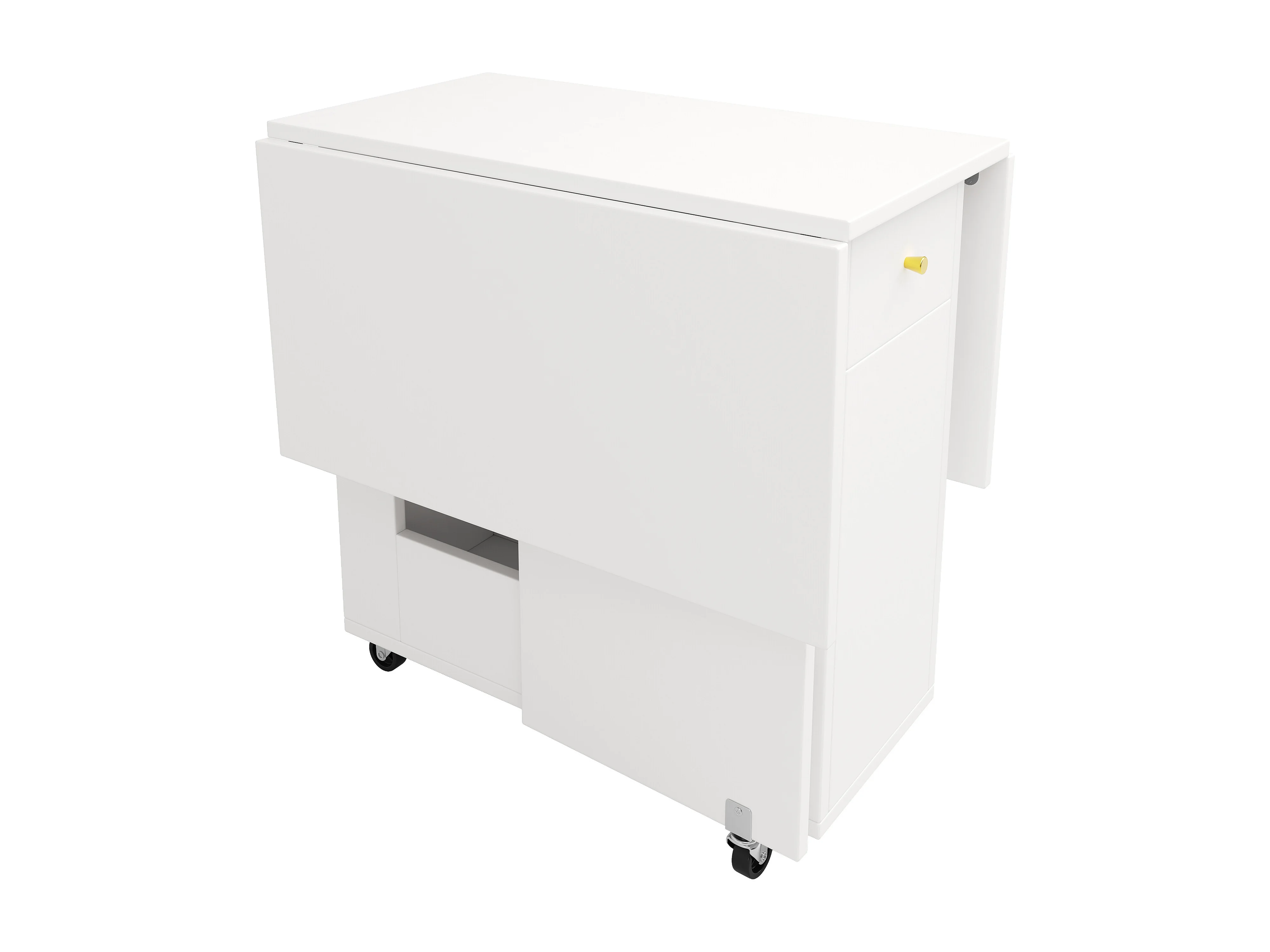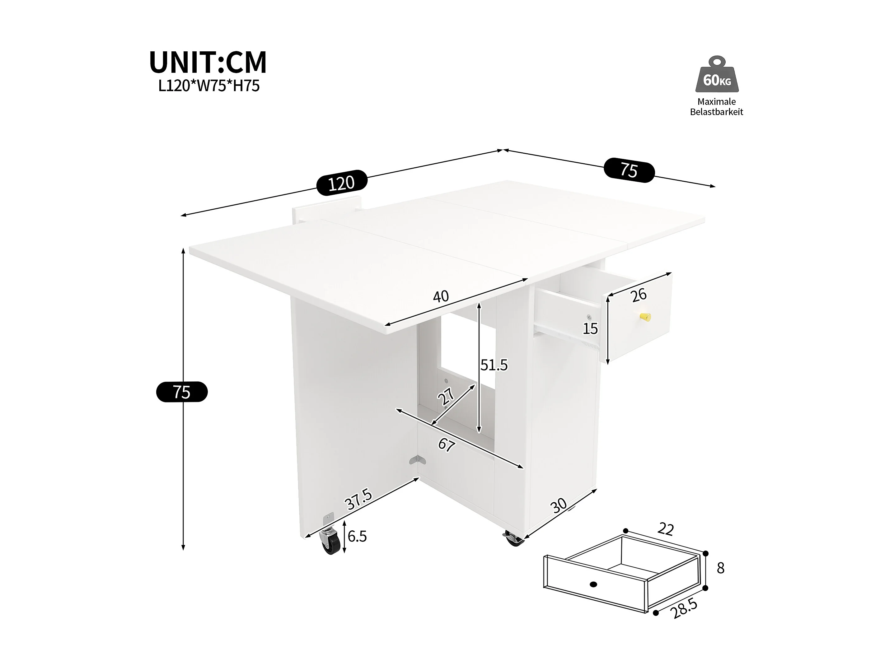 Table à manger pliable 120x75x75 cm - avec espace de rangement - 2 tiroirs - roulettes verrouillables - blanc
