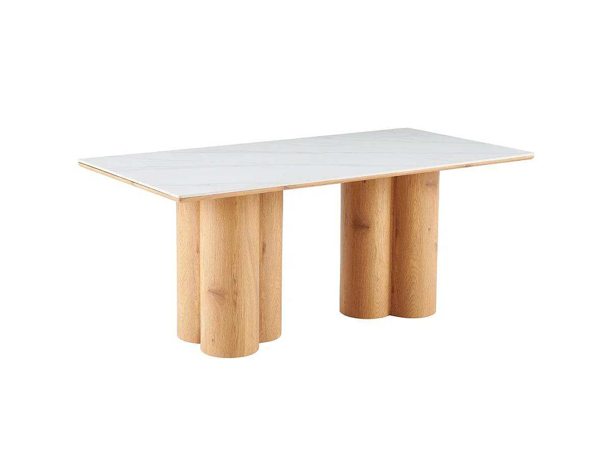 Table à manger rectangulaire 8 pers. en céramique effet Marbre blanc et piètement effet bois 180x90 cm - Kaolin