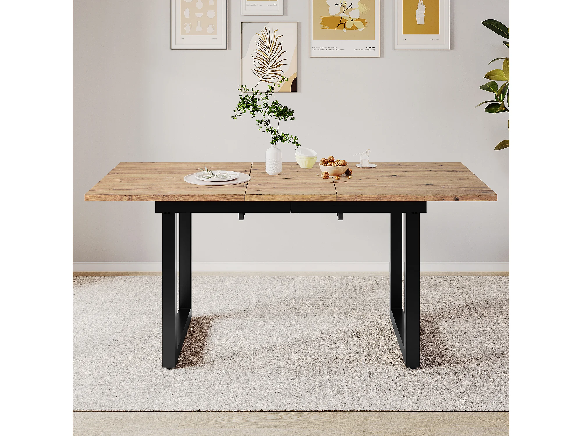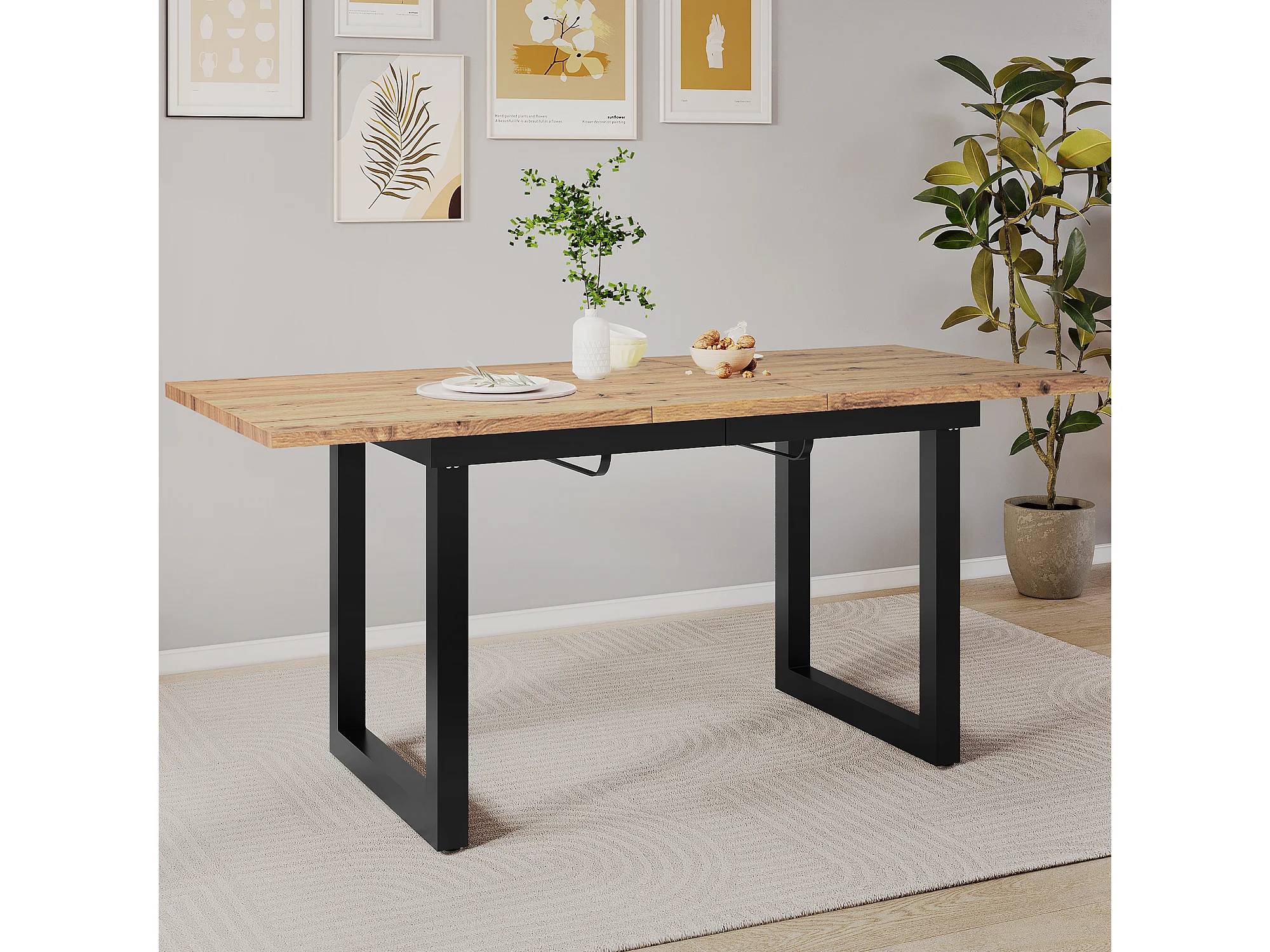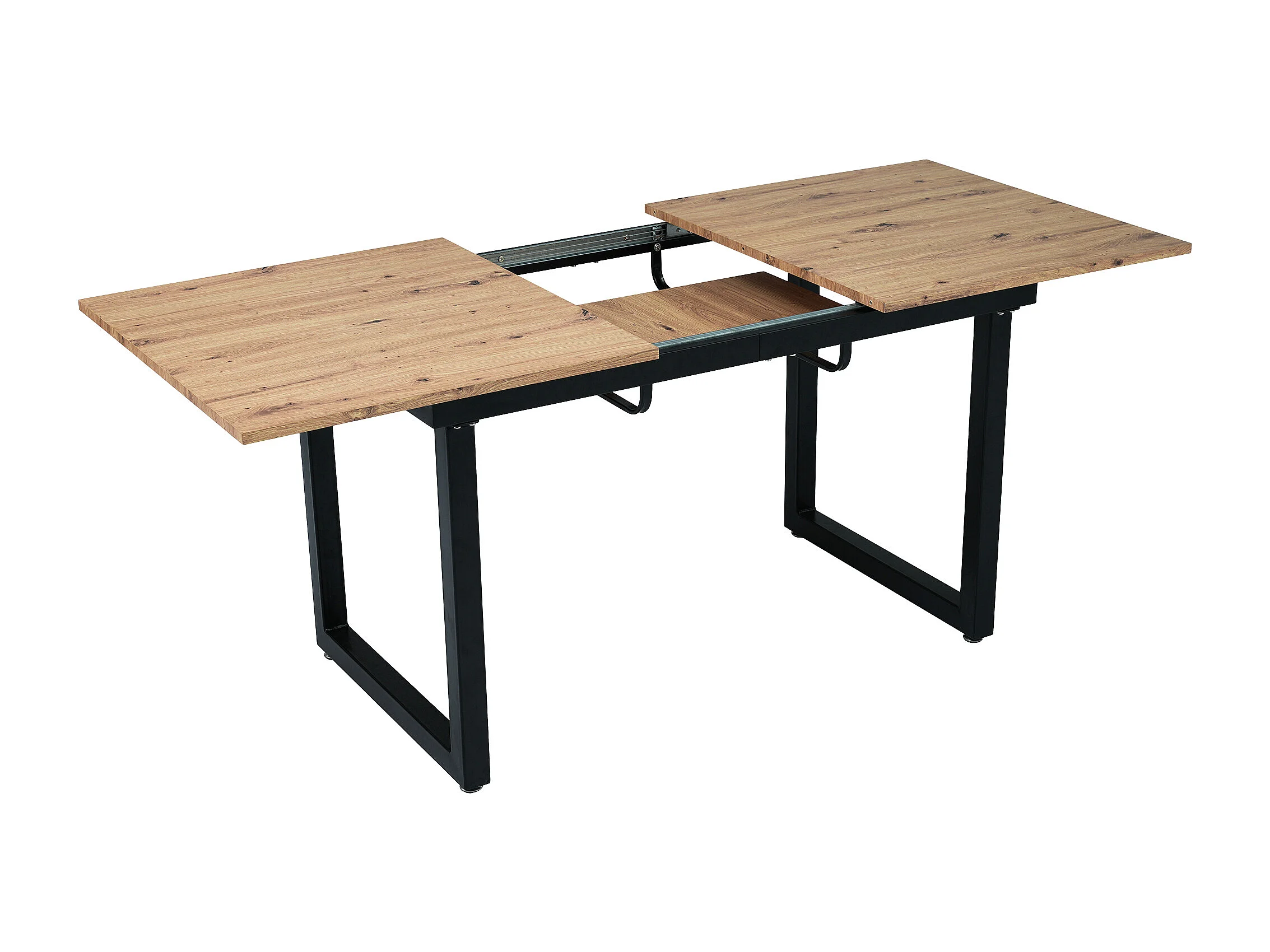 Table à manger rectangulaire - avec plateau rétractable en chêne - pieds en métal noir - pour salle à manger et salon