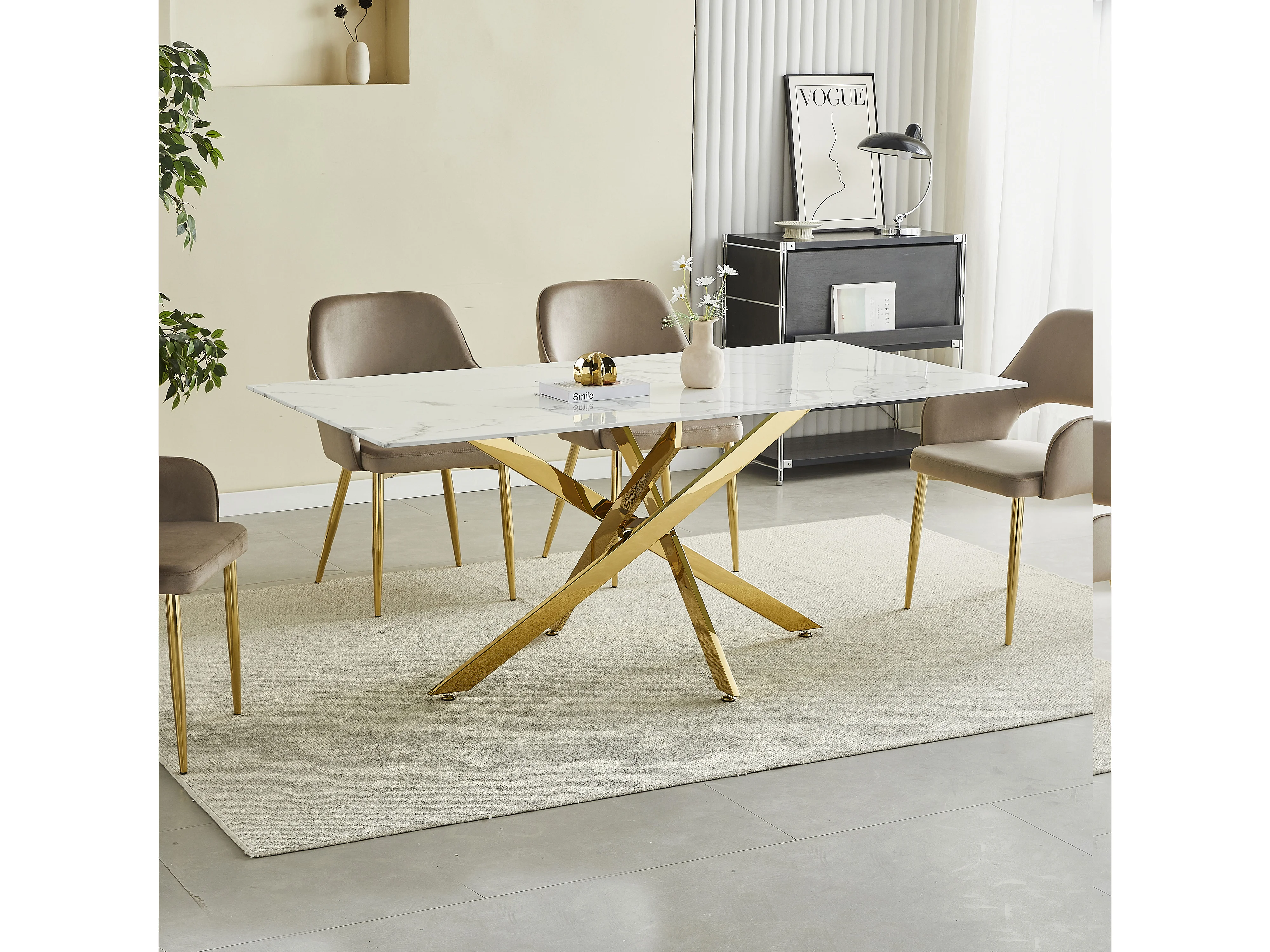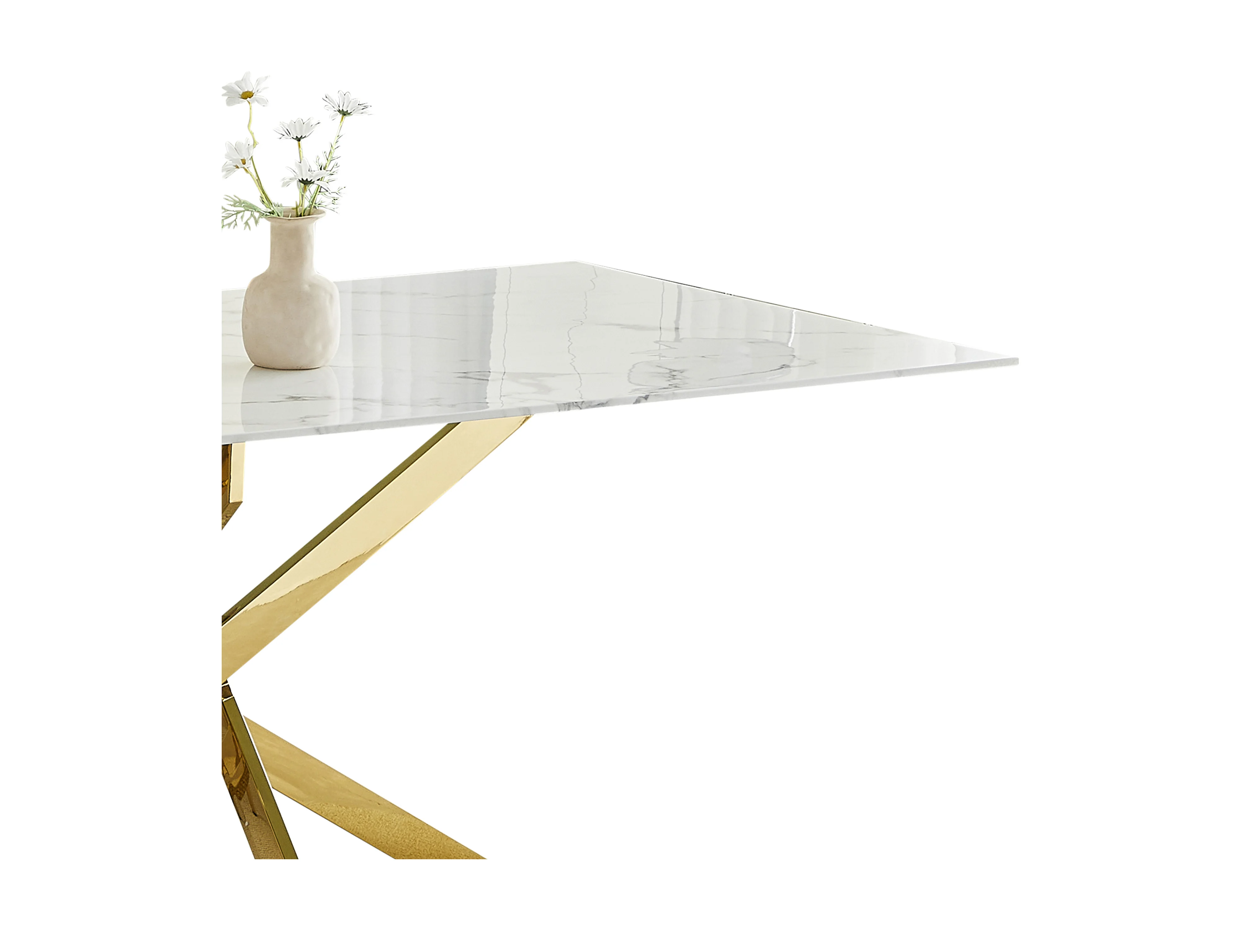 Table à manger rectangulaire en verre trempé - Effet marbre blanc et métal doré – 8 personnes – CHIARA