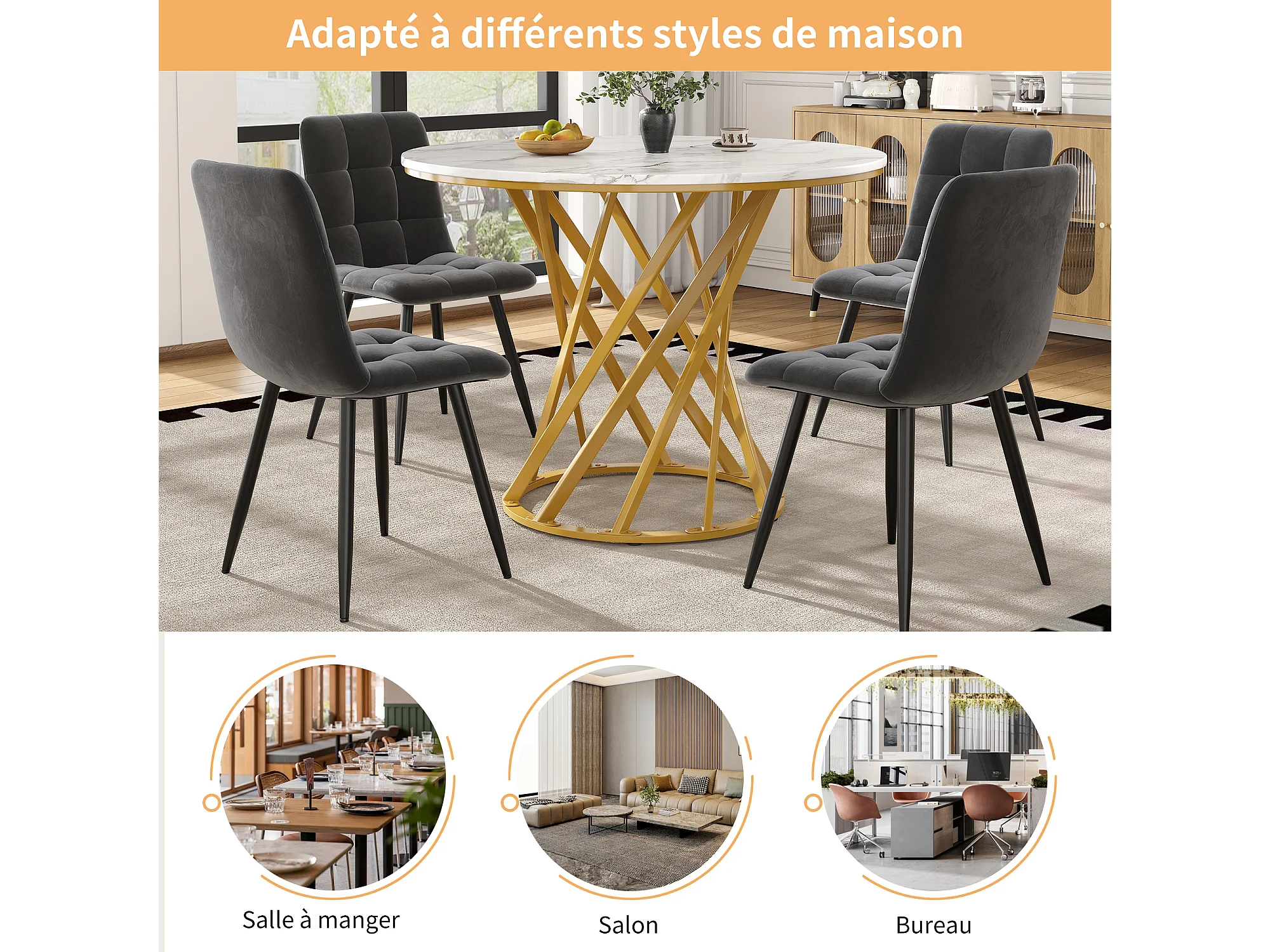 Table À Manger - Plateau Rond Marbré - Pieds Métal Doré Avec Patins Réglables - 80 x 80 x 76 cm En MDF+Métal - Doré+Blanc
