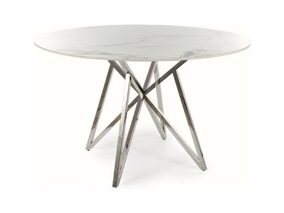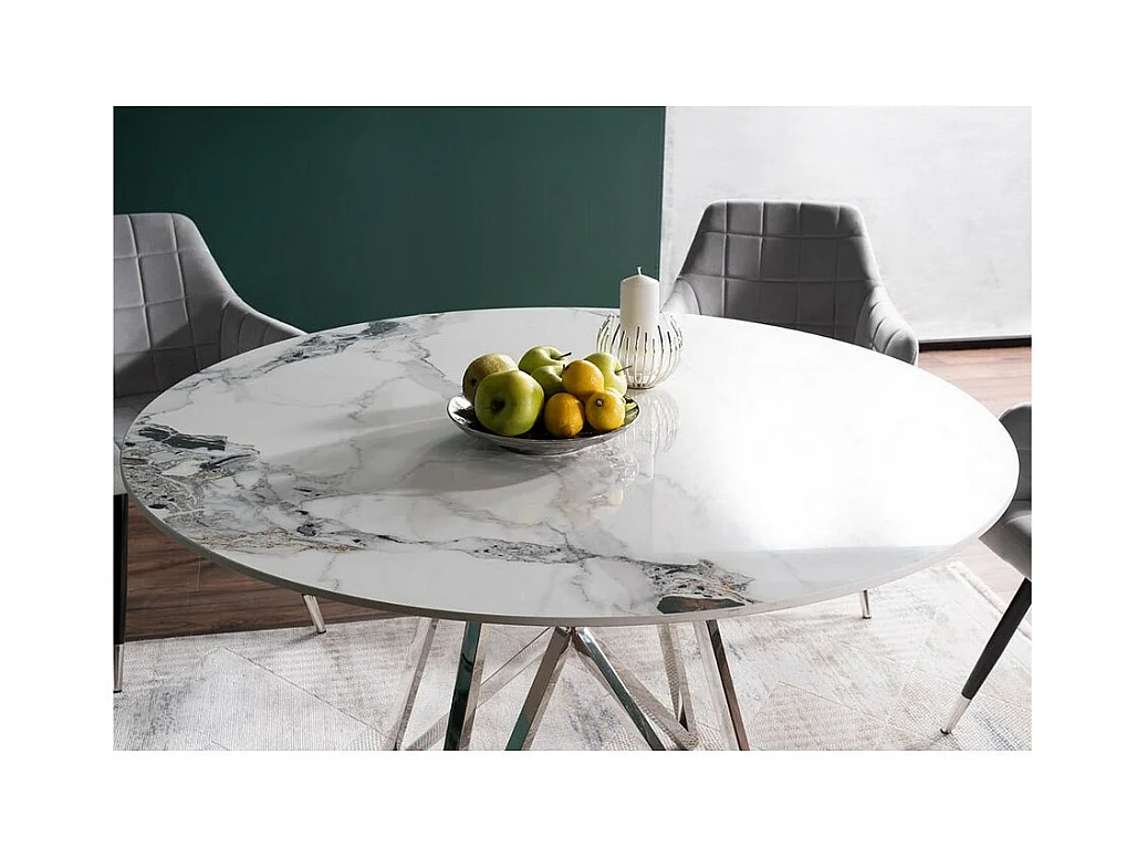 Table à manger ronde aspect marbre blanc avec piètement chromé Manon