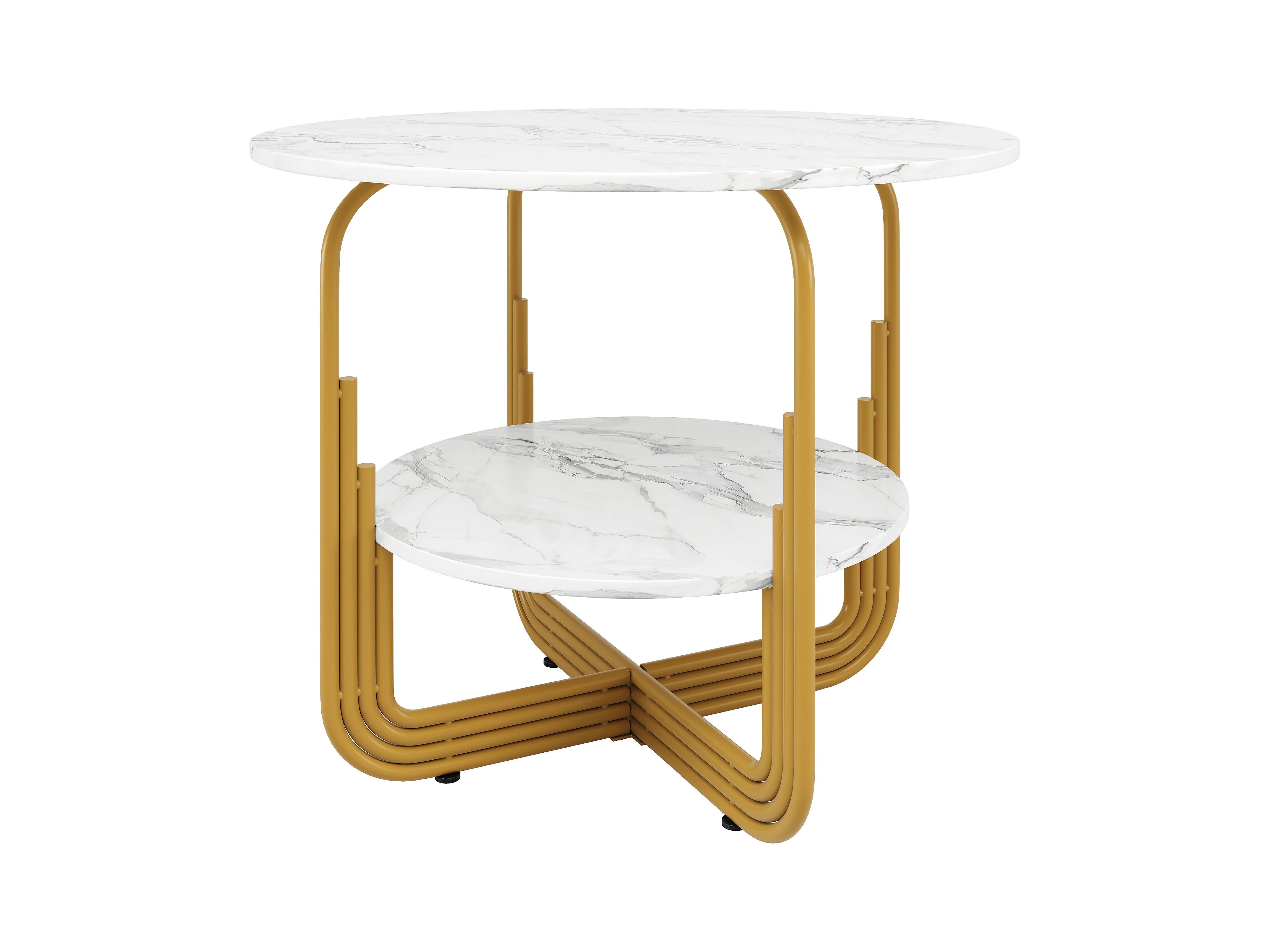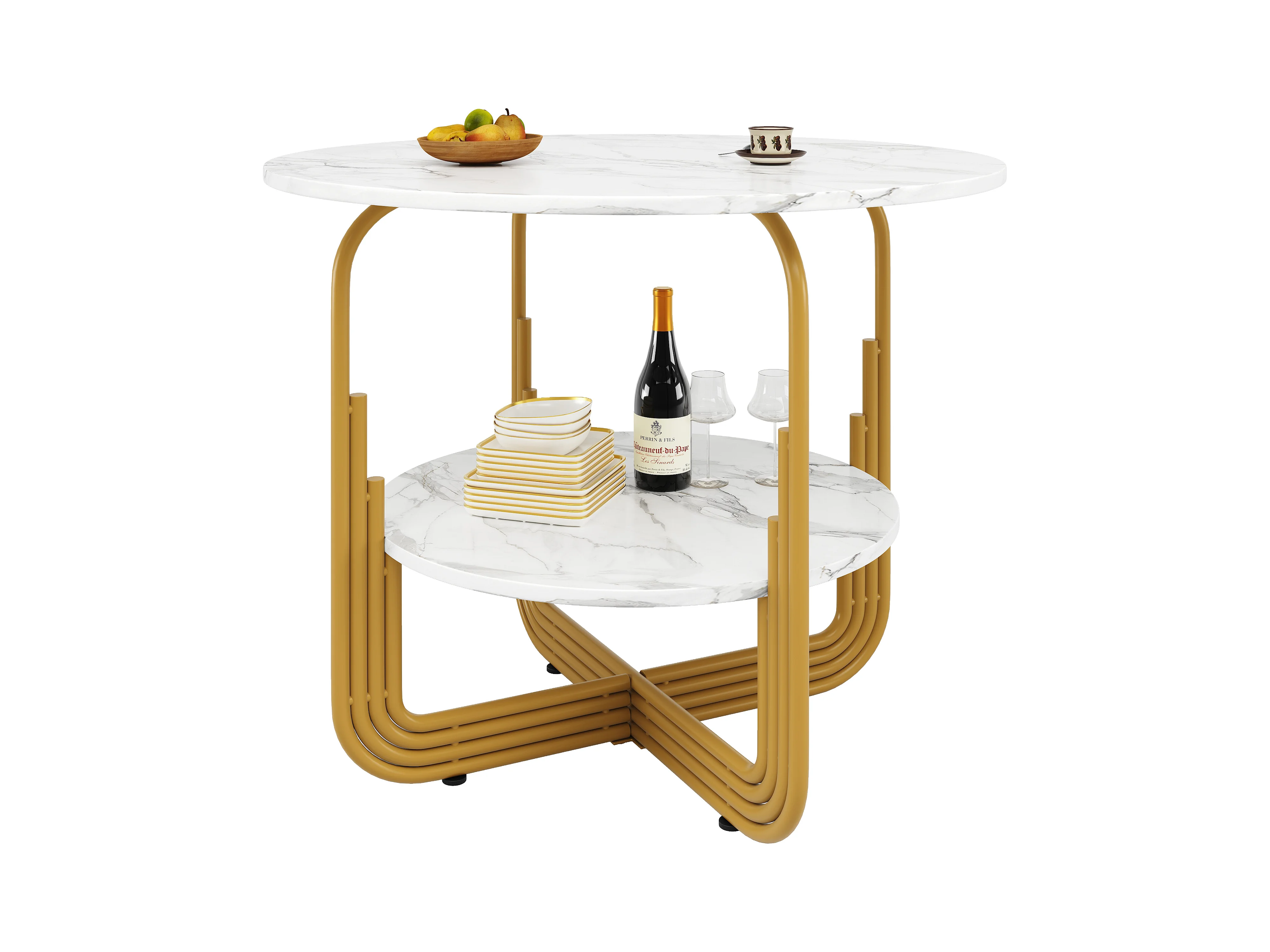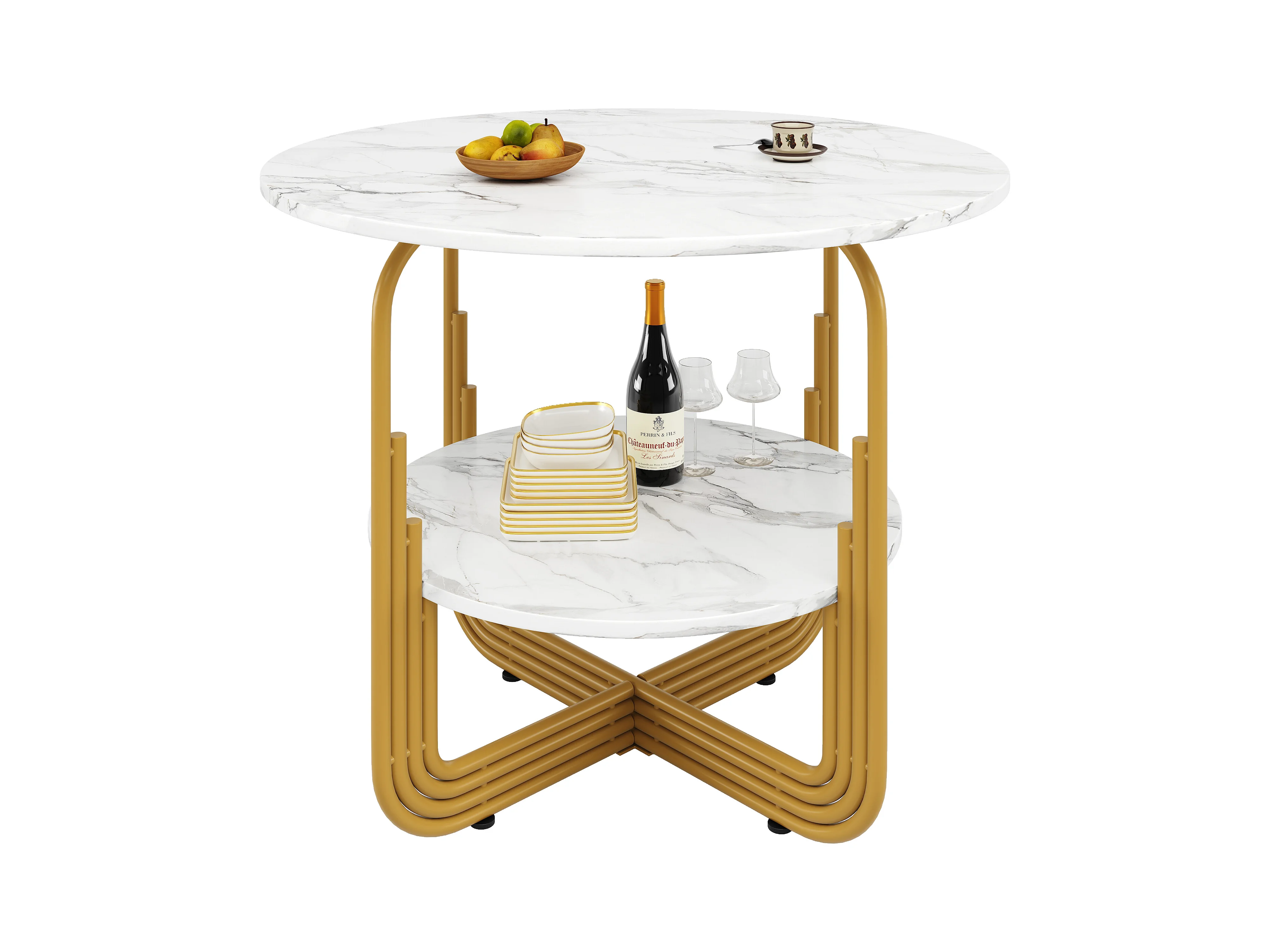 Table à manger ronde avec plateau en placage marbre blanc et 1 étagère de jambe, cadre en métal doré - 80x80x76cm