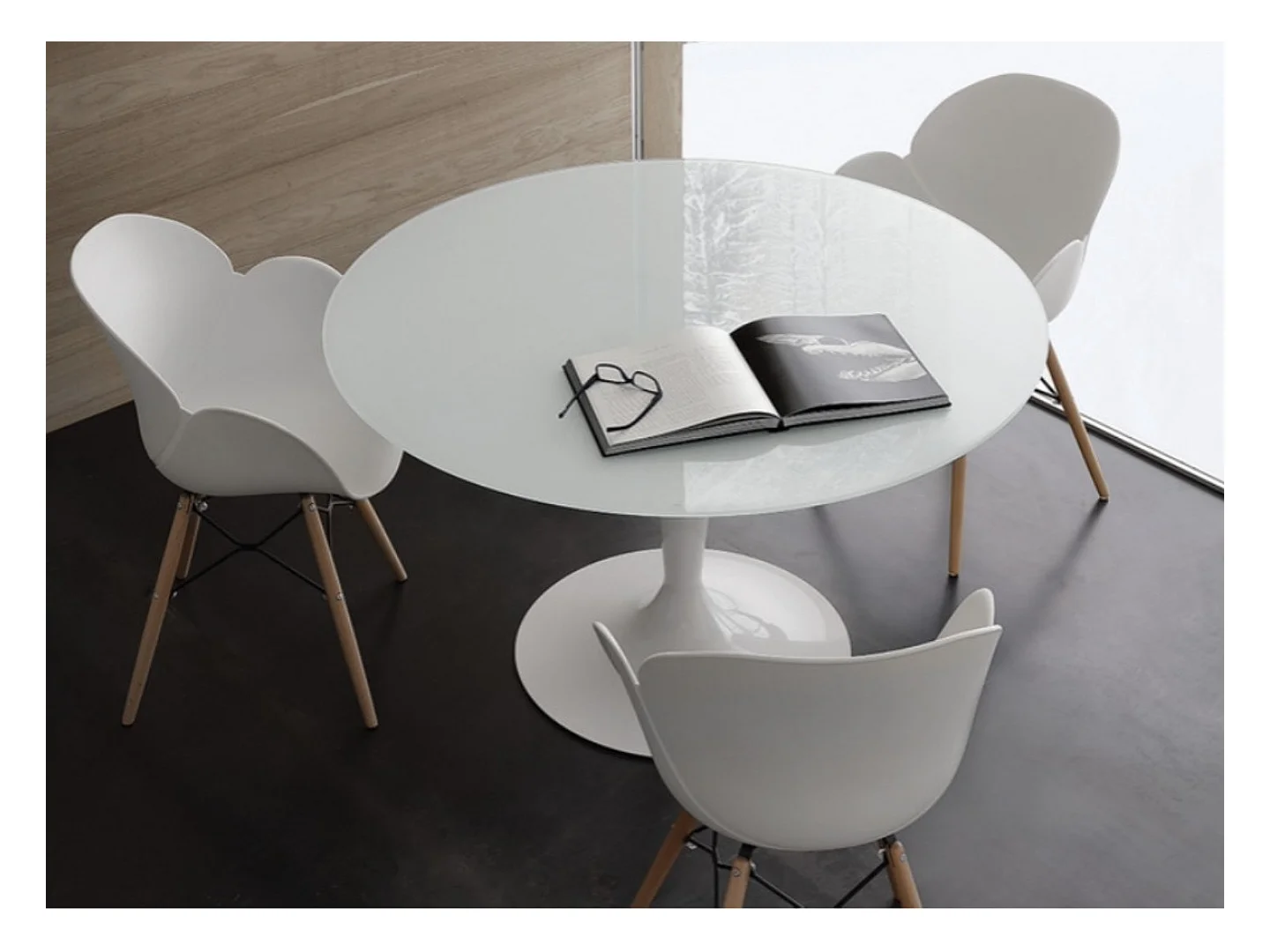 Table a manger ronde design verre teinté blanc et pied laqué blanc Kramanty 130cm