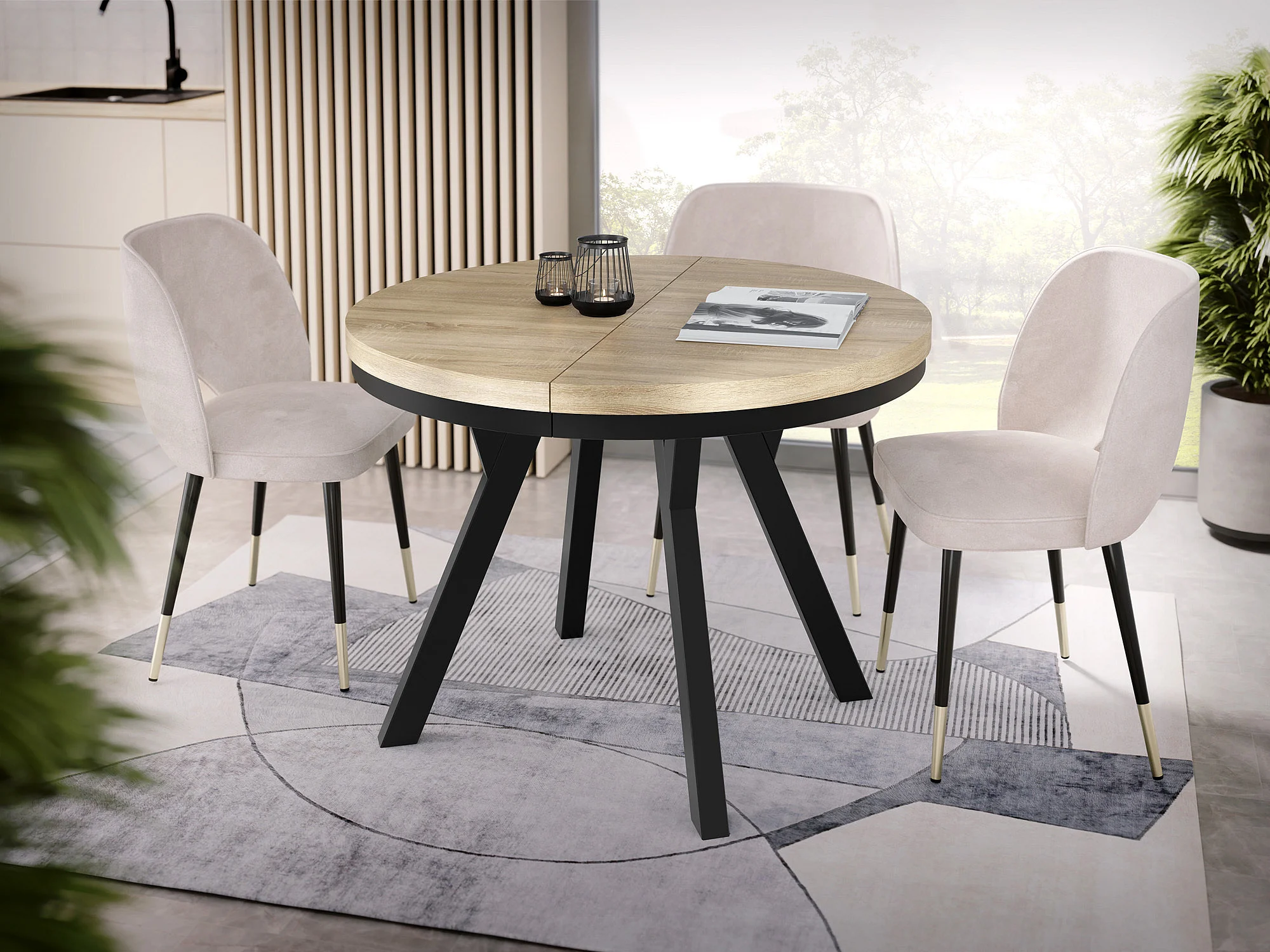Table à Manger Ronde Extensible Designer - Style Loft, Peu Encombrant - Pieds Noirs - 90 à 170 cm - Pour 4-8 personnes - Fabriqué en UE - Chêne Sonoma - 170 cm
