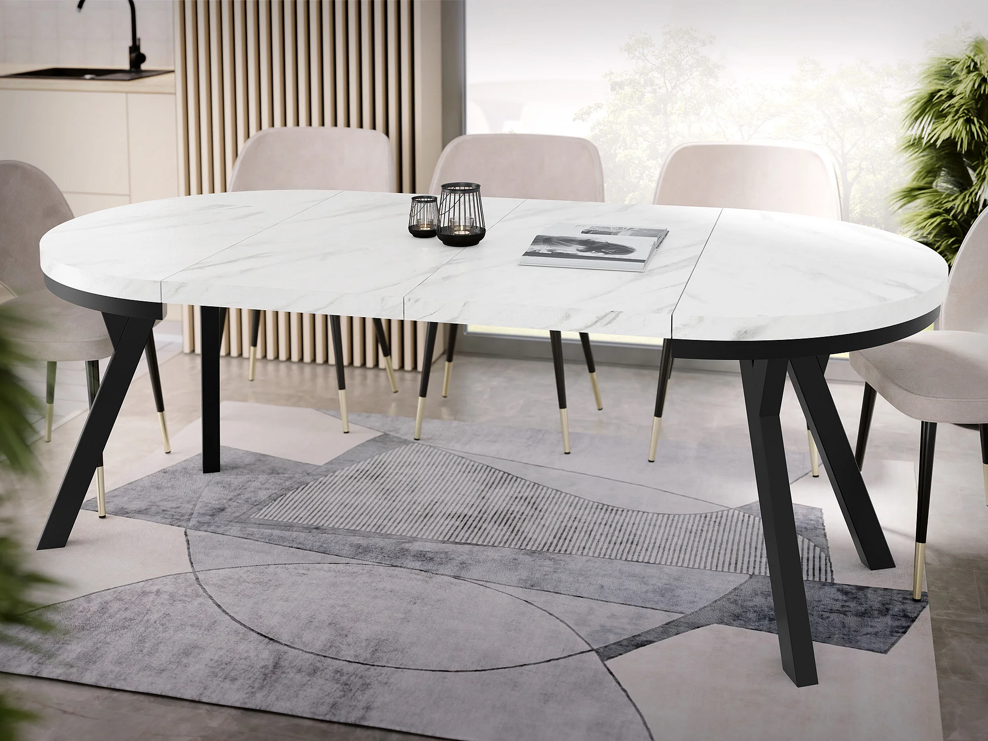 Table à Manger Ronde Extensible Designer - Style Loft, Peu Encombrant - Pieds Noirs - 90 à 170 cm - Pour 4-8 personnes - Fabriqué en UE - Marbre Blanc - 170 cm