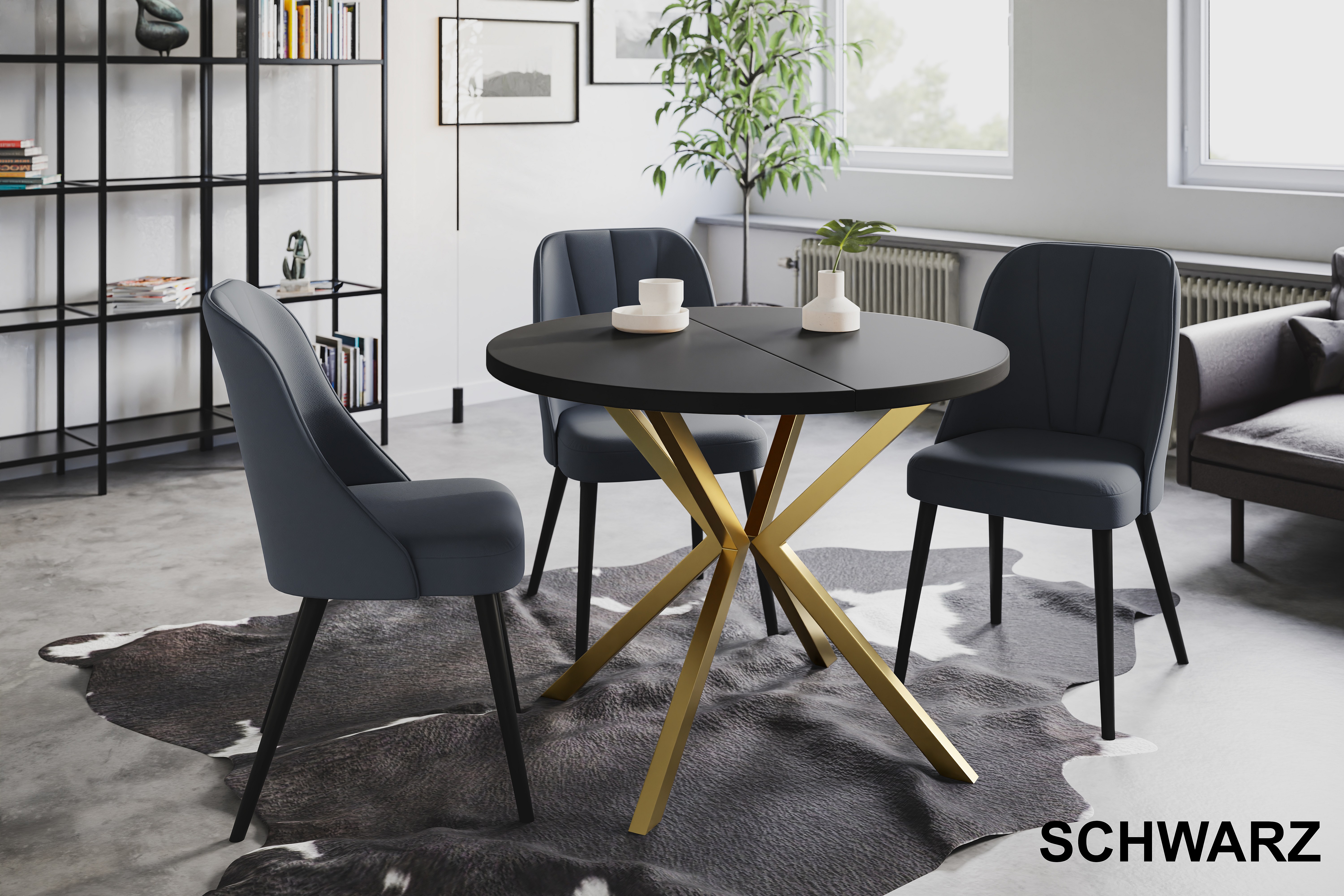 Table à manger ronde LITEN, table à rallonges Diamètre : 120 cm/200 cm, couleur de la table basse : noir, avec pieds métalliques couleur or