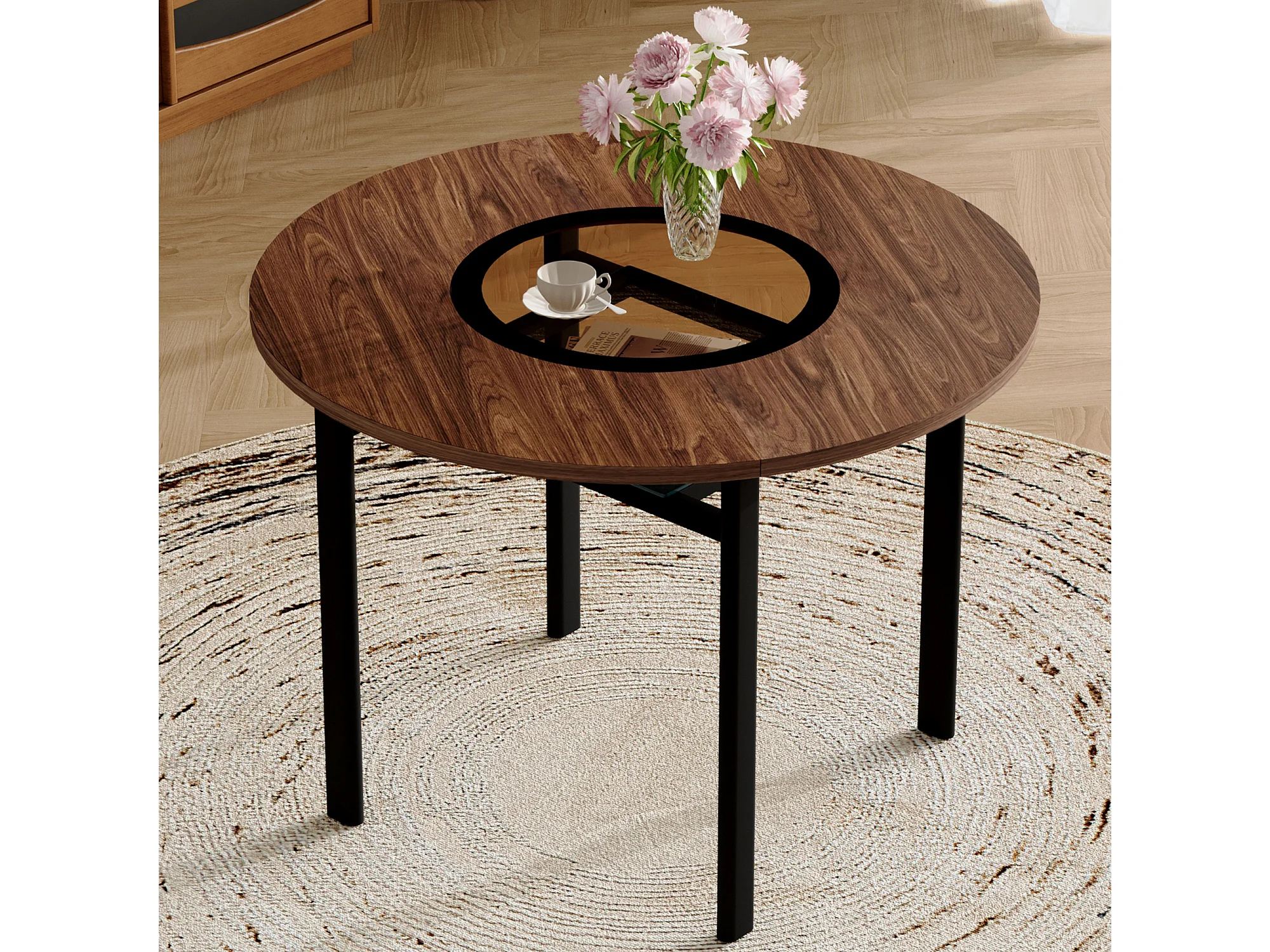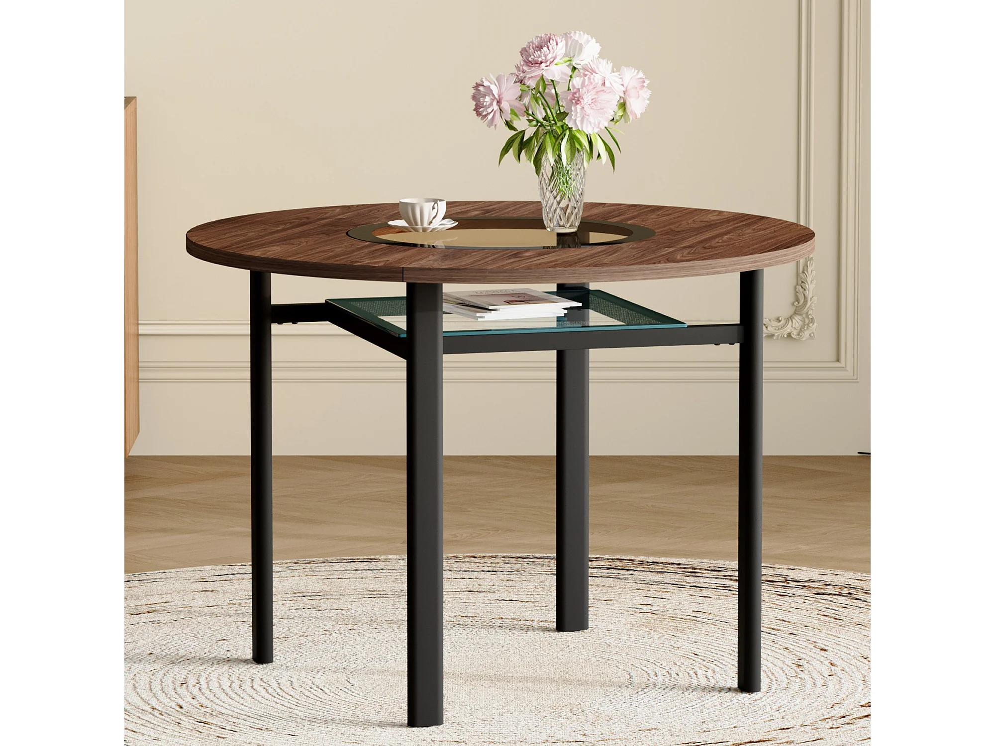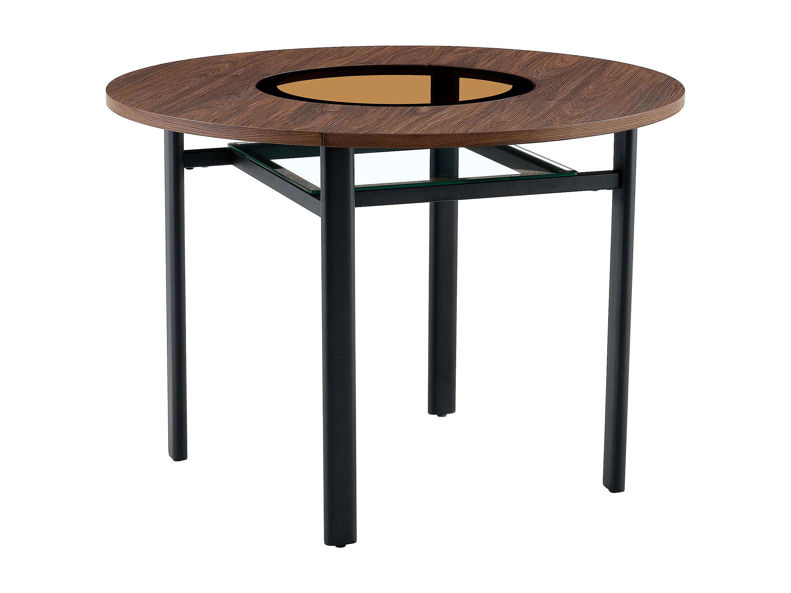 Table à manger ronde pour 2-4 personnes - Plateau en woodgrain marron - Verre + métal + bois MDF