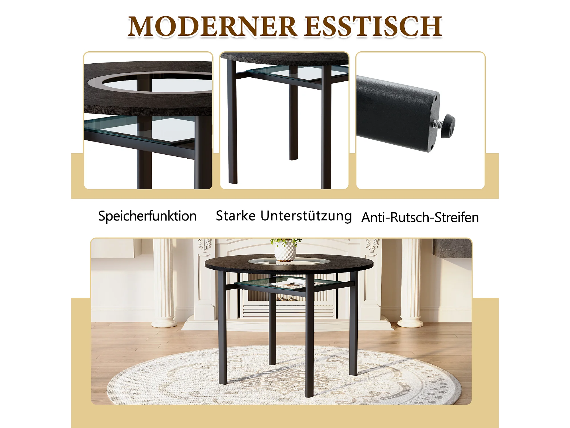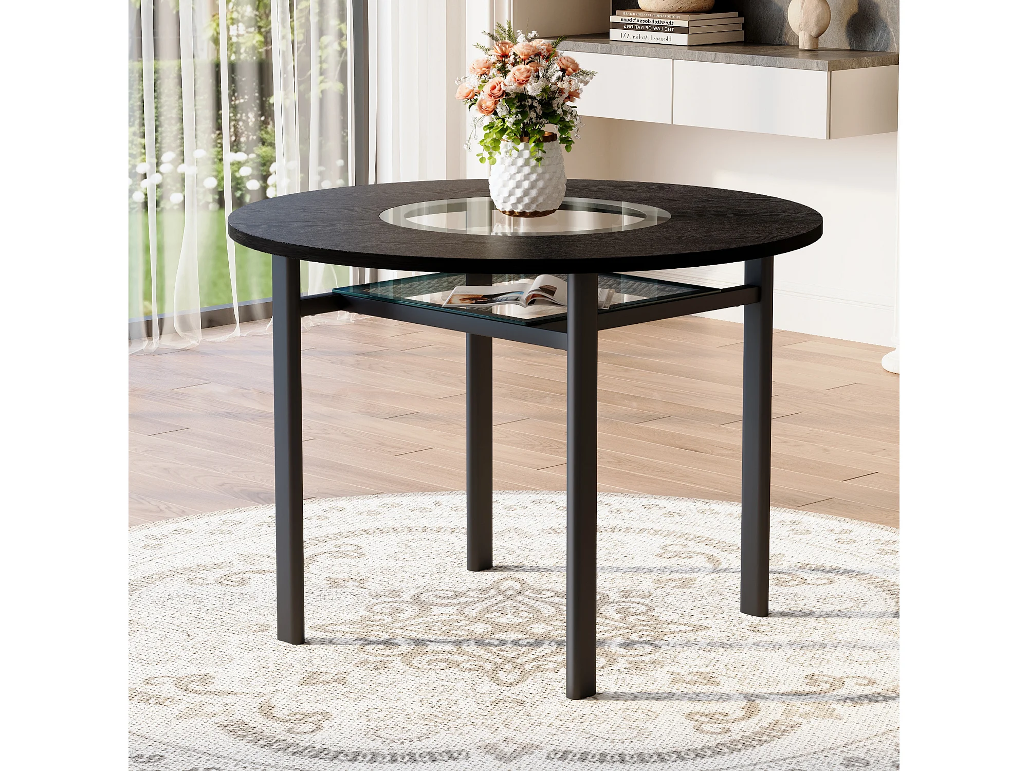 Table à manger ronde pour 2-4 personnes - Plateau en woodgrain noir - Verre + métal + bois MDF
