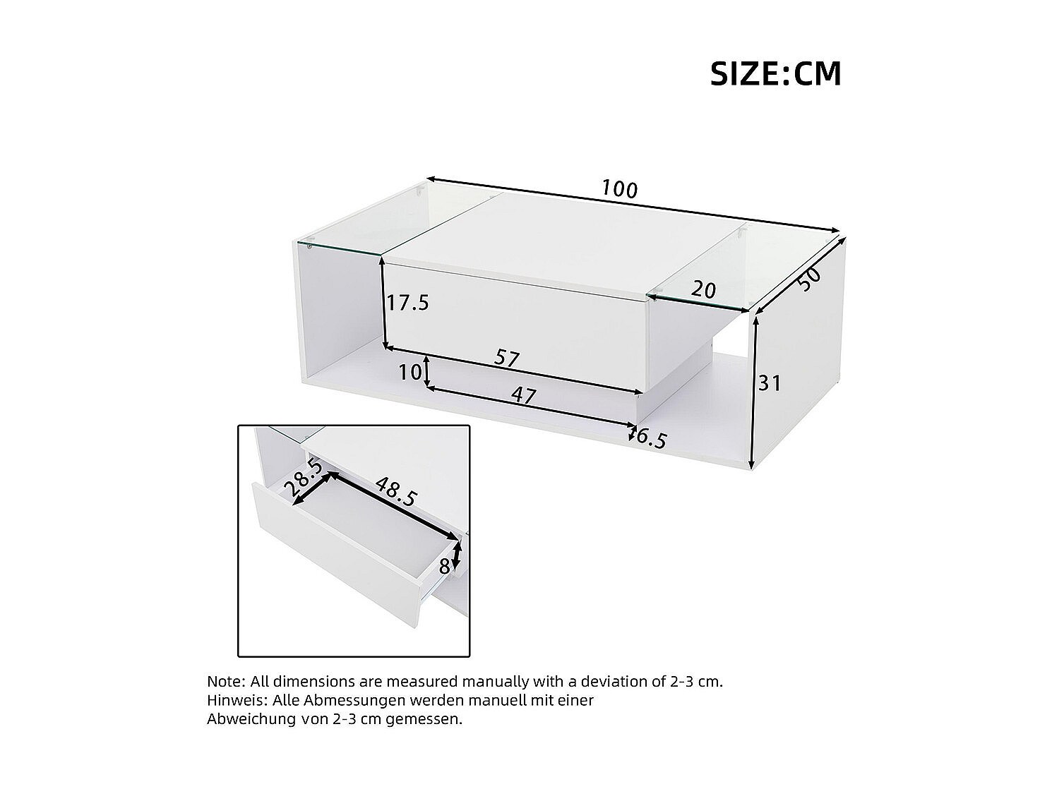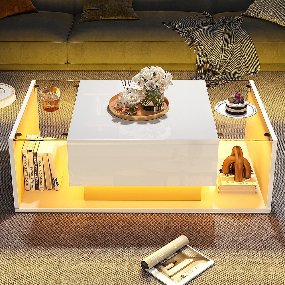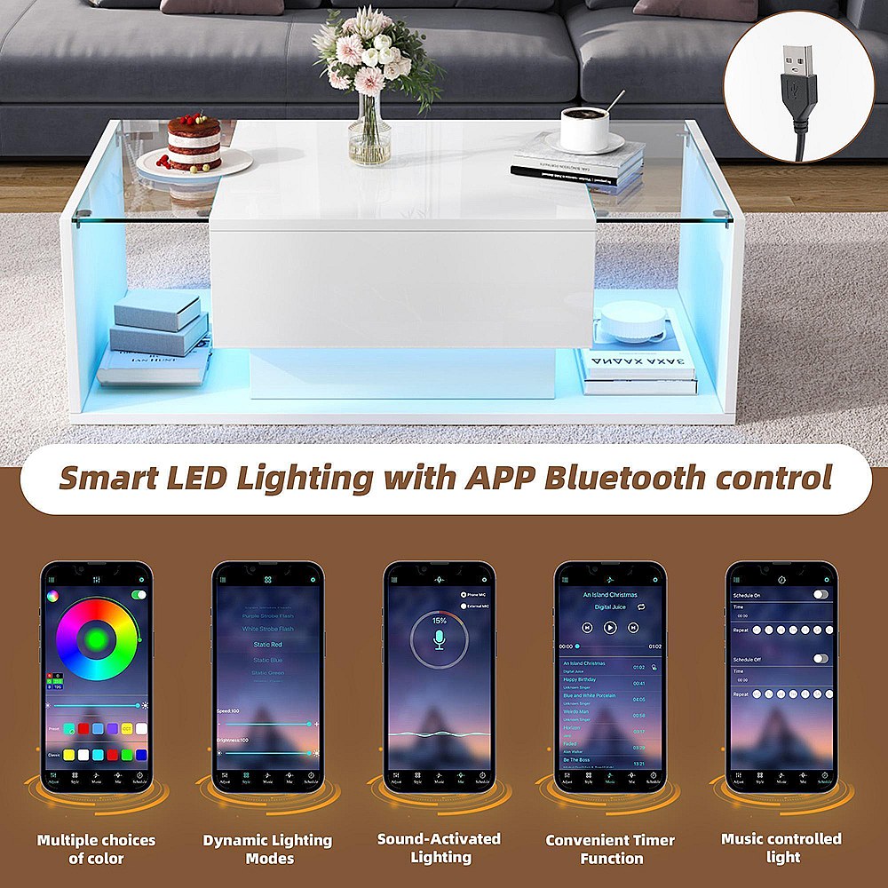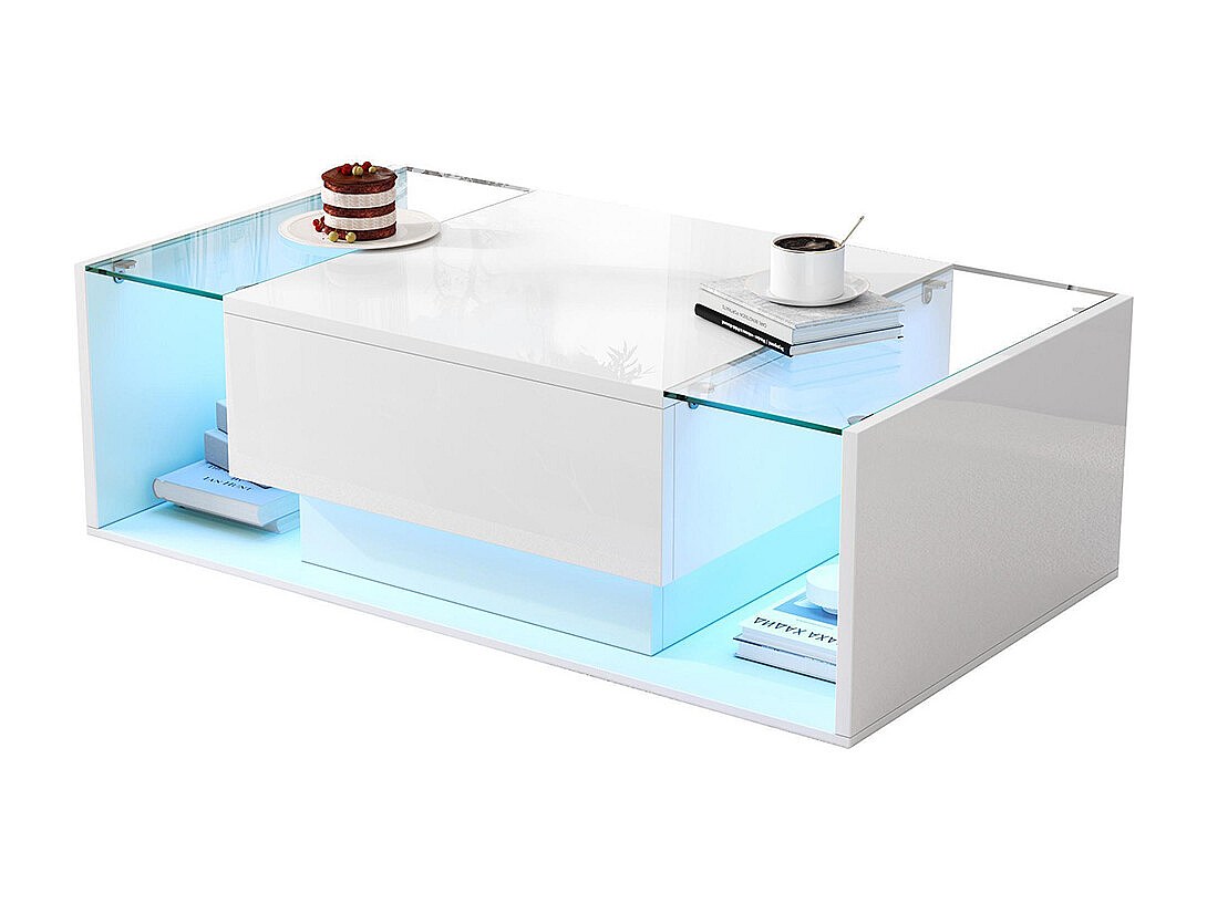Table basse 1 tiroir LED bande lumineuse verre trempé brillante design minimaliste blanc