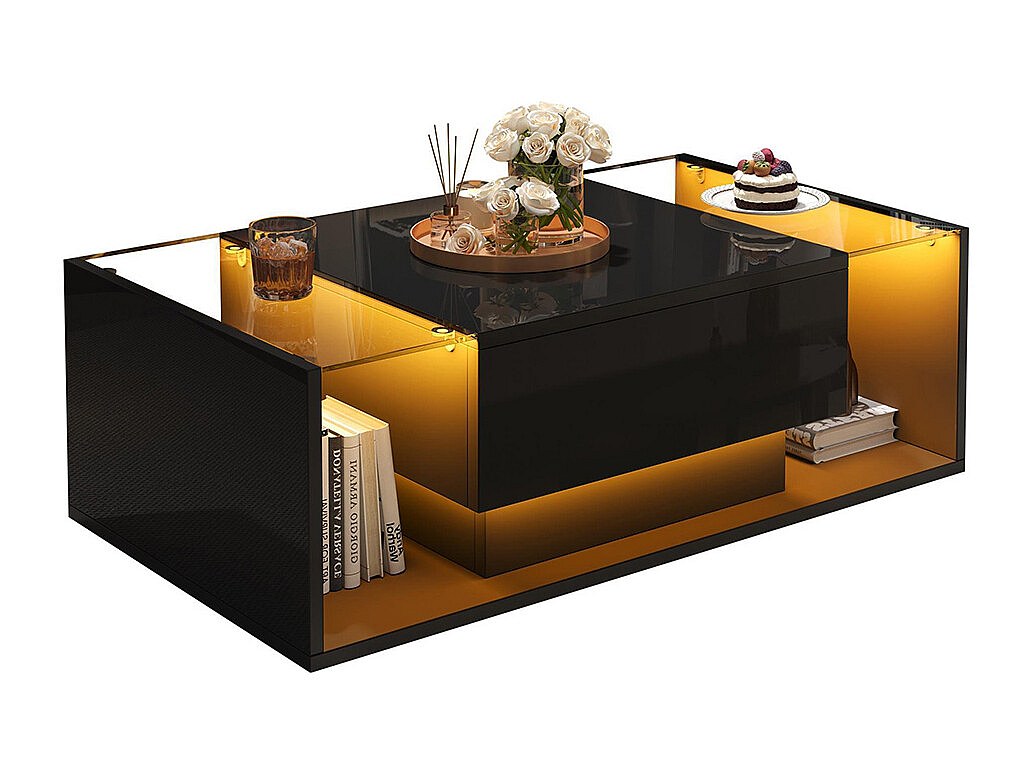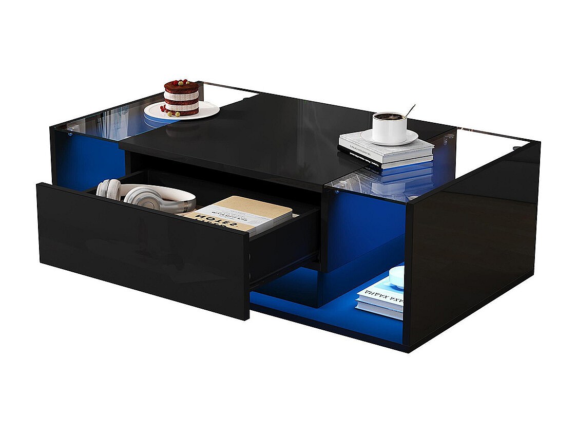 Table basse 100x50x35cm avec 2 tiroir et d'un compartiment semi-ouvert, LED, noir laqué