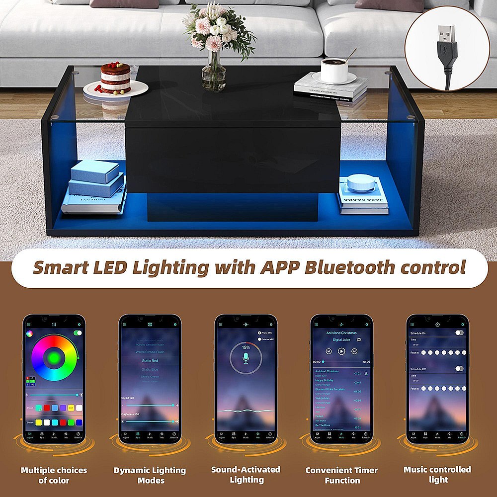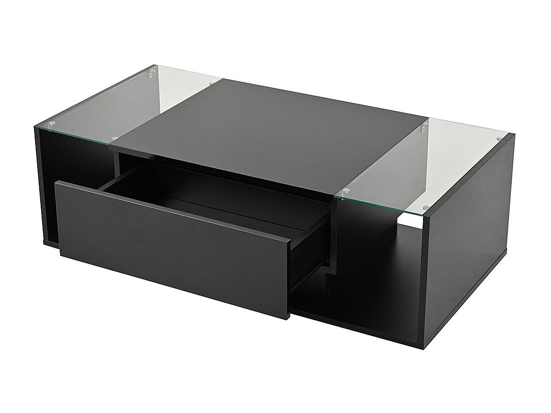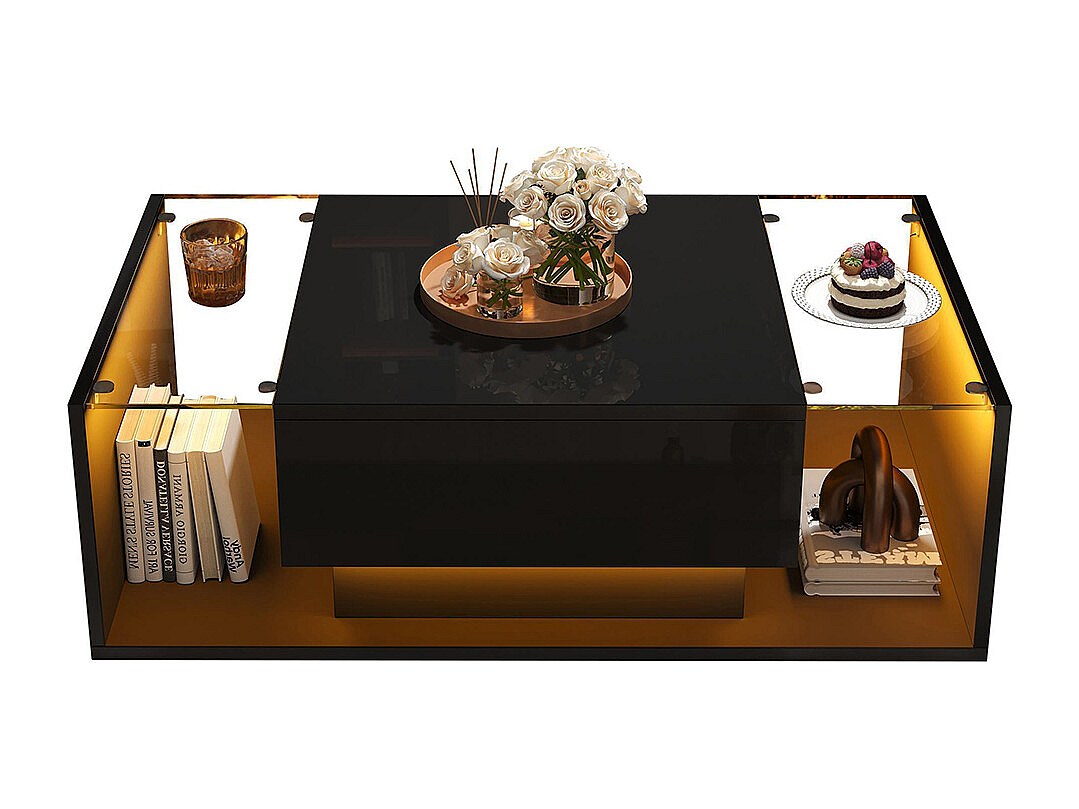 Table basse avec 1 tiroir, plateau en verre trempé, LED inclus, corps en noir laqué brillant