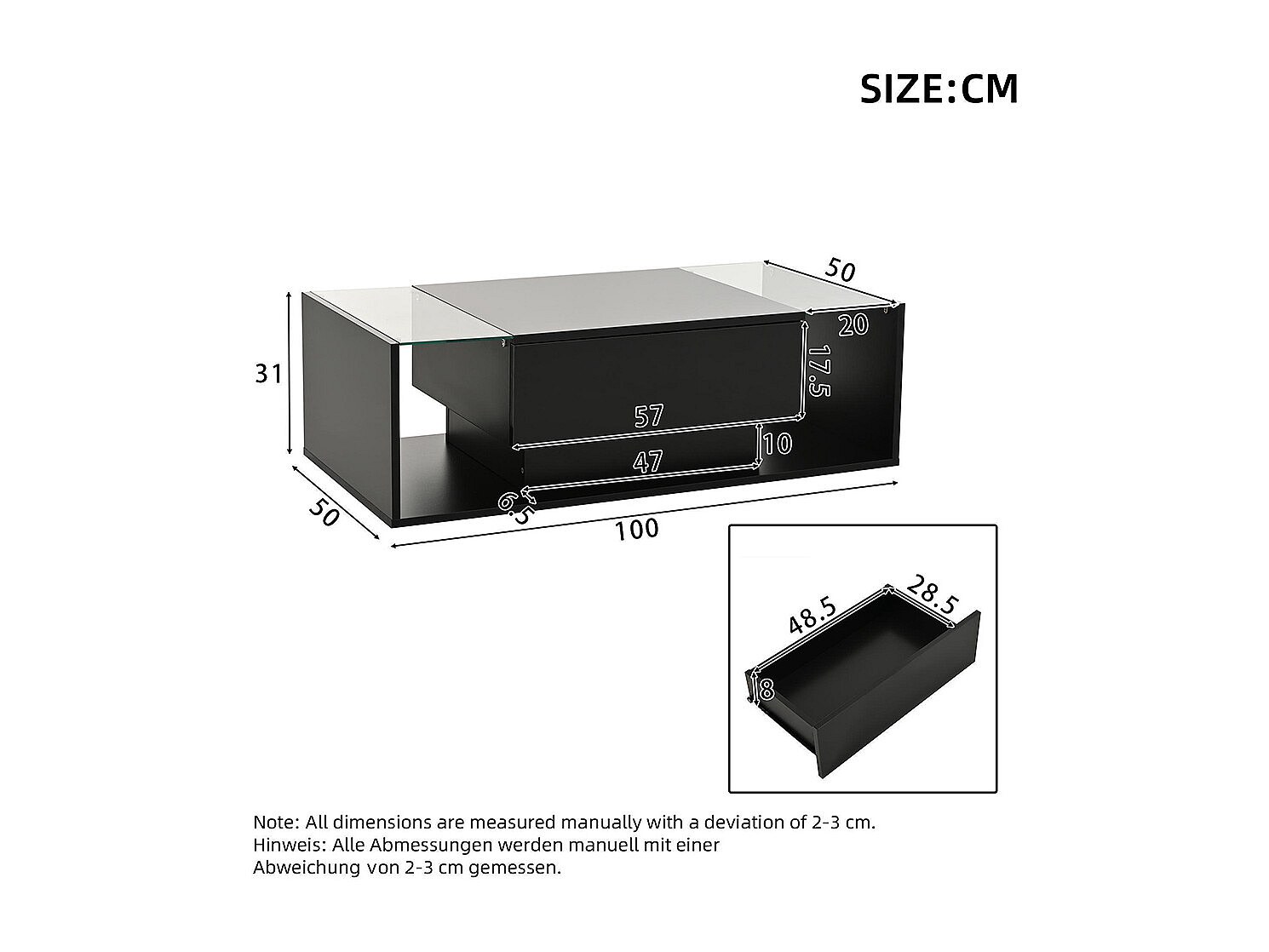 Table basse rectangle 100x50x35.5cm avec 2 tiroirs latéraux et plateau en verre, LED, noir