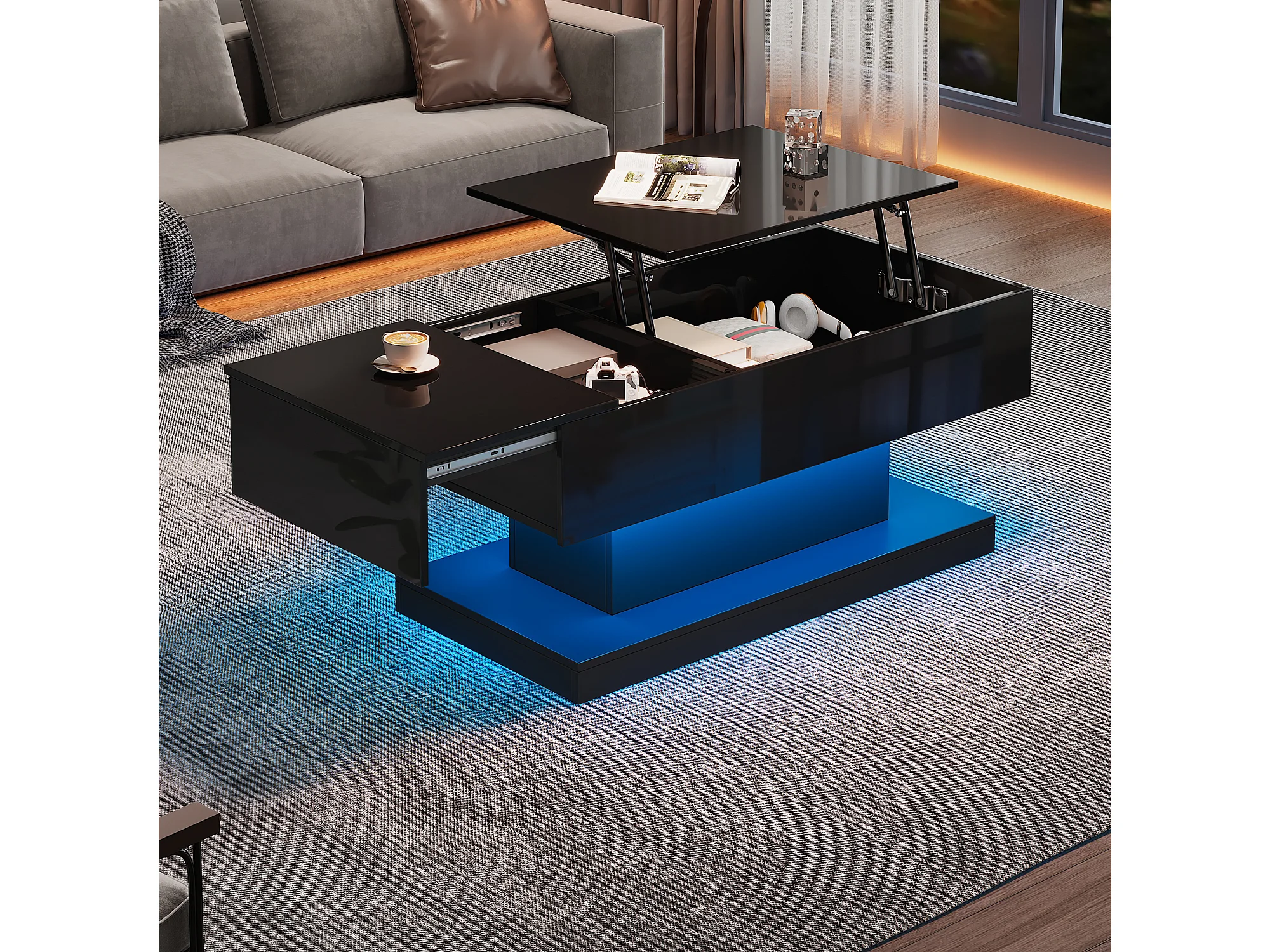 Table basse LED acrylique rangement intégré commande noir pour salon bureau