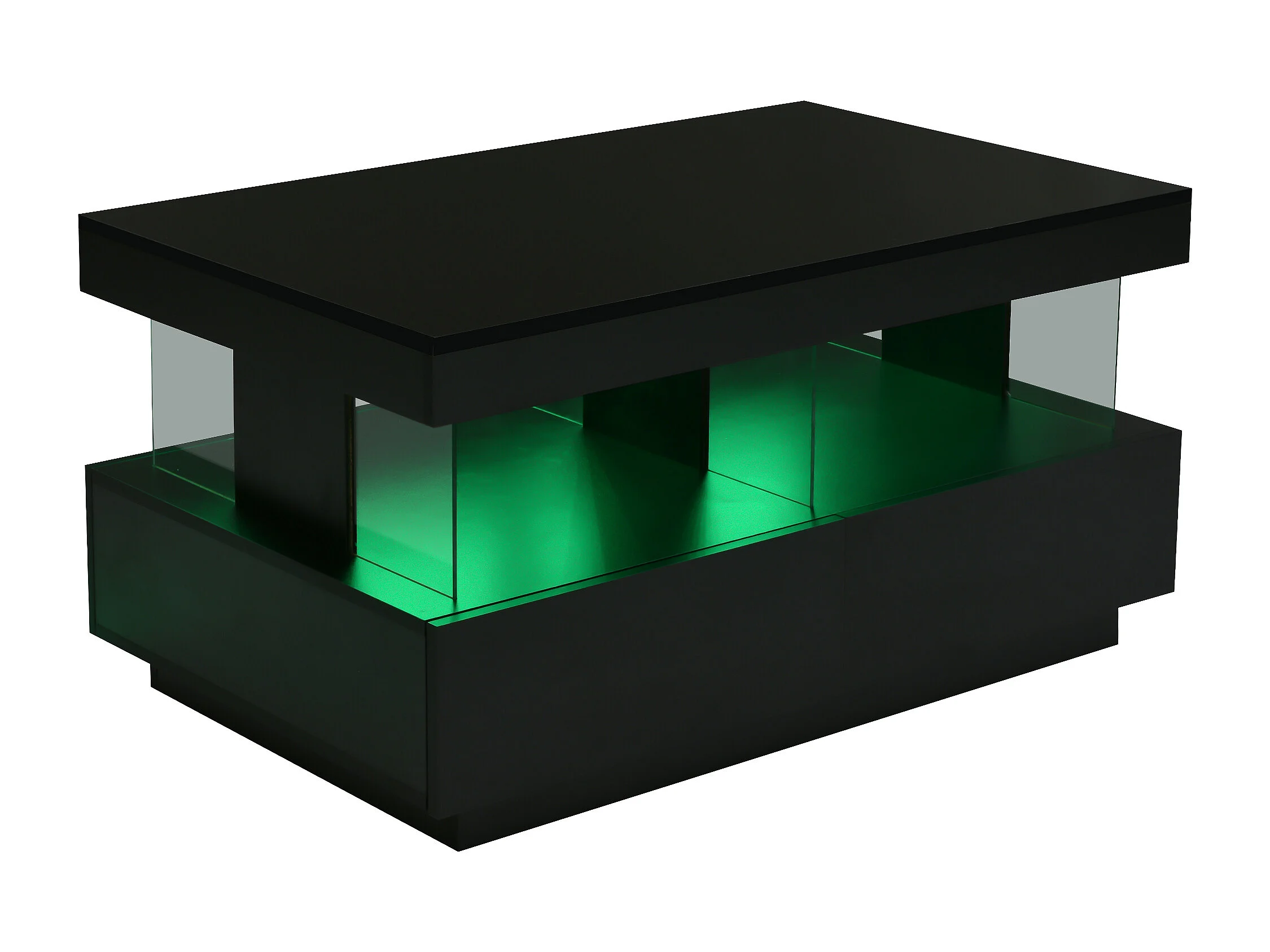 Table basse à deux niveaux LED RGB 16 couleurs surface brillant avec étagère ouverte et tiroir coulissant noir